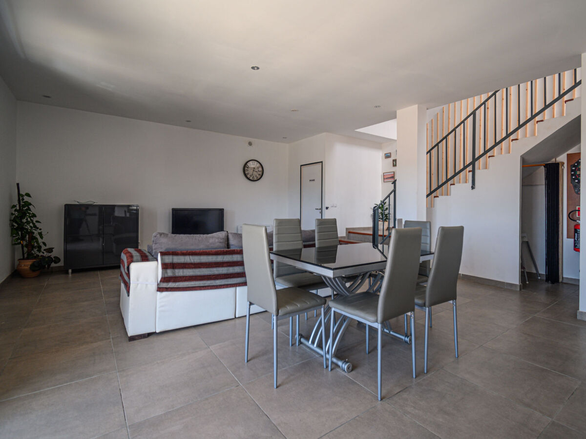 À l'étage inférieur: séjour/salle à manger ouvert avec TV (câblée) et chauffage électrique.