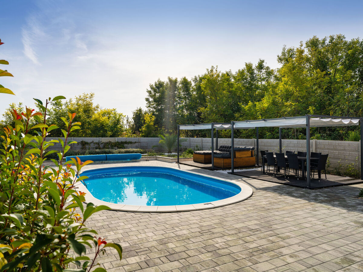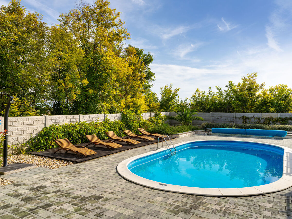 A usage privé: terrain 650 m2 (clôturé) avec plantes, piscine ronde, chauffée (9 x 4 m, 36 m2, profondeur 150 cm, disponibilité saisonnière: 01.Avr.