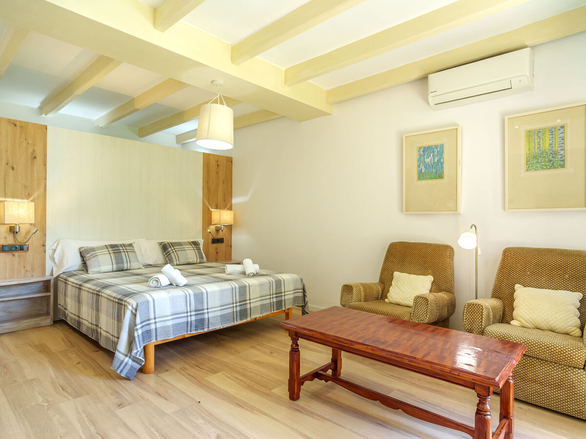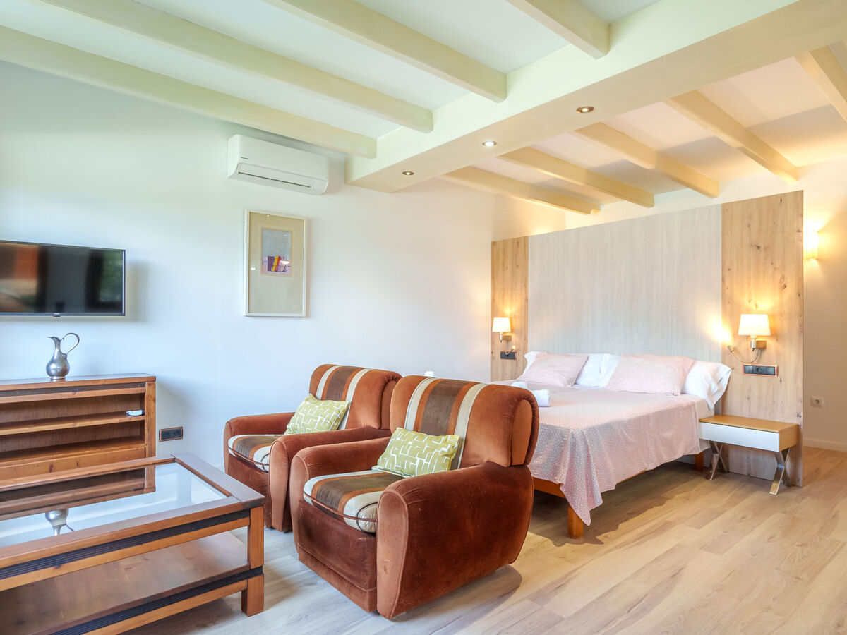 1 grande chambre double avec 1 grand-lit (180 cm, longueur 200 cm), bain/WC, lavabo, Télévision numérique, écran plat, air-conditionné et chauffage à air chaud.