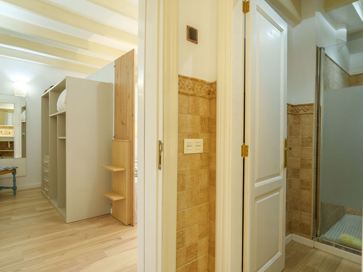 1 grande chambre double avec Dressing avec 1 grand-lit (180 cm, longueur 200 cm), lavabo, douche/WC, Télévision numérique, écran plat, air-conditionné et chauffage à air chaud.