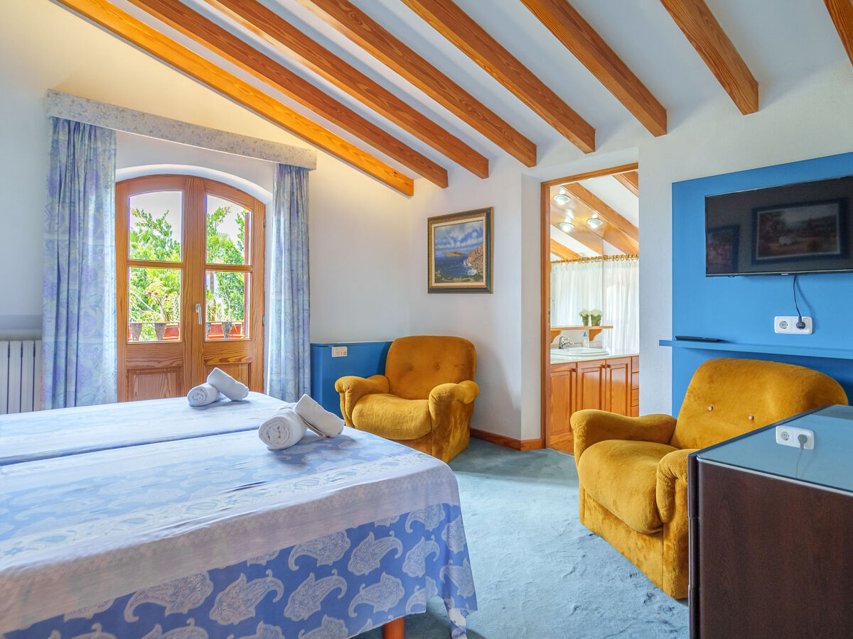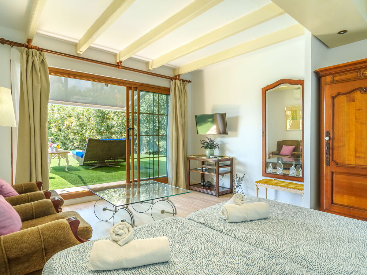 1 chambre double avec baie vitrée Dressing avec 2 lits (90 cm, longueur 200 cm), lavabo, douche/bidet/WC, Télévision numérique, écran plat, air-conditionné et chauffage à air chaud.