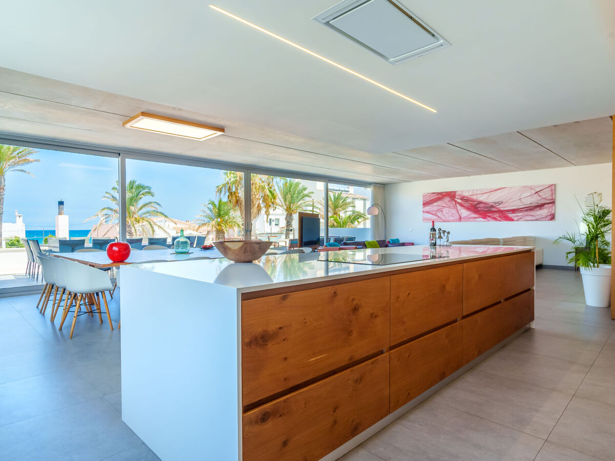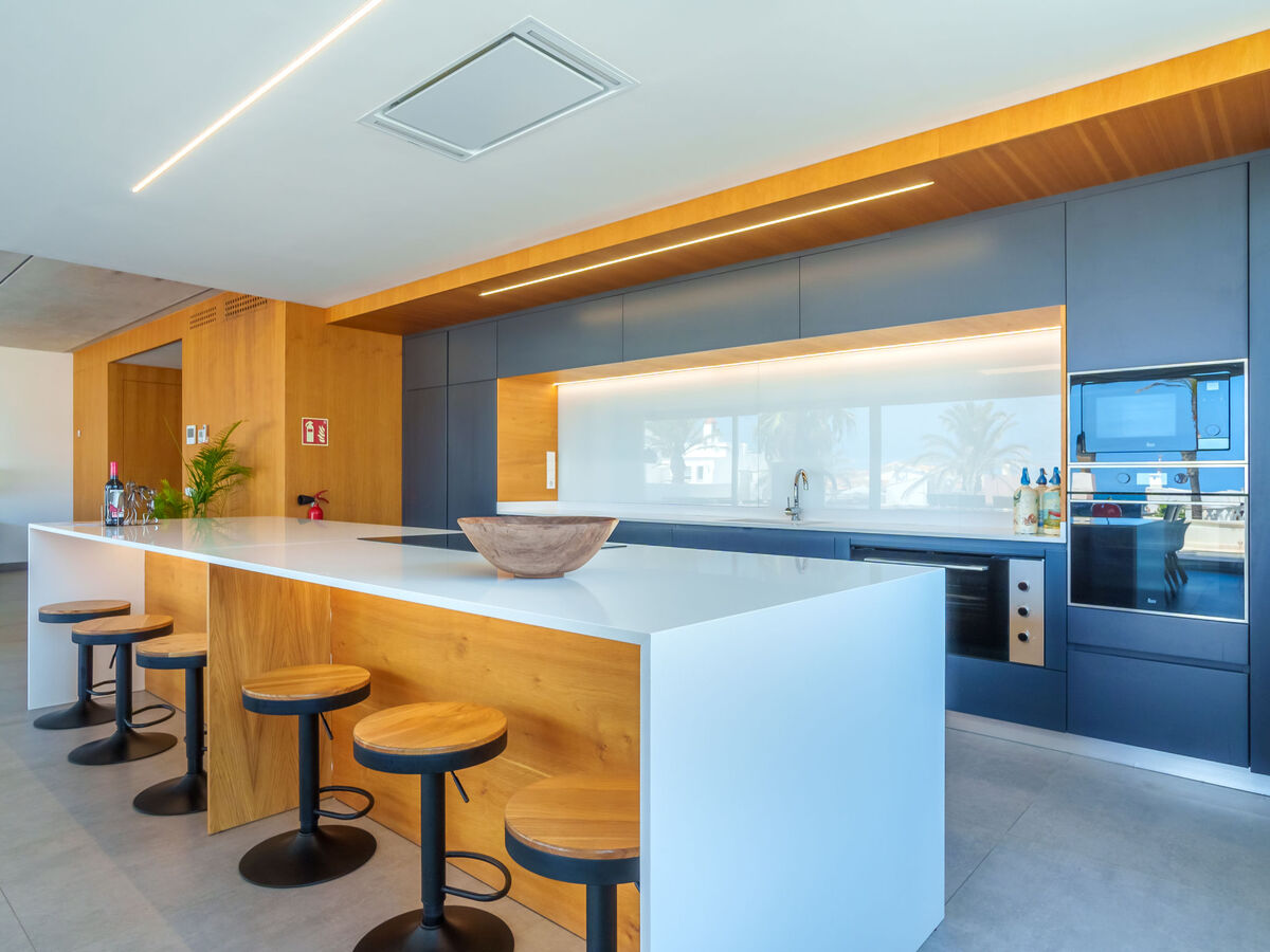 Cuisine/séjour (four, lave-vaisselle, 4 plaques vitrocéramiques, grille-pain, bouilloire électrique, micro-ondes, congélateur, cafetière électrique, ilot de cuisine) avec bar, air-conditionné et chauffage à air chaud.