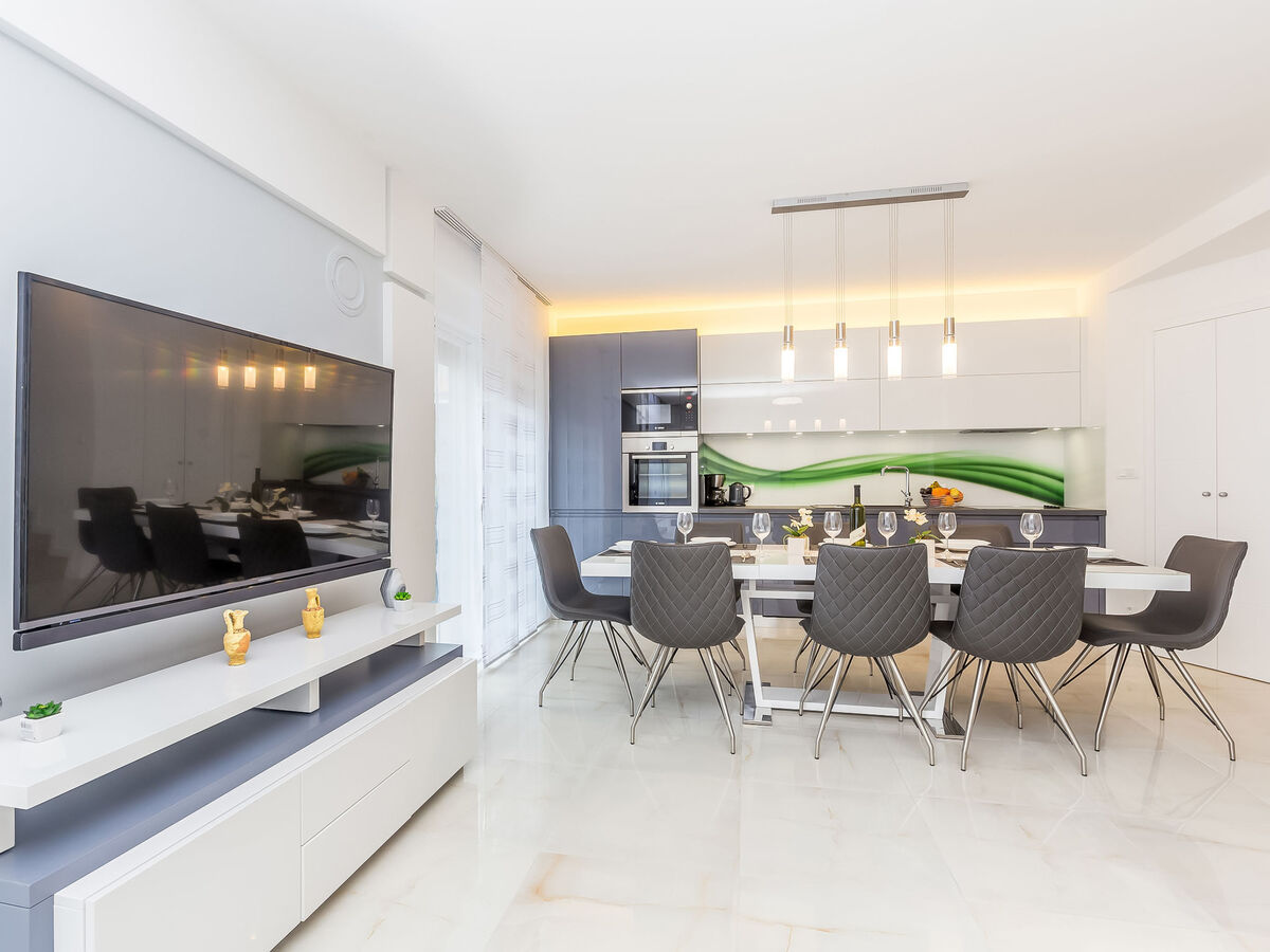 Aménagement moderne et de bon goût: séjour/salle à manger avec 1 divan-lit double (160 cm, longueur 200 cm), TV (satellite) et air-conditionné.