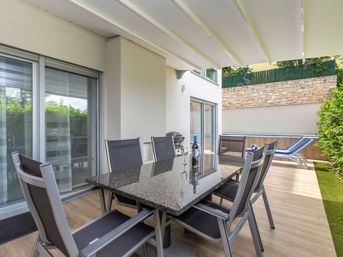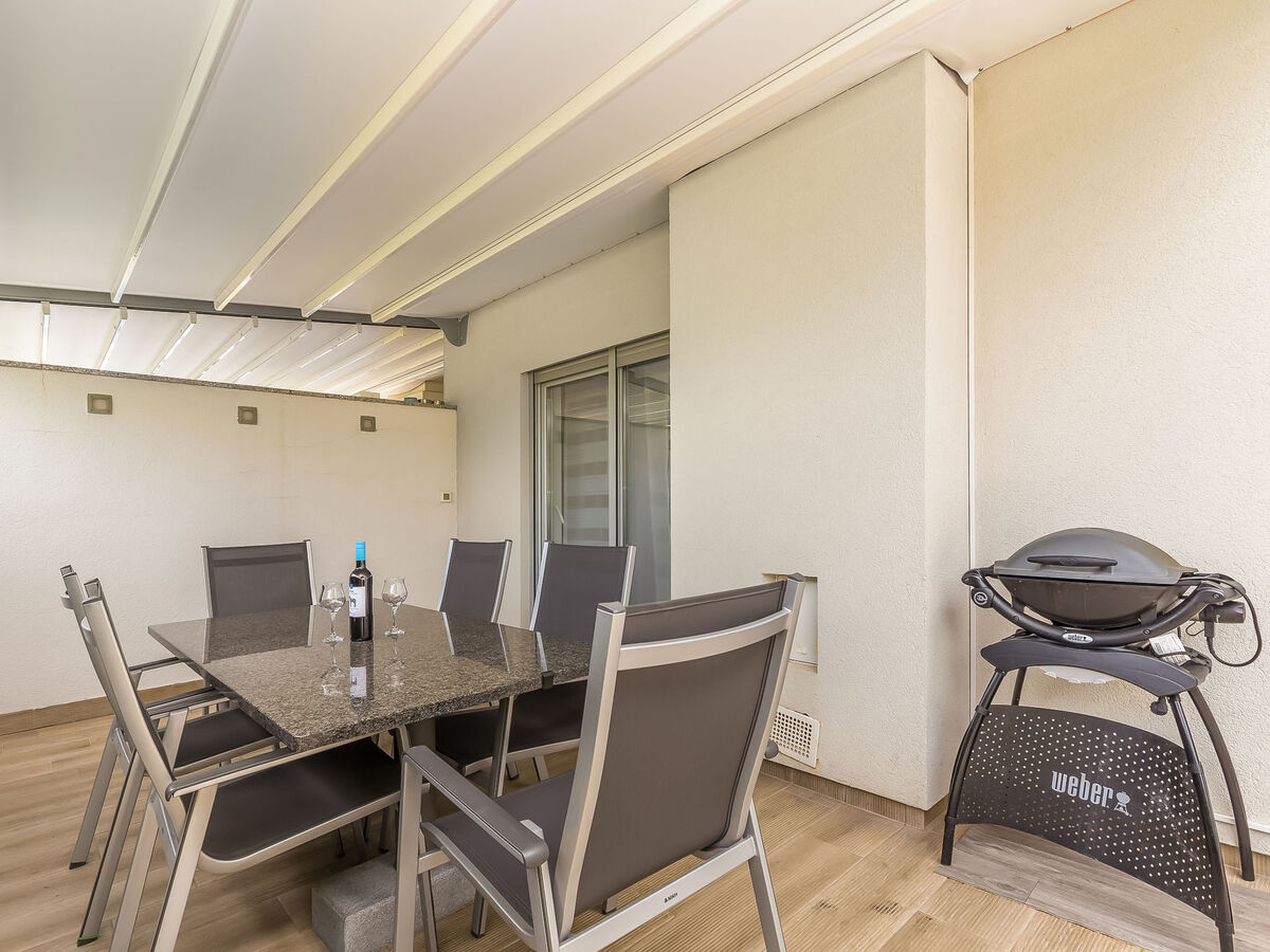 Meubles de terrasse, barbecue électrique (portable), chaises longues.