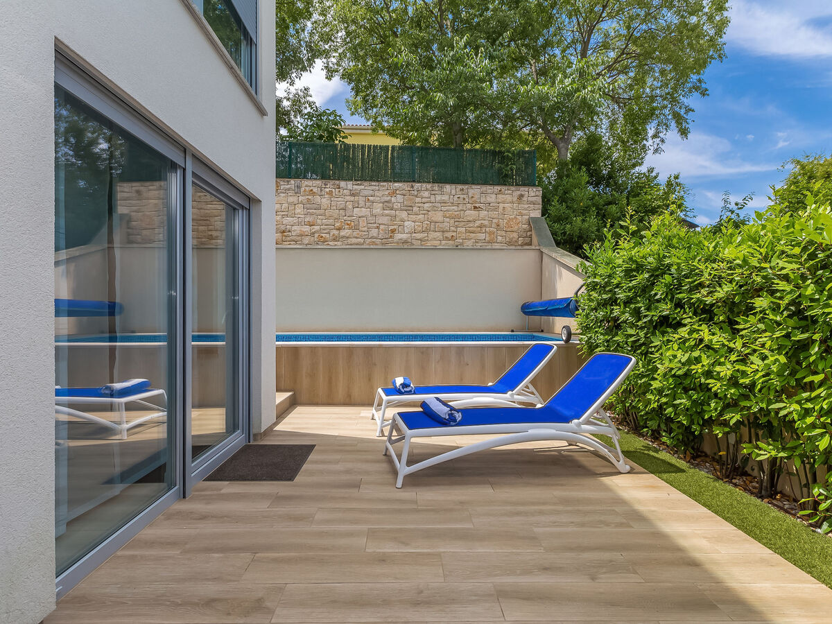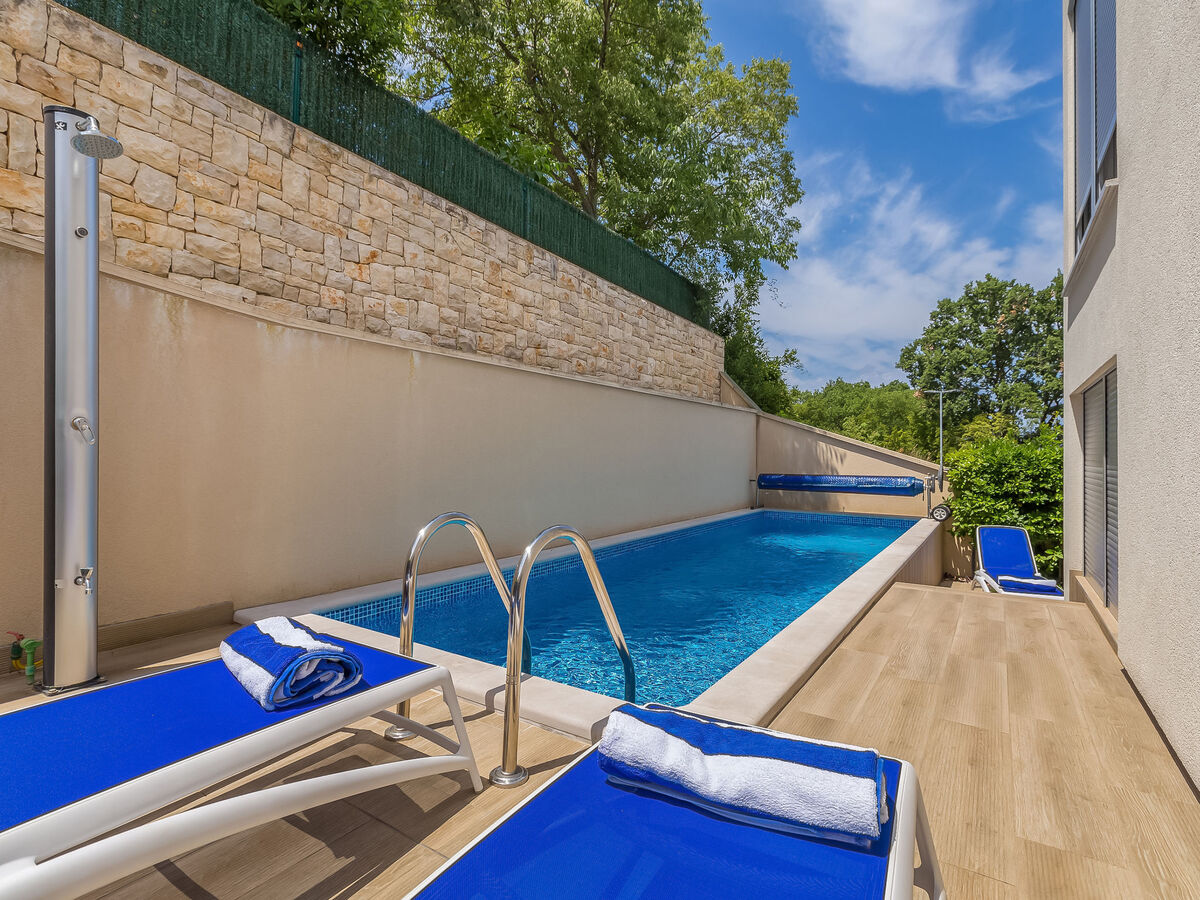 A usage privé: terrain 150 m2, piscine rectangulaire, chauffée (17 m2, profondeur 140 cm, disponibilité saisonnière: 01.Jan.