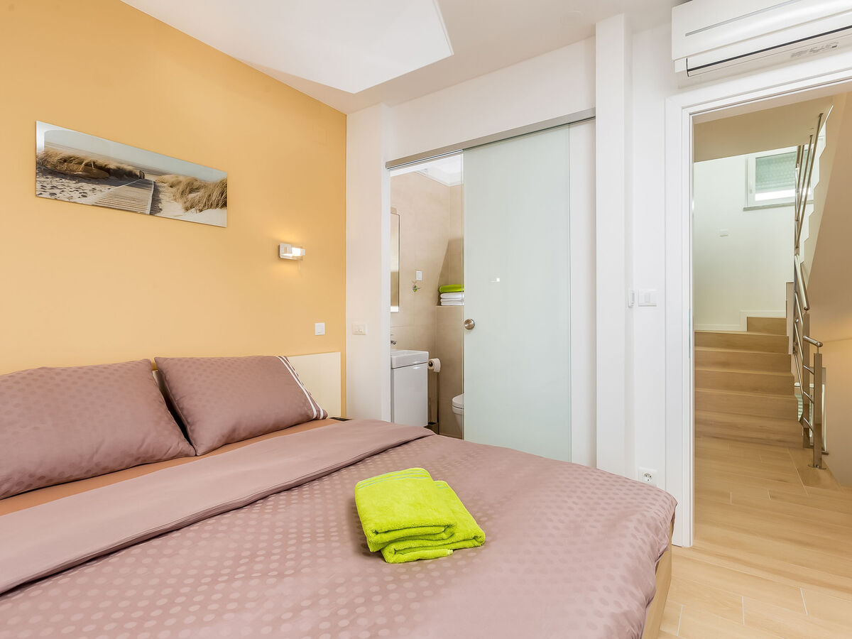 À l'étage supérieur: 1 chambre avec 1 lit double (160 cm, longueur 200 cm), douche/WC et air-conditionné.