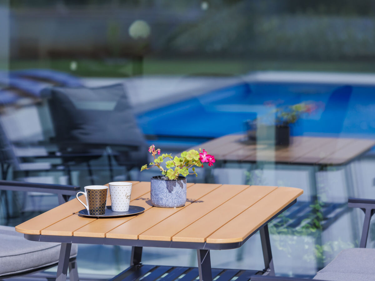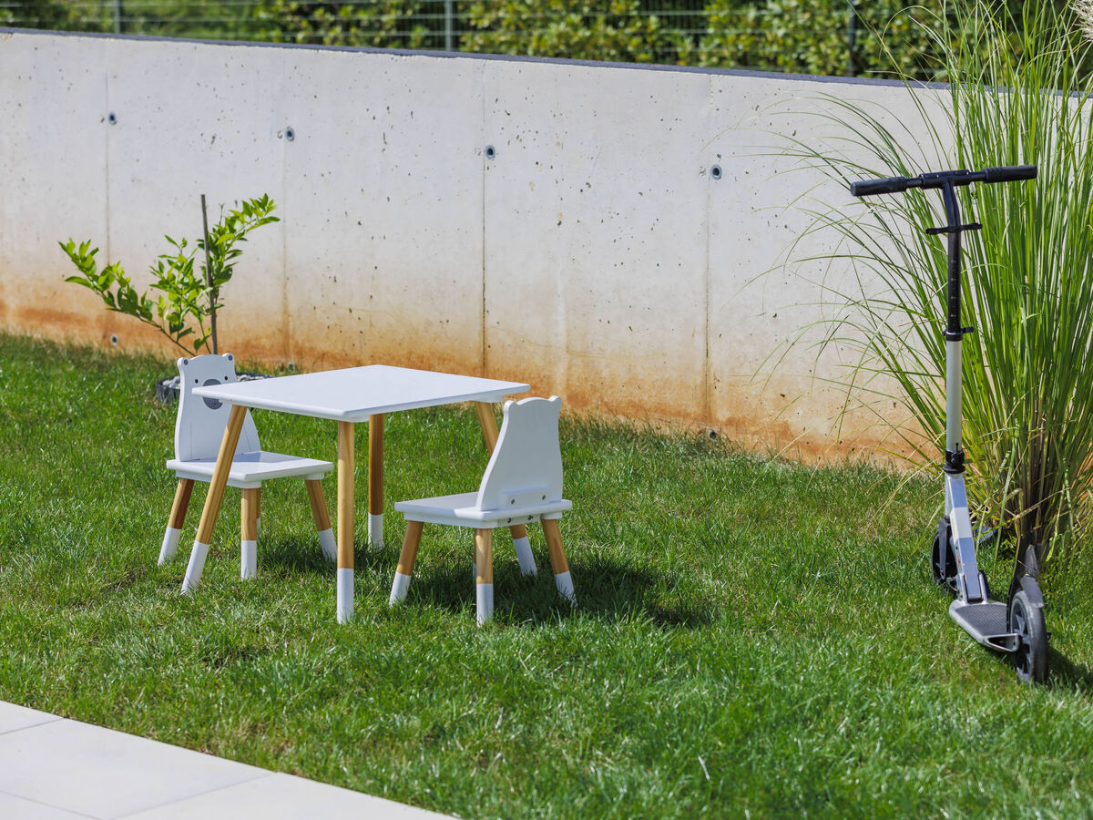 A usage privé: terrain 600 m2 (clôturé), jardin, piscine rectangulaire (8 x 4 m, profondeur 140 cm, disponibilité saisonnière: 01.Mai.