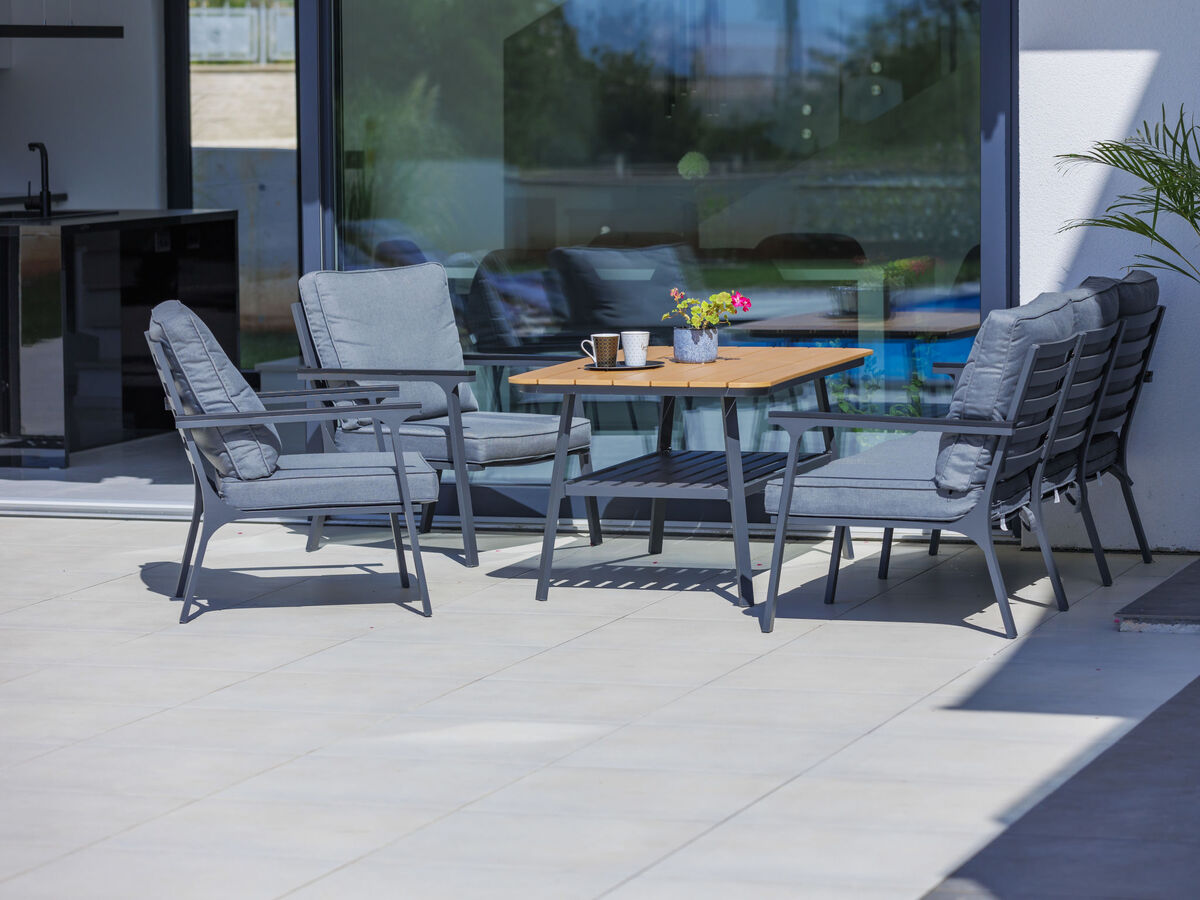 Meubles de terrasse, barbecue (portable), chaises longues.