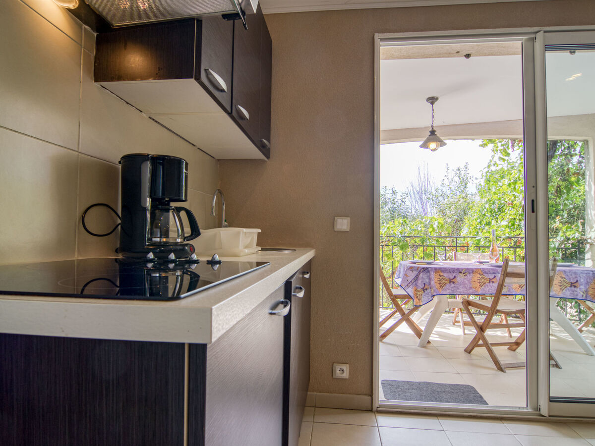 Cuisine ouverte (4 plaques vitrocéramiques, bouilloire électrique, micro-ondes, cafetière électrique, Capsules pour machine à café (Nespresso) (NON INCLUSES)) avec petite table pour les repas.