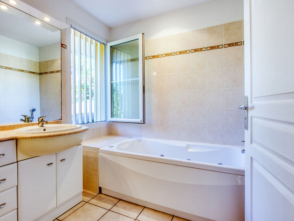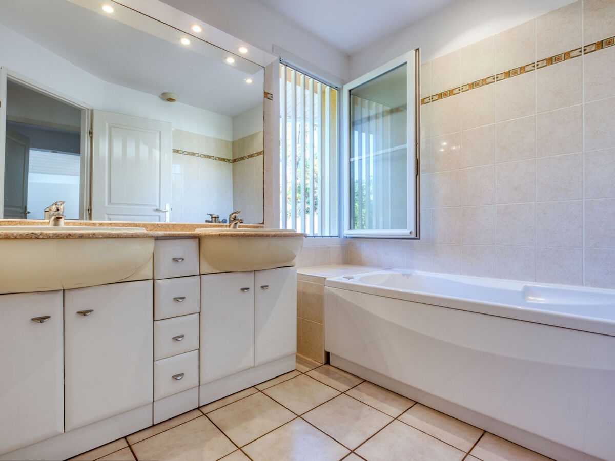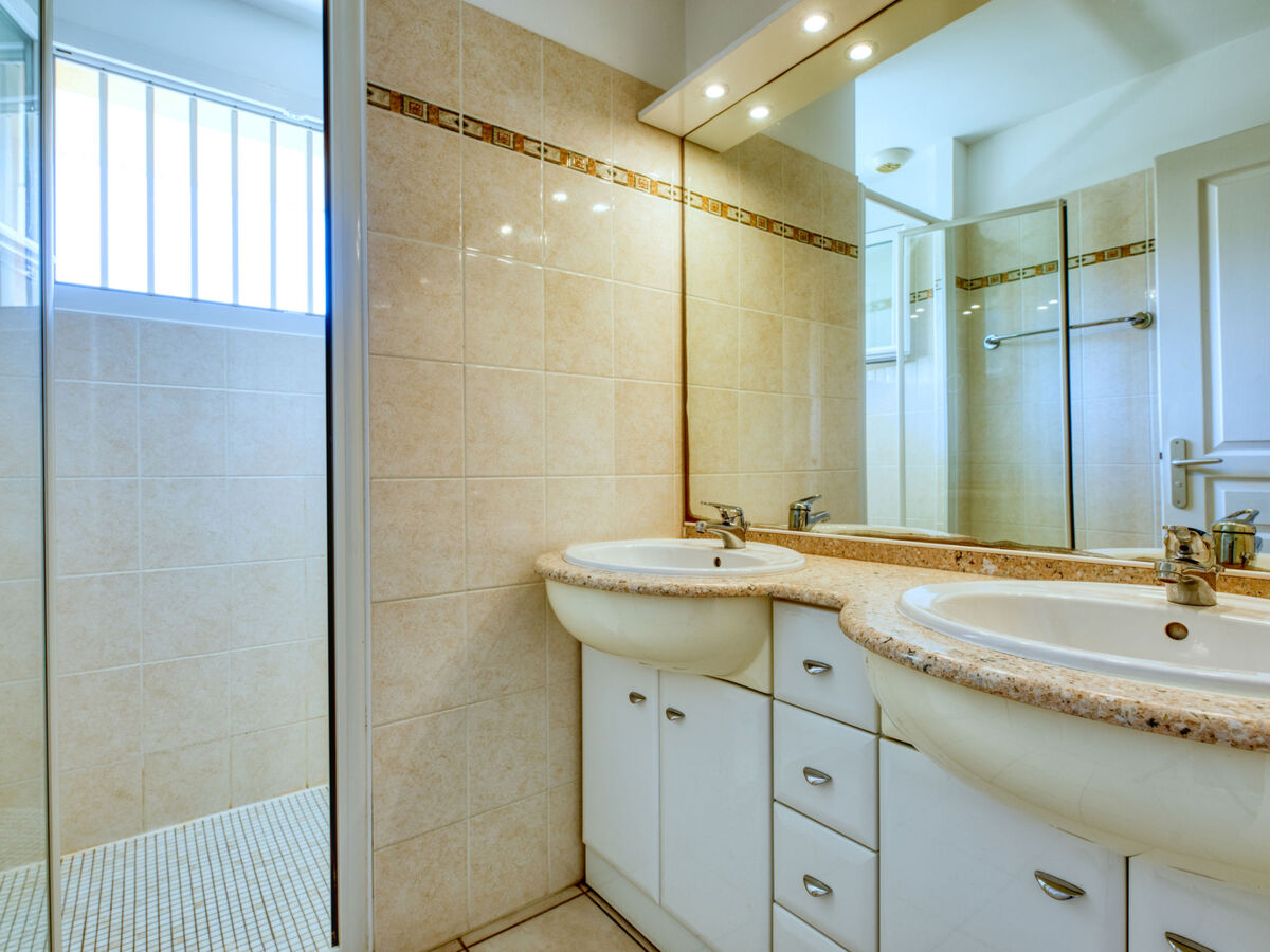 Sortie sur la terrasse avec salle de bains, WC séparés et double vasque.