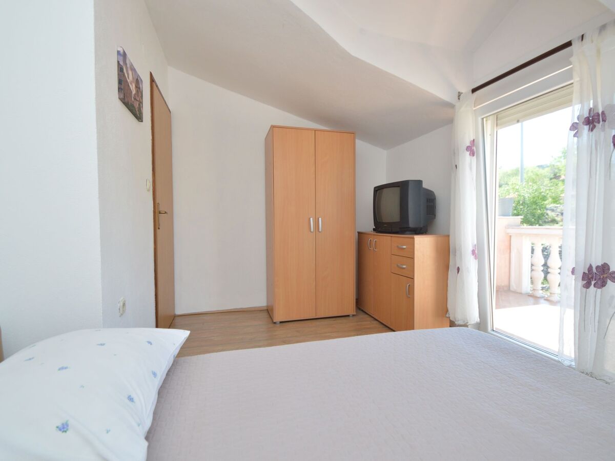 1 chambre, mansardée hauteur plafond 180 - 250 cm avec 1 grand-lit (150 cm, longueur 200 cm), TV.