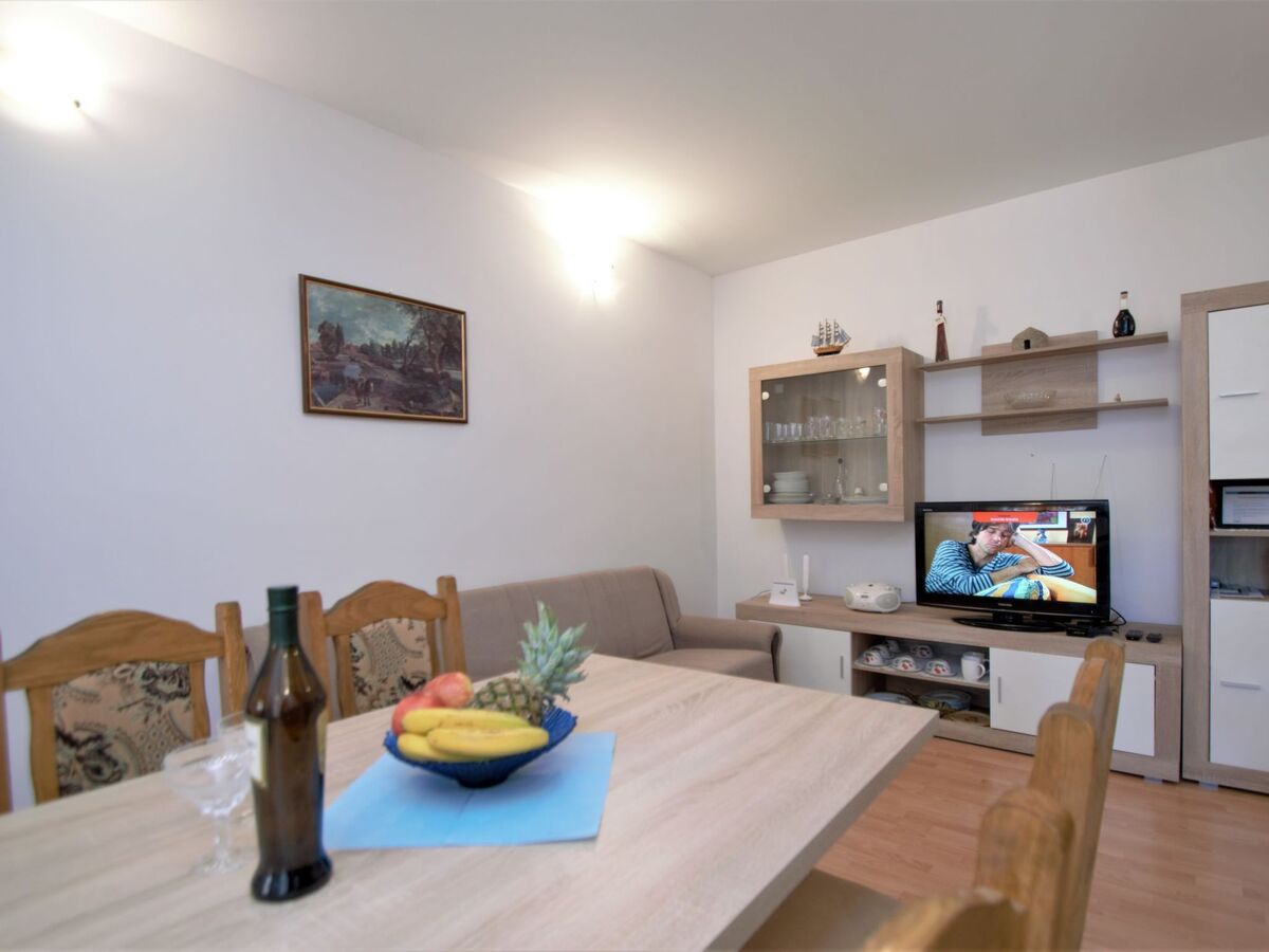 Séjour/salle à manger avec coin-cuisine et TV (écran plat).