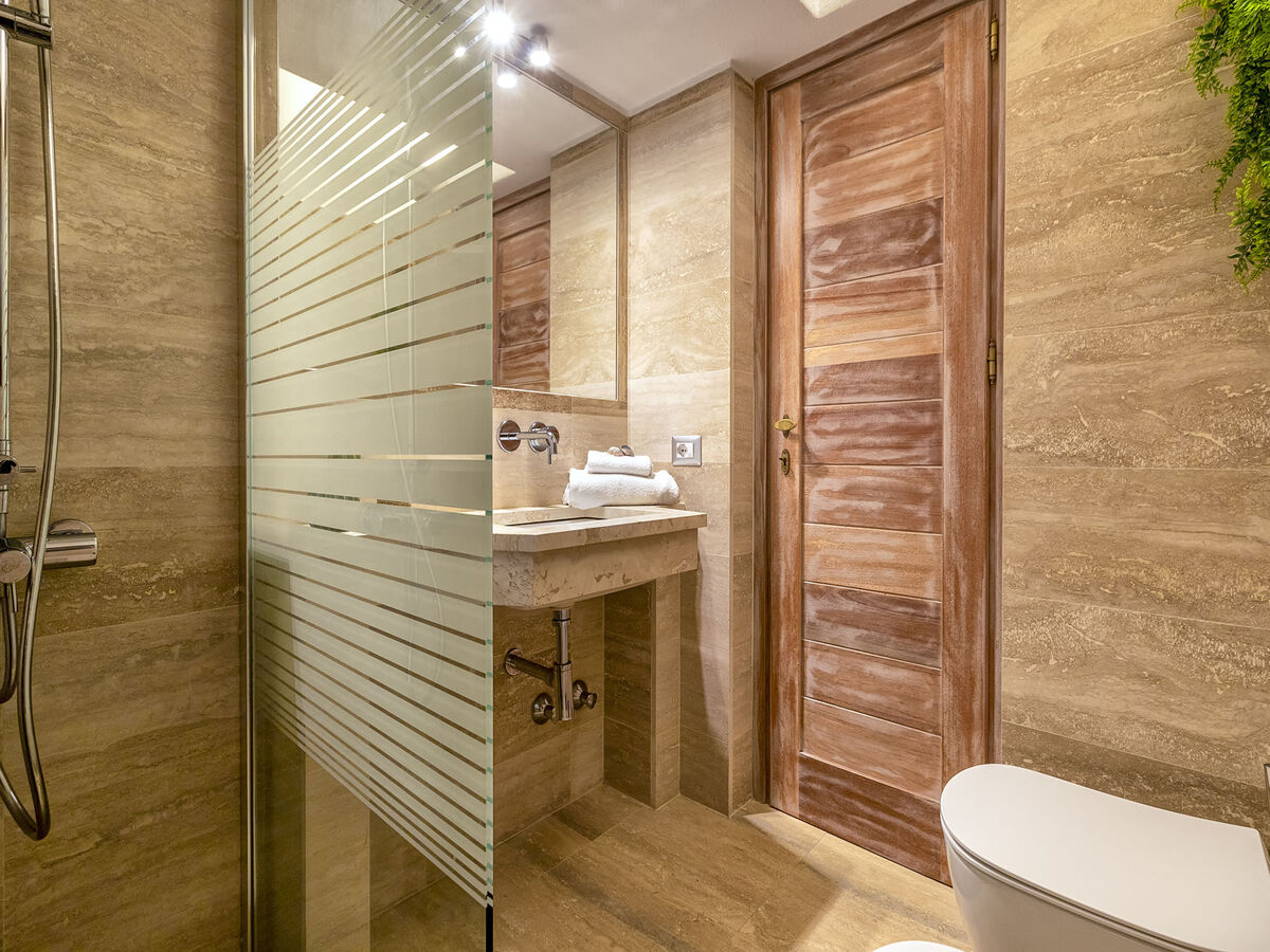 A usage privé: douche extérieure, terrasse, espace barbecue.