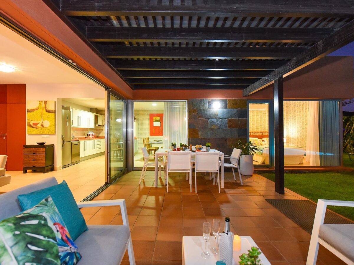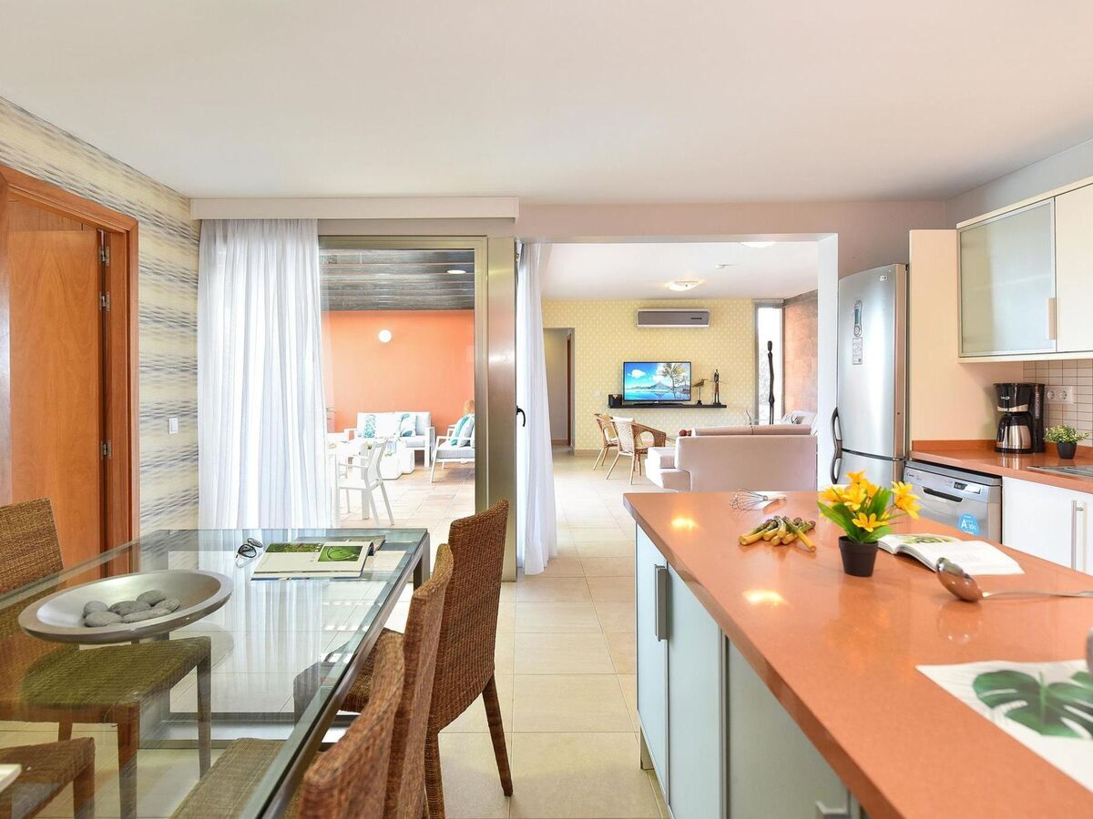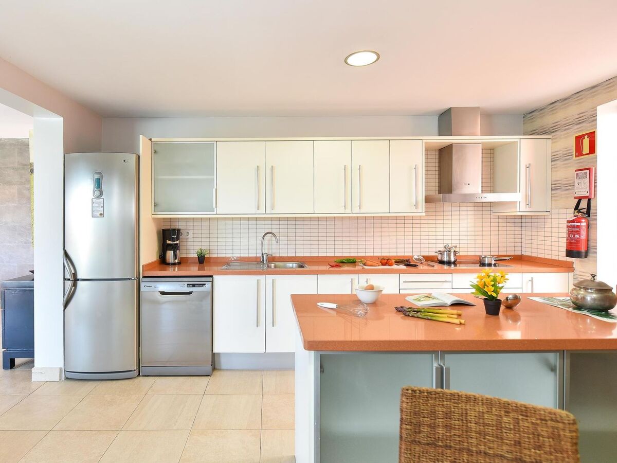Cuisine ouverte (four, lave-vaisselle, 4 plaques vitrocéramiques, grille-pain, bouilloire électrique, micro-ondes, congélateur, cafetière électrique) avec table pour les repas et air-conditionné.