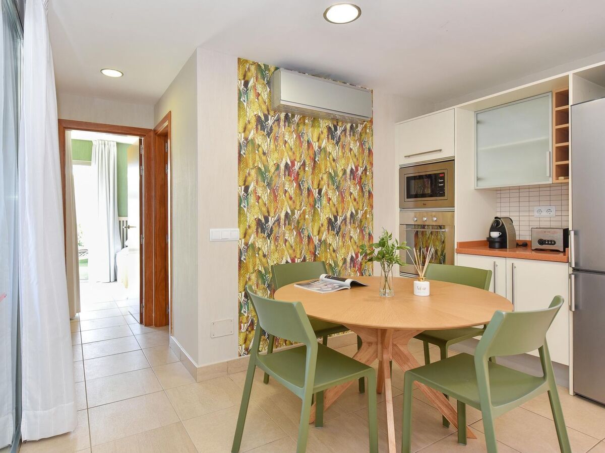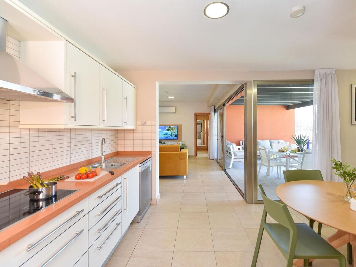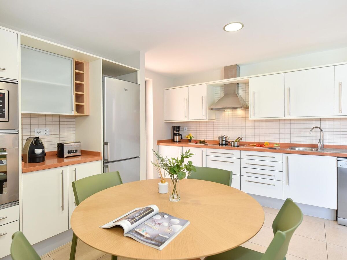 Cuisine (four, lave-vaisselle, 4 plaques vitrocéramiques, grille-pain, bouilloire électrique, micro-ondes, congélateur, cafetière électrique) avec table pour les repas et air-conditionné.