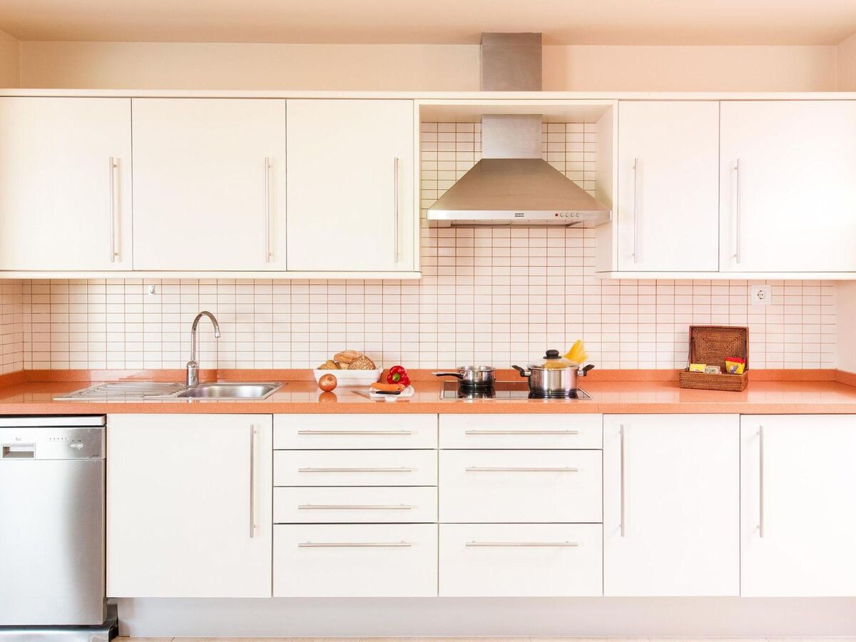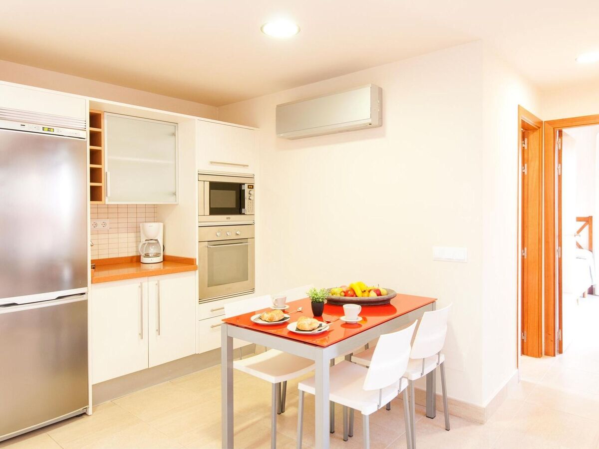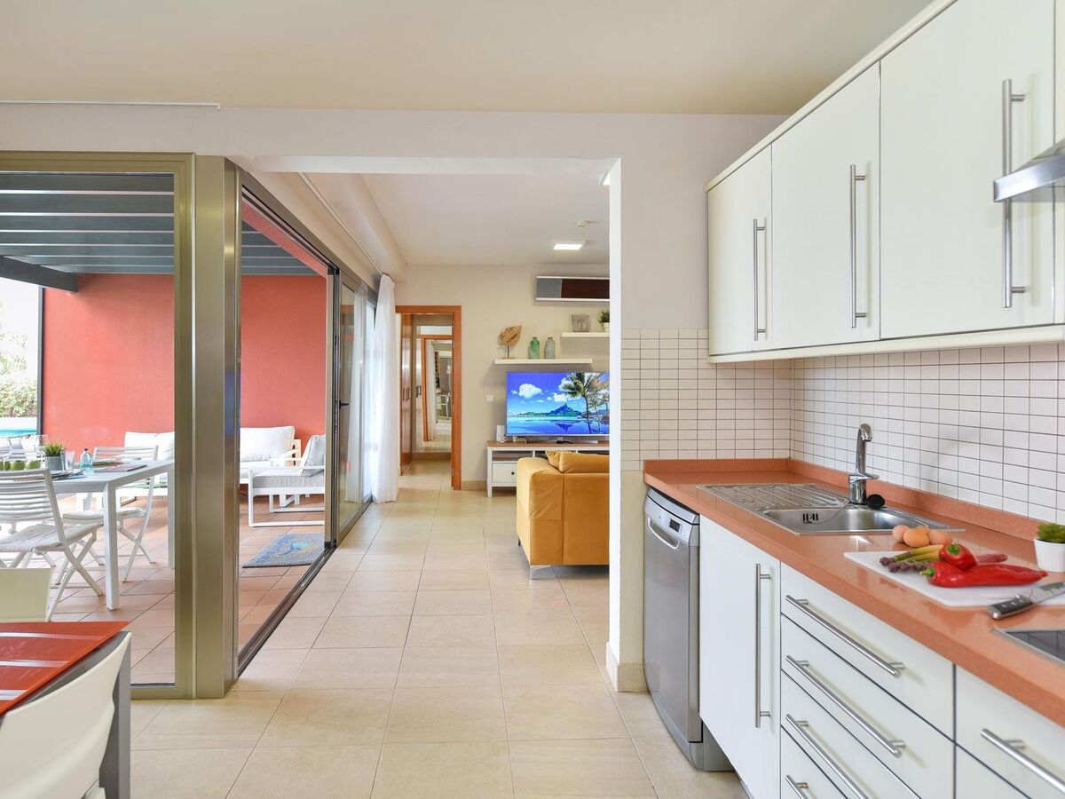 Cuisine ouverte (four, lave-vaisselle, 4 plaques vitrocéramiques, grille-pain, bouilloire électrique, micro-ondes, congélateur, cafetière électrique) avec table pour les repas et air-conditionné.