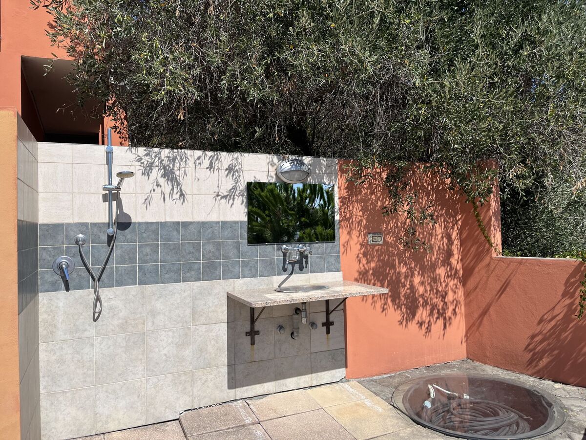 Douche extérieure, ping-pong, terrasse, meubles de jardin.