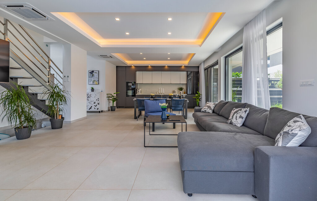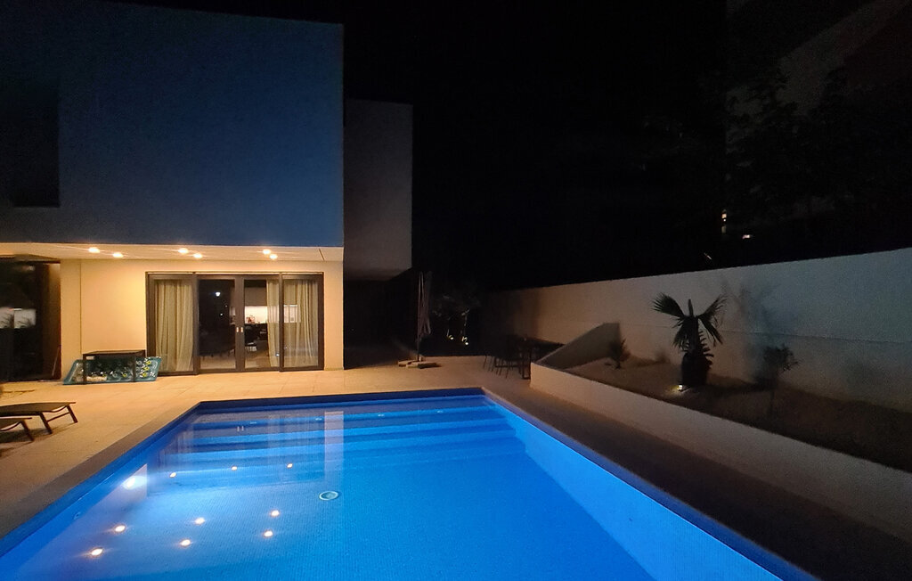Maison de vacances moderne et spacieuse avec piscine et grande terrasse sur le toit offrant une magnifique vue panoramique sur le paysage.