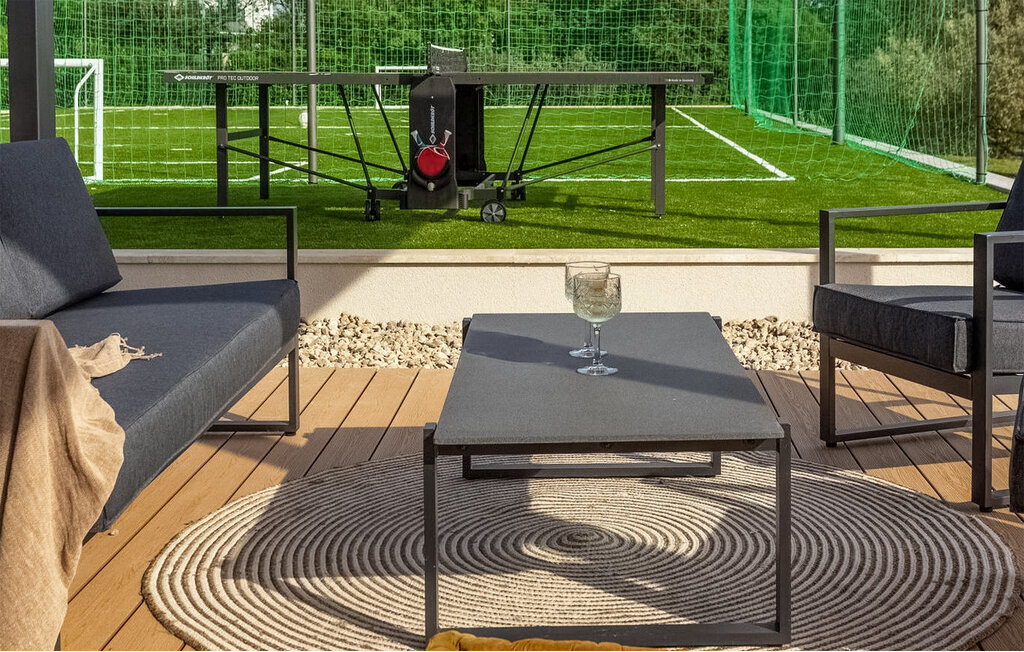 Dans le vaste espace extérieur, une piscine chauffée entourée de chaises longues, un terrain de football, une table de ping-pong et une aire de jeux pour enfants vous attendent. Accordez-vous des heures de détente ou dépensez-vous en jouant. Les soirées se terminent à merveille sur la terrasse avec barbecue au charbon de bois.