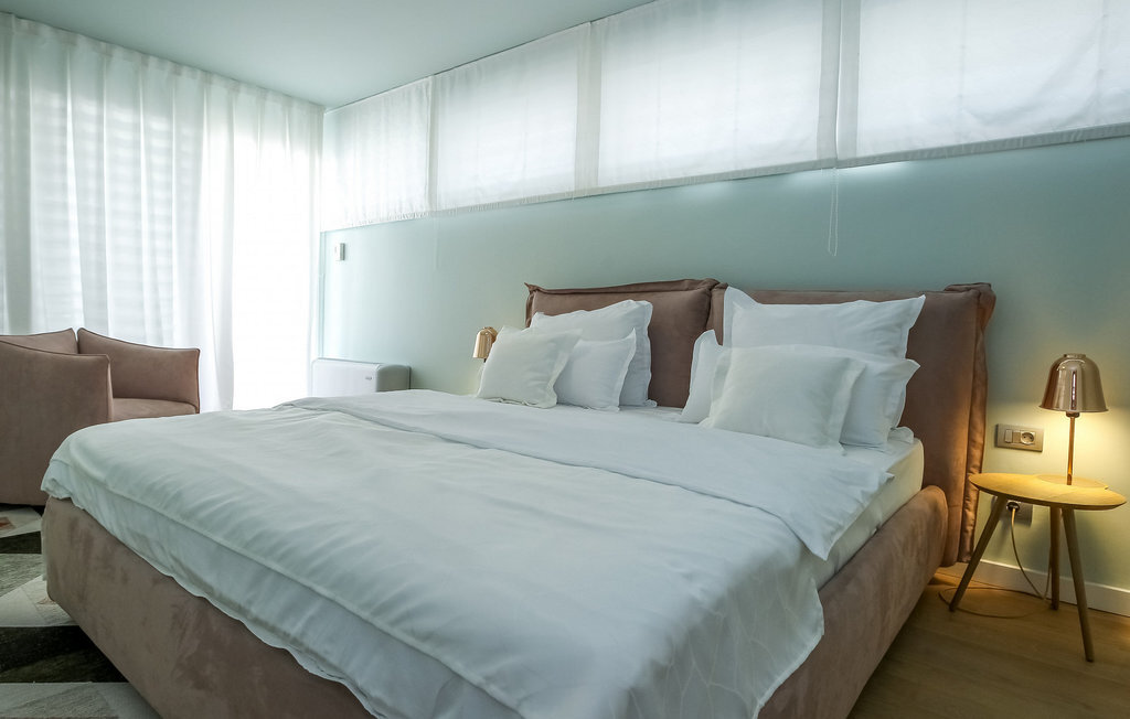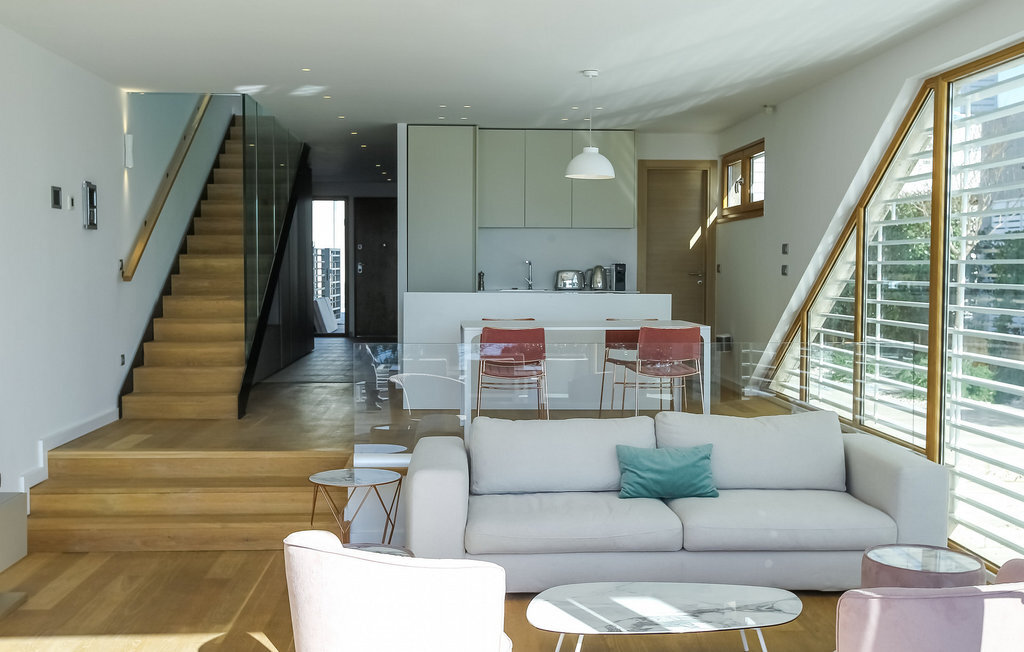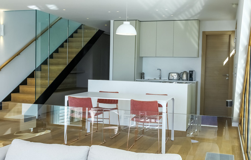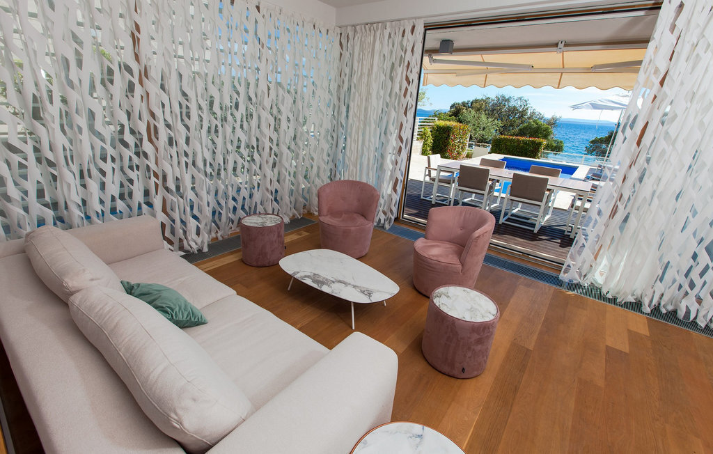 L'élégante Villa Calla vous attend dans le charmant village de Petrane, à quelques pas de la mer étincelante. Le rez-de-chaussée ouvert de la villa vous offre une cuisine moderne et minimaliste, un coin repas accueillant et un salon lumineux parfait pour des moments conviviaux en famille ou entre amis. L'aménagement de bon goût dans des tons pastel crée une atmosphère d'élégance intemporelle et de détente sur les deux étages.