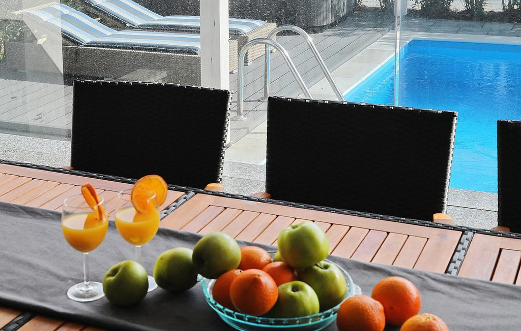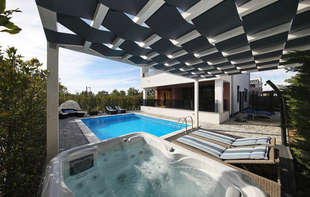 À l'extérieur, une piscine d'eau salée chauffée, un jacuzzi et des chaises longues confortables vous invitent à prendre un bain de soleil. Profitez des soirées sur la terrasse couverte avec barbecue ou terminez la journée avec un verre de vin sur les balcons avec vue sur les environs. Pour vous détendre, vous disposez également d'un sauna et, pour vous divertir, d'un trampoline.