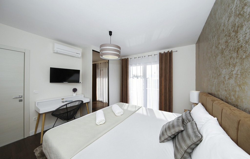 L'élégante Villa Angelina vous offre tout ce dont vous avez besoin pour passer des vacances inoubliables : Une cuisine moderne entièrement équipée, une salle à manger spacieuse et un salon élégant vous invitent à vous sentir bien. L'ambiance de qualité s'étend sur deux étages et vous permettra de passer des nuits reposantes dans les chambres à coucher.
