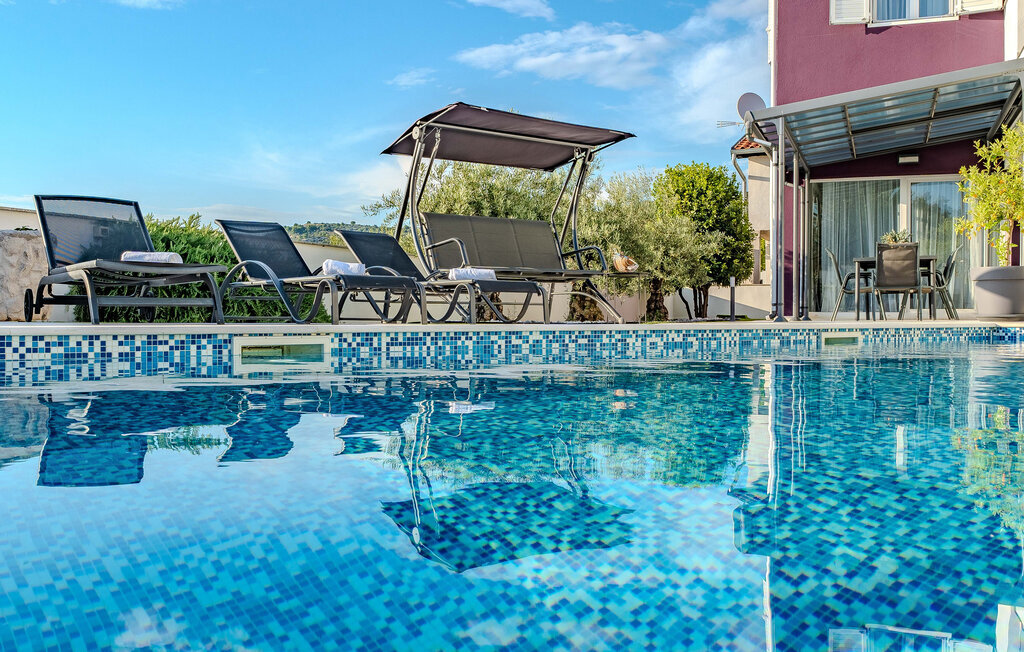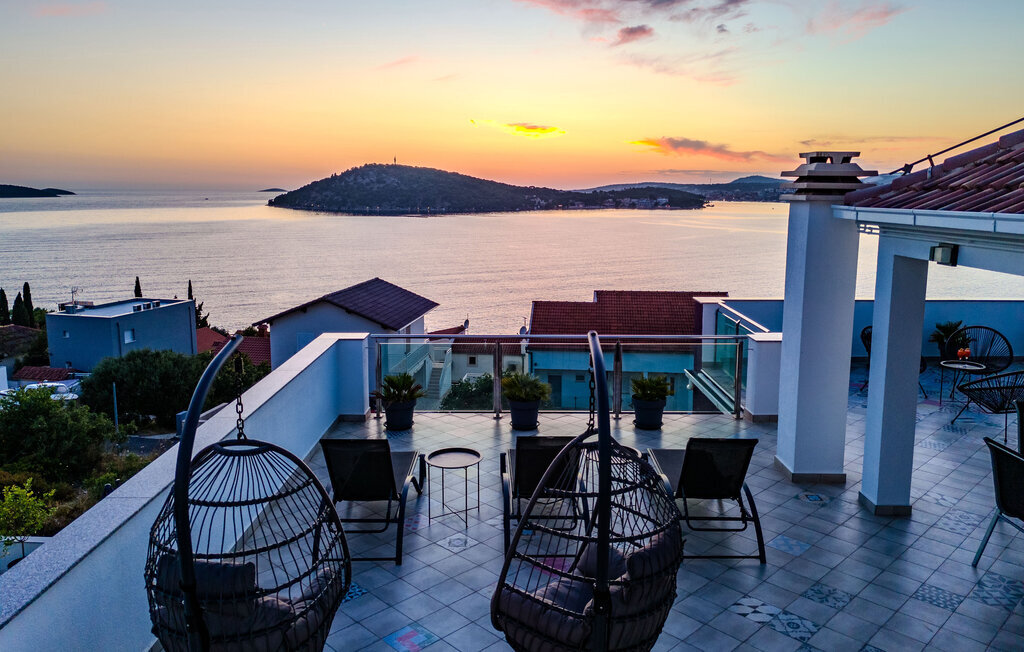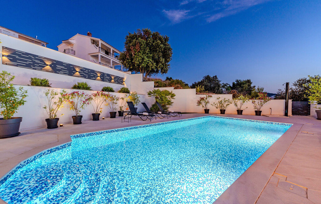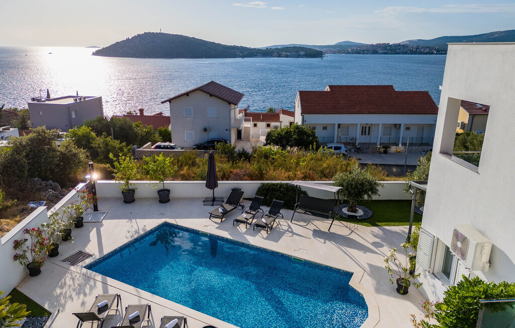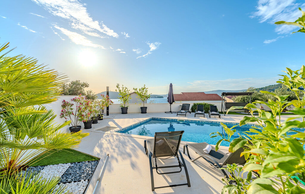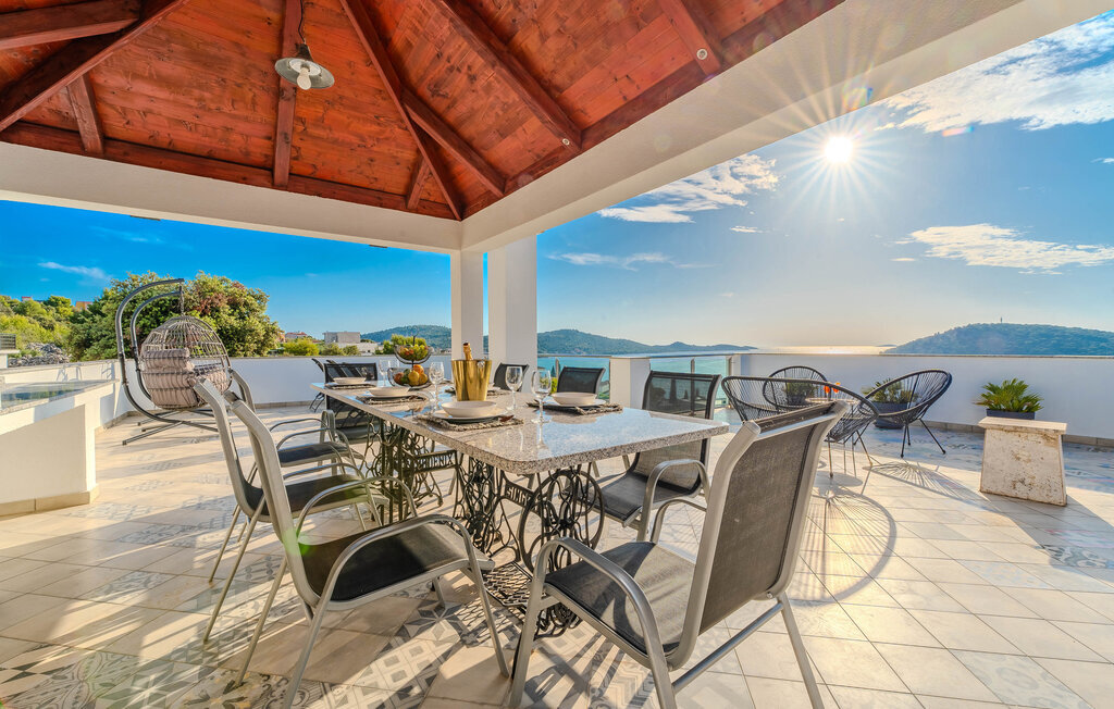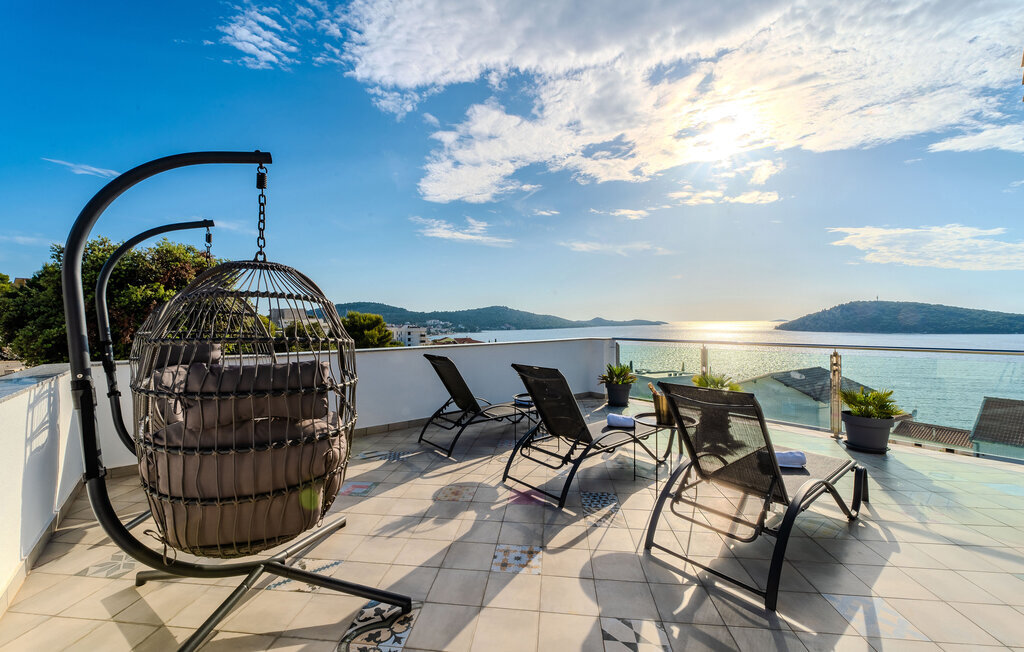 L'élégant espace extérieur présente plusieurs points forts. Rafraîchissez-vous dans la magnifique piscine et laissez-vous aller sur les confortables chaises longues ou dans la balancelle. La belle terrasse au dernier étage vous gâte avec une vue époustouflante sur la mer, la baie et Rogoznica. Profitez ici de couchers de soleil inoubliables et de soirées barbecue pleines d'ambiance avec du vin et des bougies.