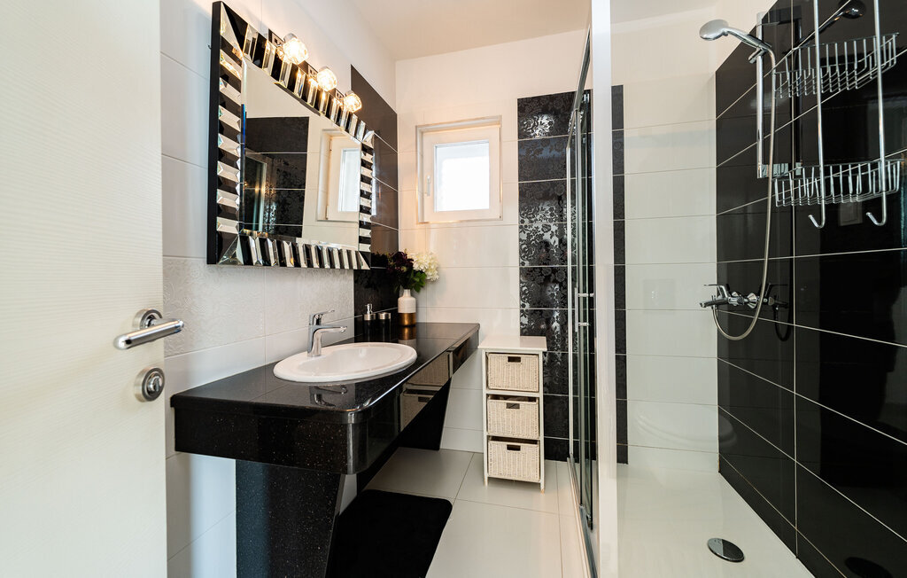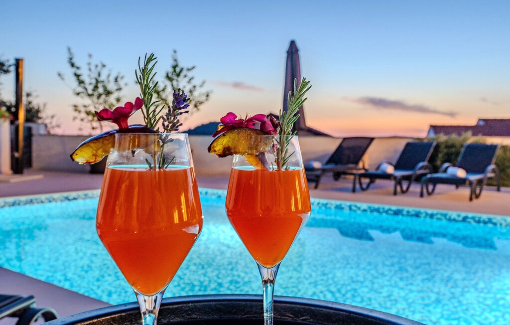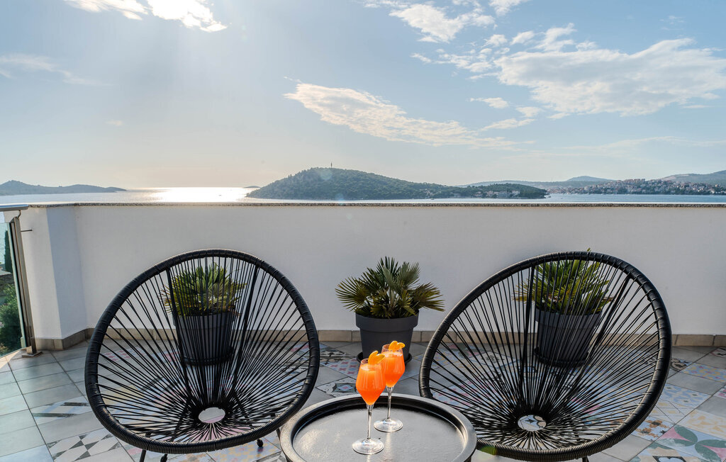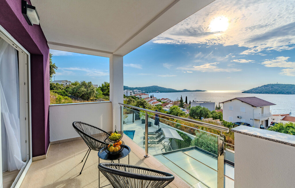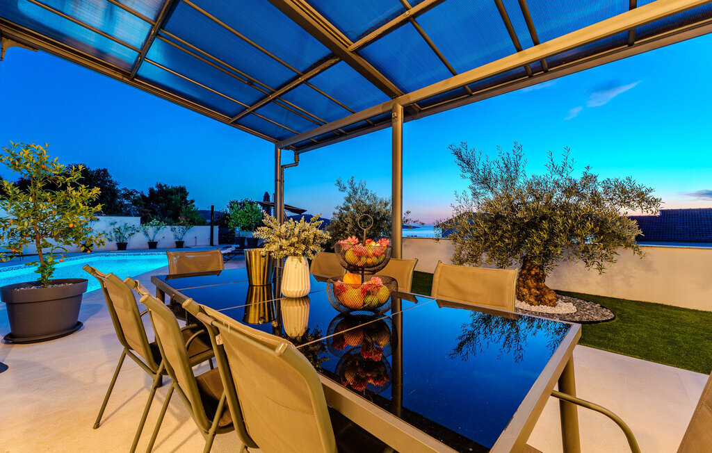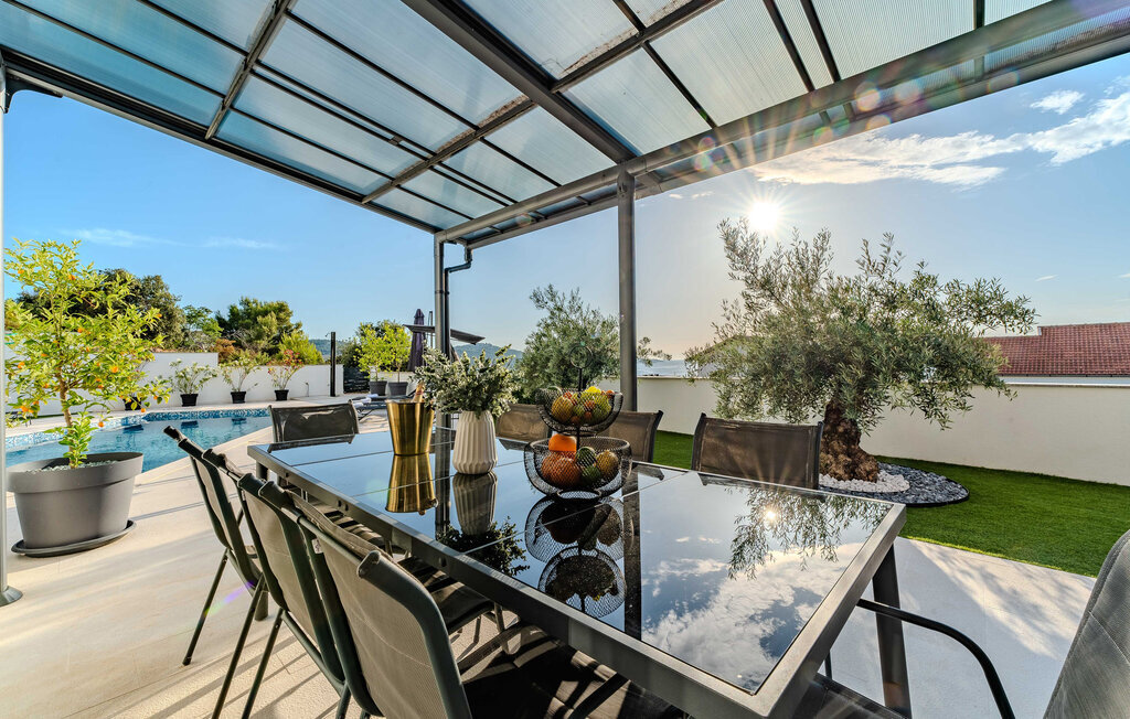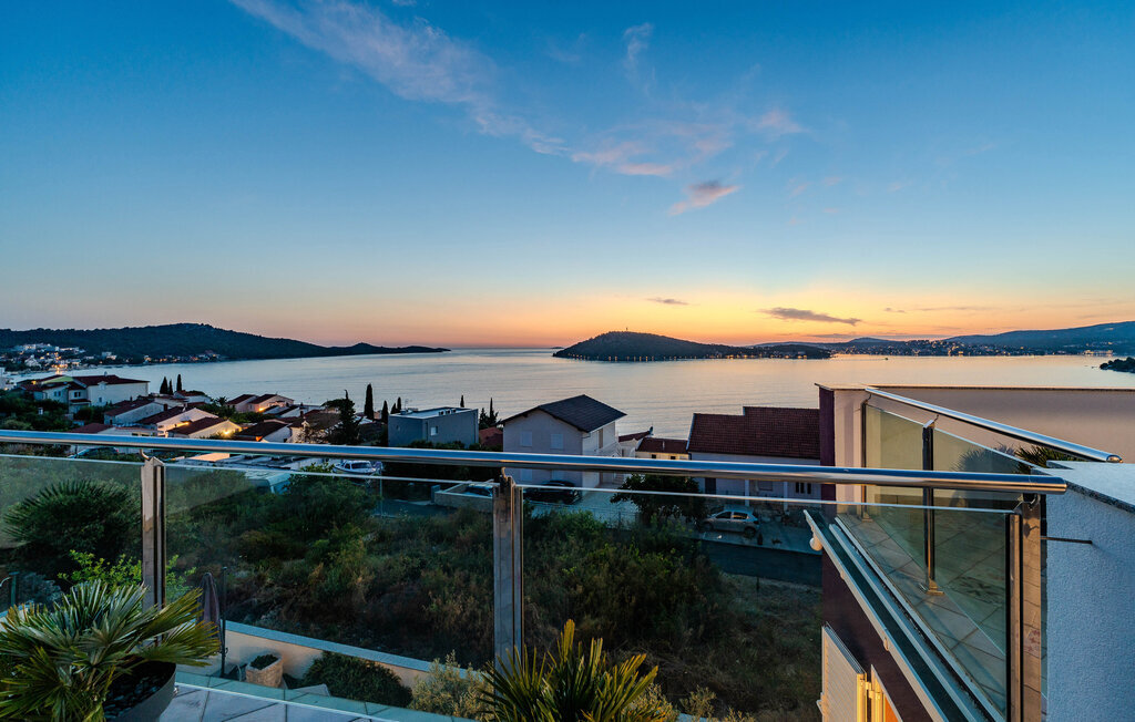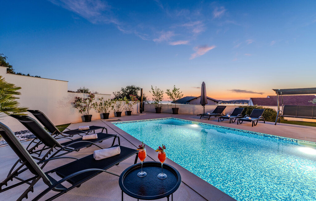 L'élégant espace extérieur présente plusieurs points forts. Rafraîchissez-vous dans la magnifique piscine et laissez-vous aller sur les confortables chaises longues ou dans la balancelle. La belle terrasse au dernier étage vous gâte avec une vue époustouflante sur la mer, la baie et Rogoznica. Profitez ici de couchers de soleil inoubliables et de soirées barbecue pleines d'ambiance avec du vin et des bougies.