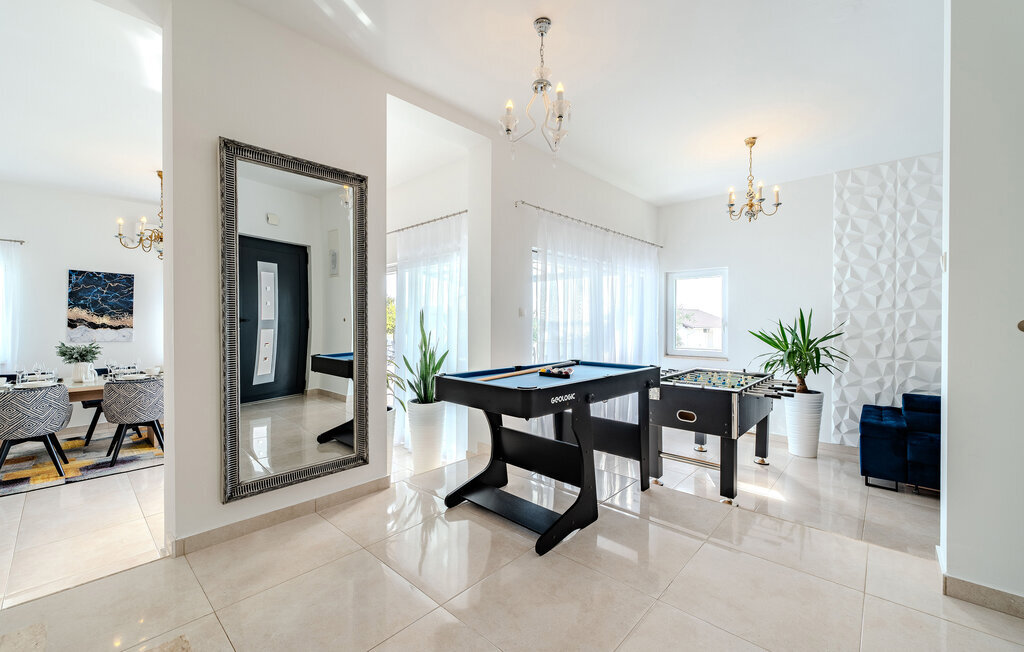 Située sur une colline, la villa moderne Carré Violet vous offre une vue impressionnante sur la mer. L'intérieur spacieux et lumineux s'étend sur trois étages, dont les deux premiers sont reliés par un escalier intérieur. De grandes fenêtres apportent une lumière naturelle abondante dans les pièces meublées avec style et qualité. Créez des spécialités culinaires dans la cuisine entièrement équipée et savourez des repas harmonieux autour de l'accueillante table à manger. Amusez-vous au billard, mesurez-vous au baby-foot ou faites une partie de ping-pong avant de passer une bonne nuit de sommeil dans les chambres spacieuses.