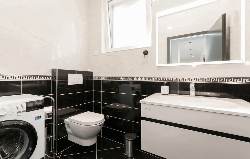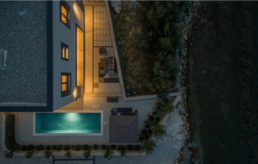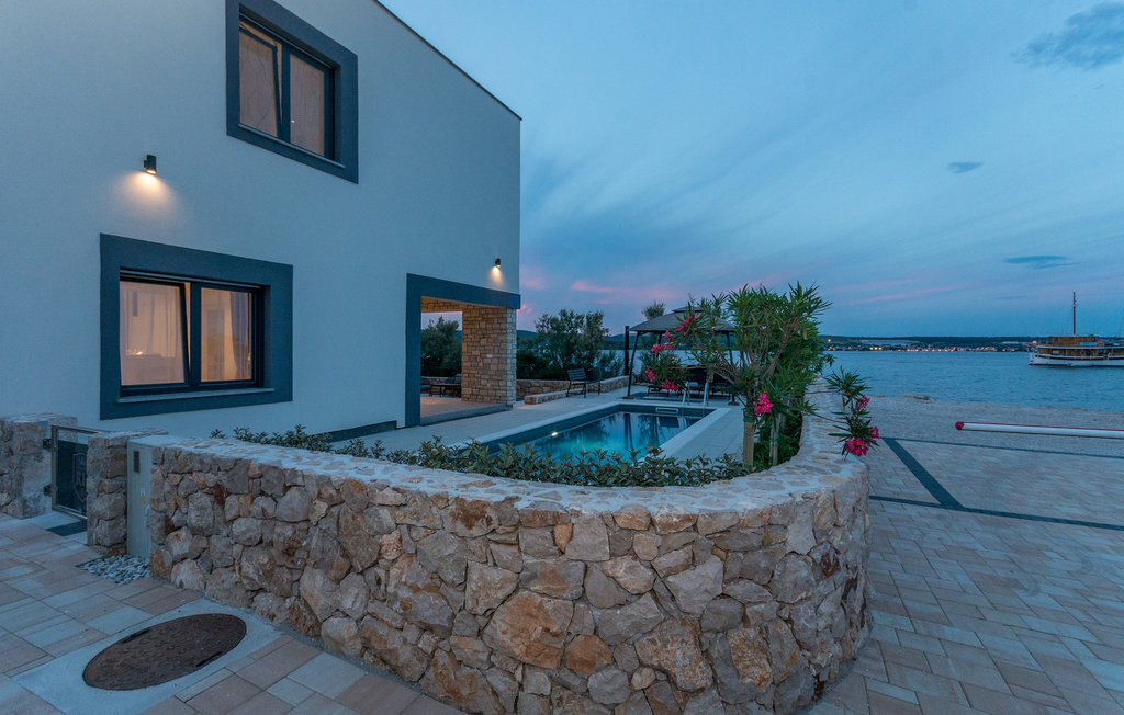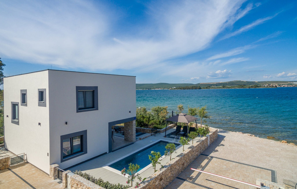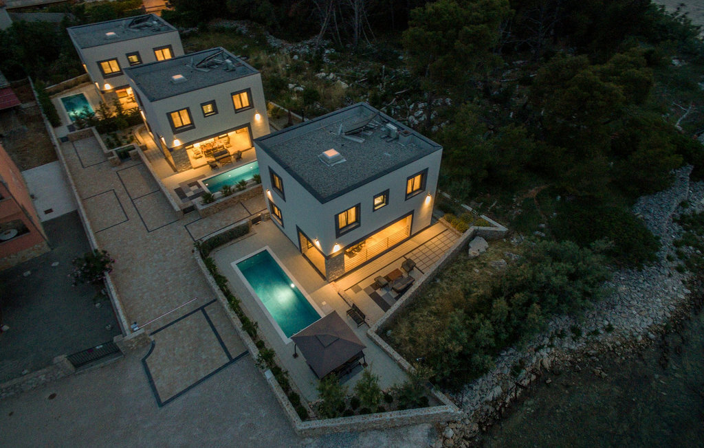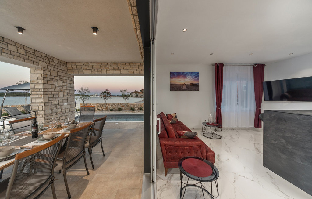 À l'intérieur de la Villa Royal House 1, vous découvrirez une ambiance moderne qui allie des lignes claires à des accents chaleureux. Les grandes fenêtres laissent passer beaucoup de lumière, ce qui met encore plus en valeur l'aménagement stylé. Détendez-vous sur le canapé rouge bordeaux et terminez la soirée en beauté en partageant un repas, une soirée de jeux ou un bon verre de vin croate. L'élégante cuisine est équipée de façades blanches brillantes et de plans de travail foncés et vous invite à cuisiner ensemble et à essayer de nouvelles recettes.