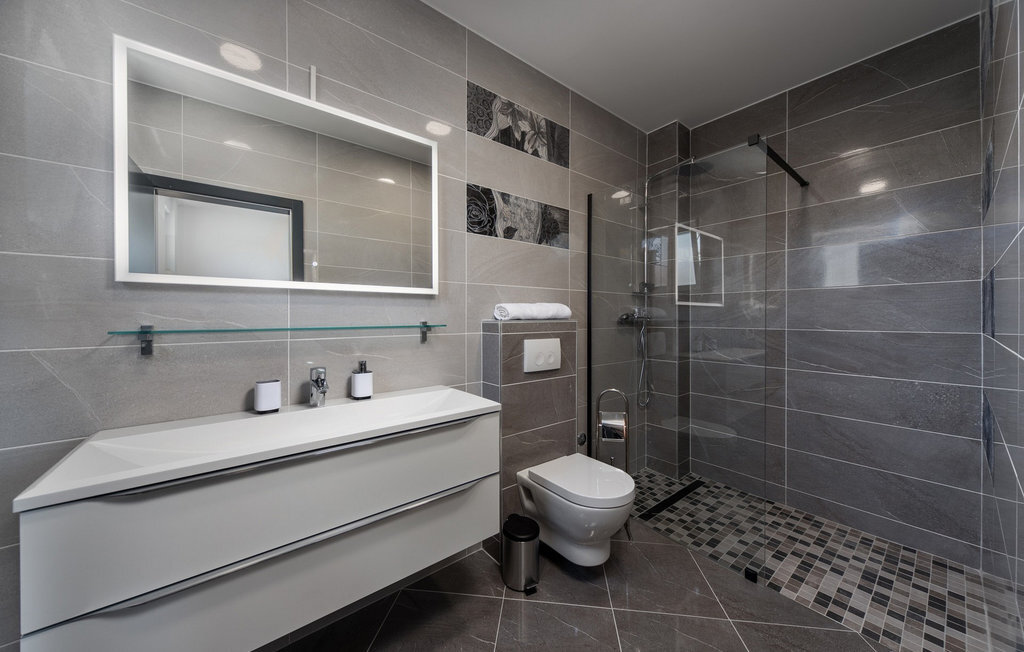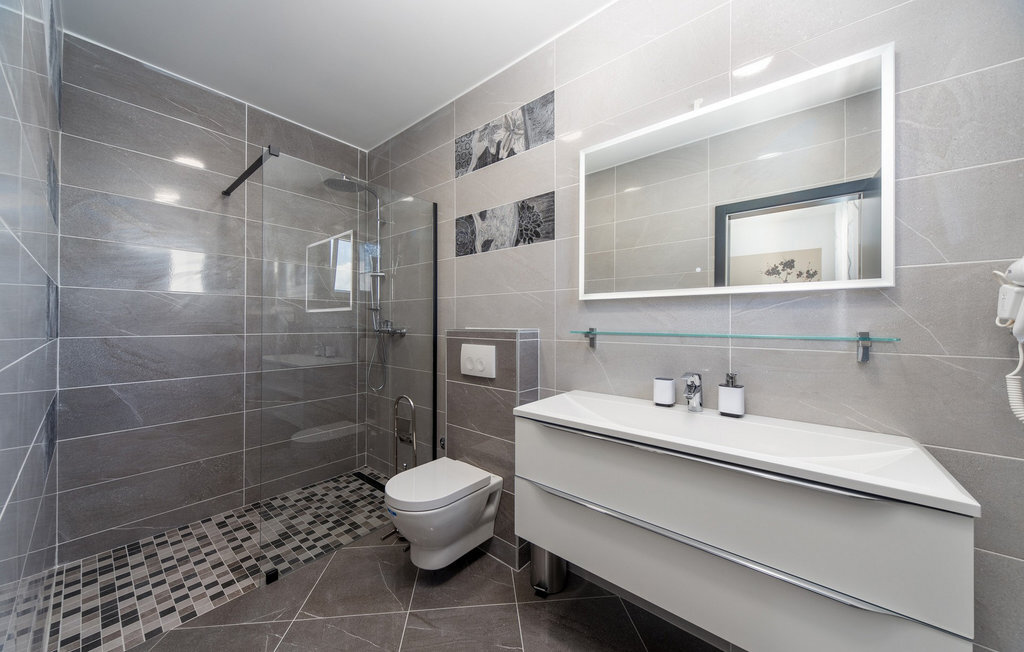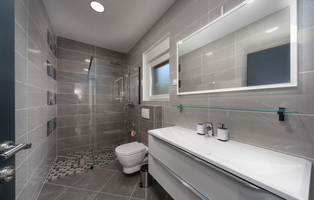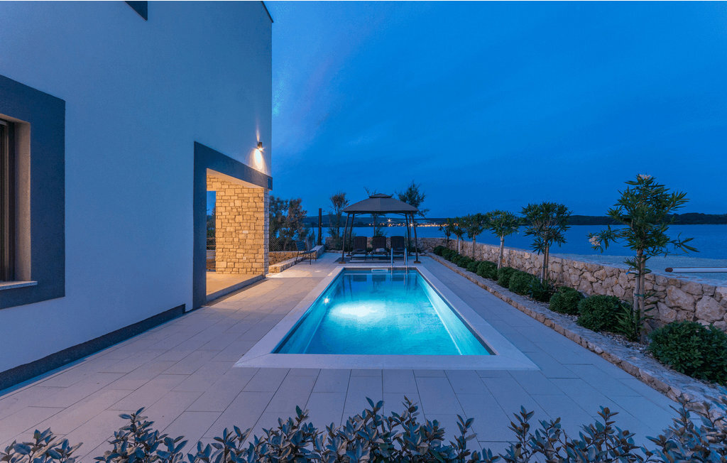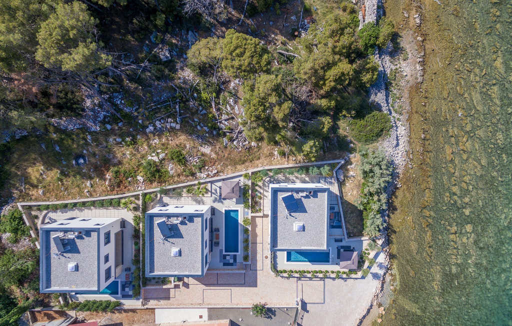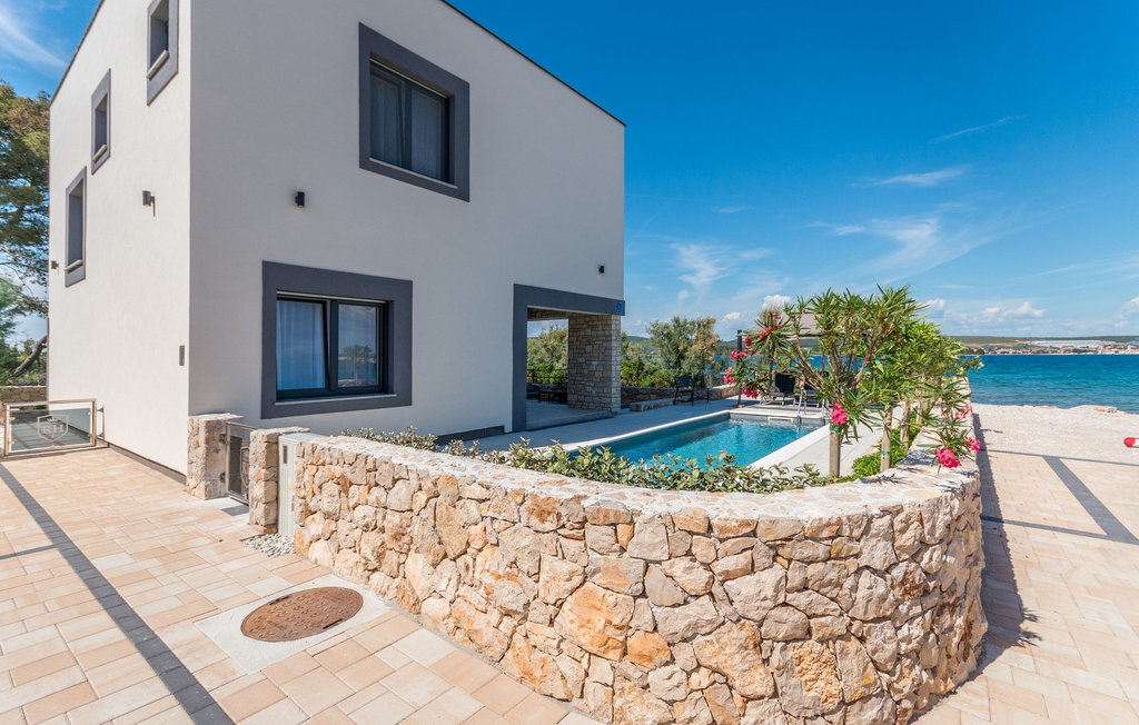 À l'intérieur de la Villa Royal House 1, vous découvrirez une ambiance moderne qui allie des lignes claires à des accents chaleureux. Les grandes fenêtres laissent passer beaucoup de lumière, ce qui met encore plus en valeur l'aménagement stylé. Détendez-vous sur le canapé rouge bordeaux et terminez la soirée en beauté en partageant un repas, une soirée de jeux ou un bon verre de vin croate. L'élégante cuisine est équipée de façades blanches brillantes et de plans de travail foncés et vous invite à cuisiner ensemble et à essayer de nouvelles recettes.