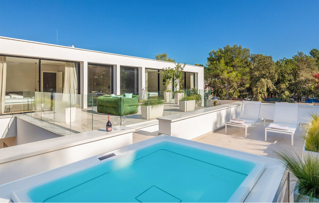 Bien-être à l'extérieur : Location de vacances disposant de chaises-longues et d'un ou plusieurs équipements tels que piscine extérieure, jacuzzi extérieur, lit à baldaquin de jardin etc...