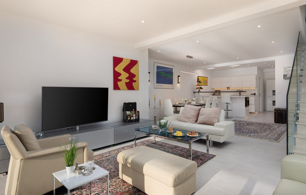 L'espace extérieur sensationnel de cette confortable maison jumelée enthousiasme avec une magnifique piscine à débordement chauffée et plusieurs terrasses ensoleillées avec des chaises longues confortables pour des heures de détente sous le ciel bleu. Offrez-vous des boissons rafraîchissantes à l'ombre, admirez le coucher de soleil et discutez lors de soirées barbecue pleines d'ambiance dans la douceur des nuits d'été.