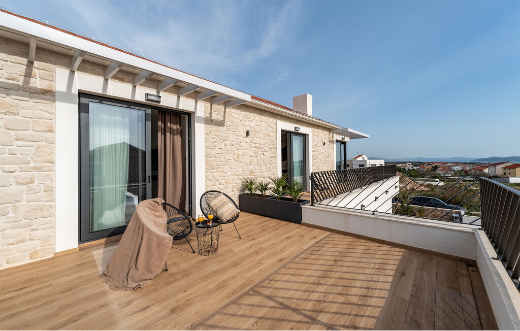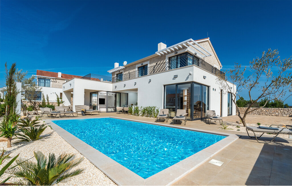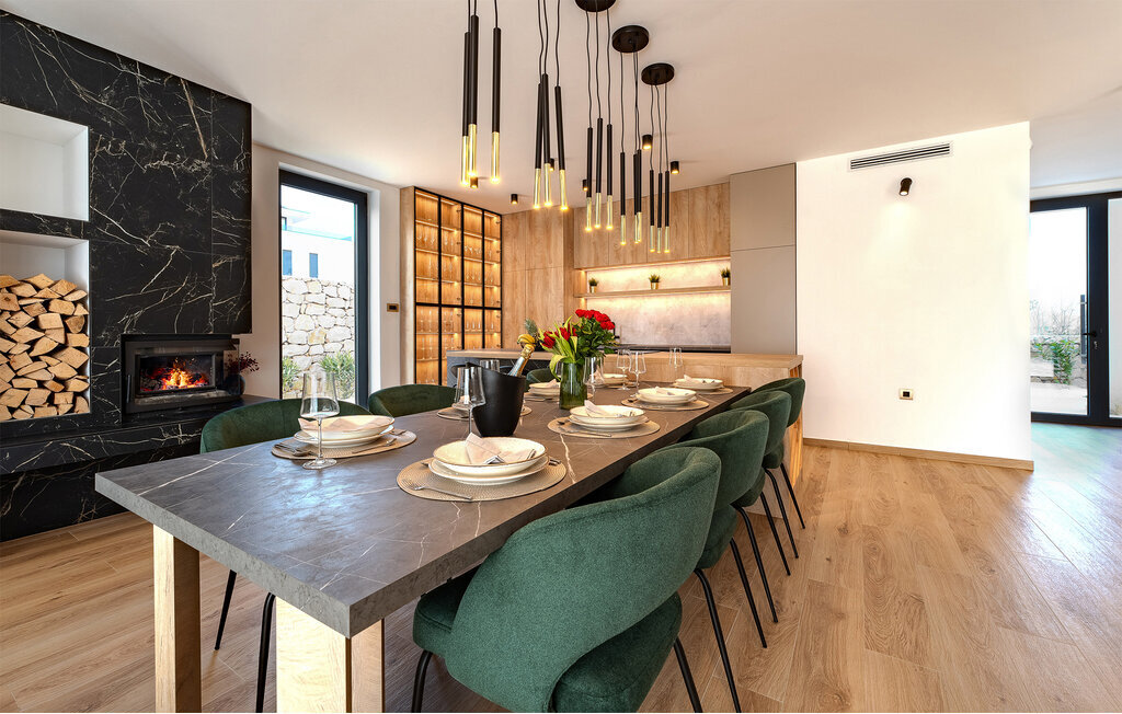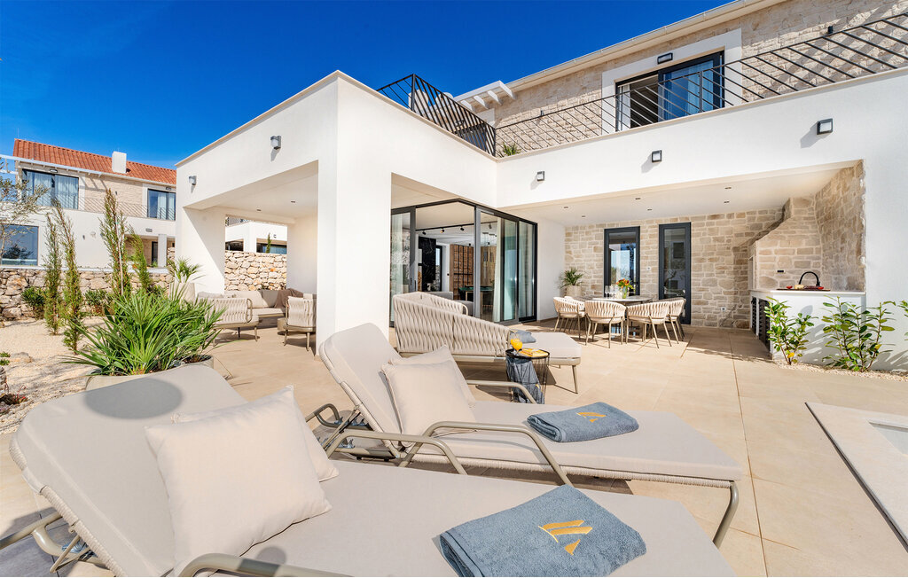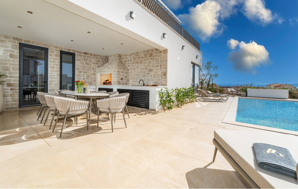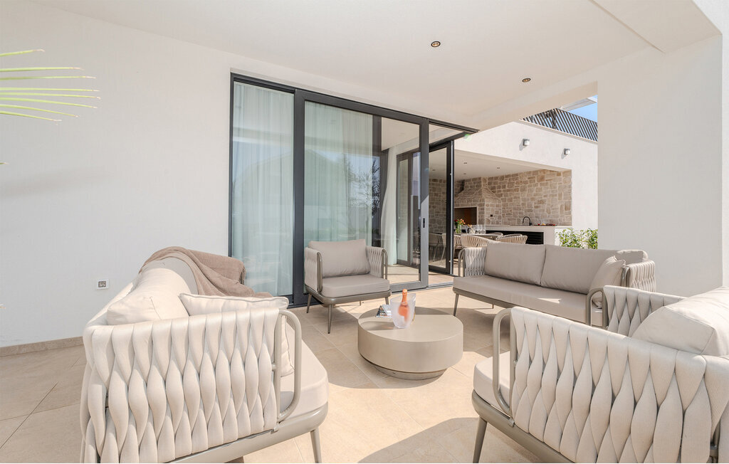 Commencez la journée par un café matinal sur la grande terrasse. La salle de séjour de votre élégant logement vous invite également à vous détendre et à partager des moments de convivialité autour d'un repas ou d'amusants jeux de société. Rassemblez-vous autour de l'élégante table à manger ou installez-vous confortablement sur le canapé pour regarder un bon film. La maison offre de nombreuses possibilités de profiter du temps libre à l'extérieur. Rendez-vous sur la terrasse du premier étage et regardez au loin les eaux bleues de la mer Adriatique scintiller. Préparez des délices culinaires dans la cuisine d'été ombragée et dînez à la longue table en plein air. La piscine offre aux petits et aux grands un rafraîchissement vivifiant et des heures de joie. De nombreuses activités sportives en plein air vous attendent également.