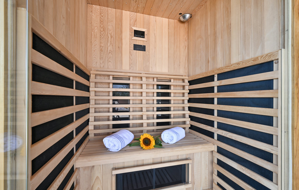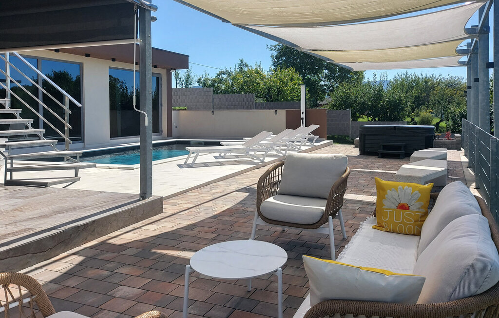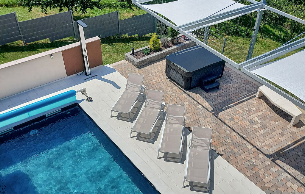 Bien-être à l'extérieur : Location de vacances disposant de chaises-longues et d'un ou plusieurs équipements tels que piscine extérieure, jacuzzi extérieur, lit à baldaquin de jardin etc...