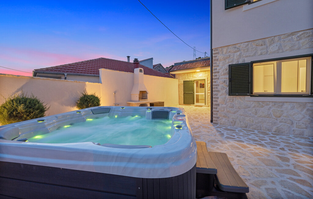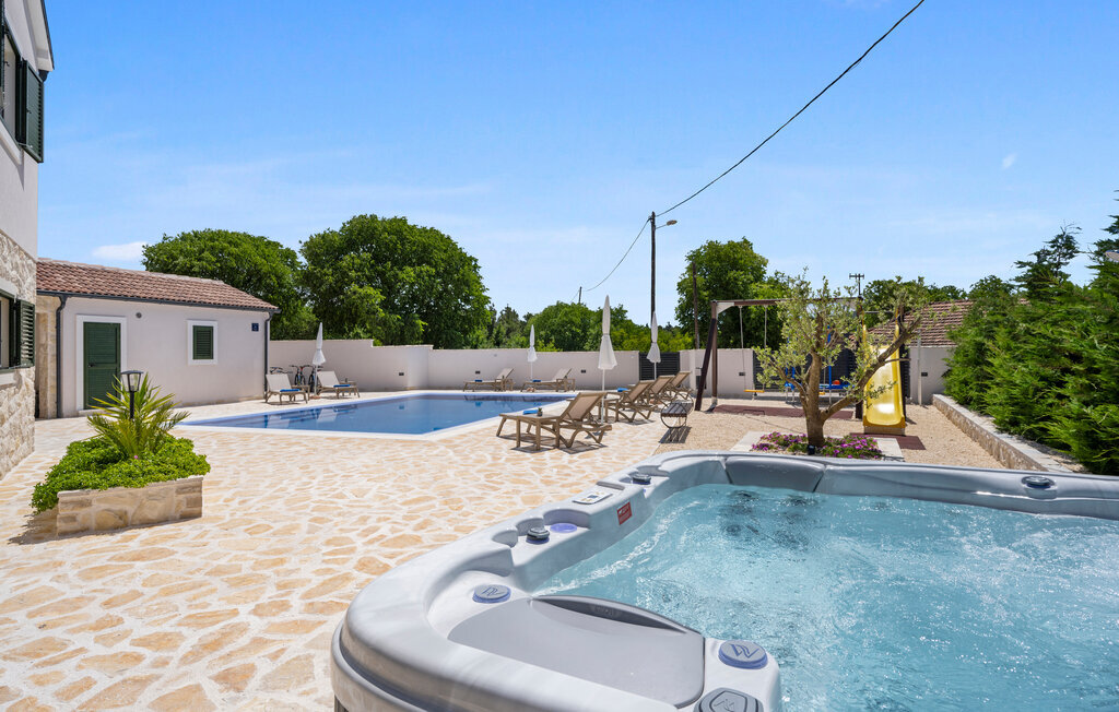 Bien-être à l'extérieur : Location de vacances disposant de chaises-longues et d'un ou plusieurs équipements tels que piscine extérieure, jacuzzi extérieur, lit à baldaquin de jardin etc...