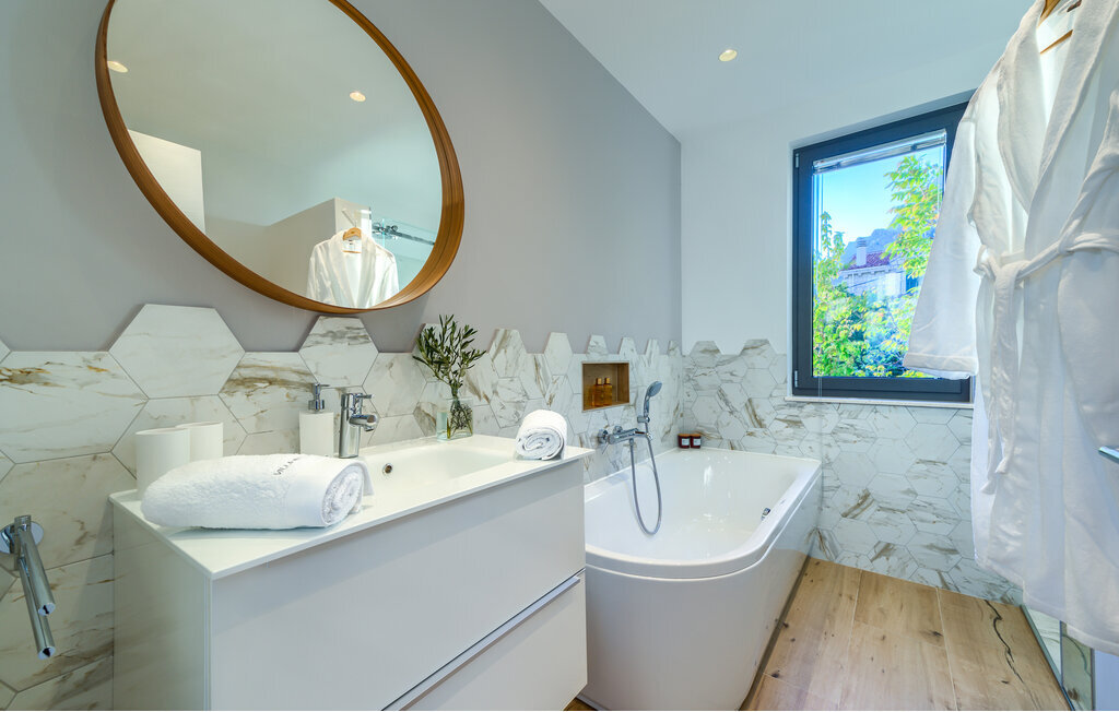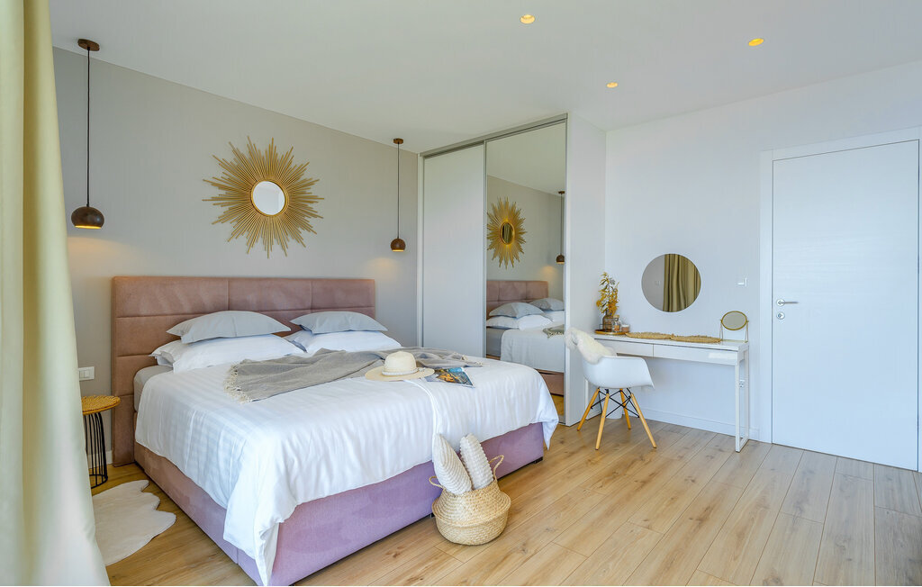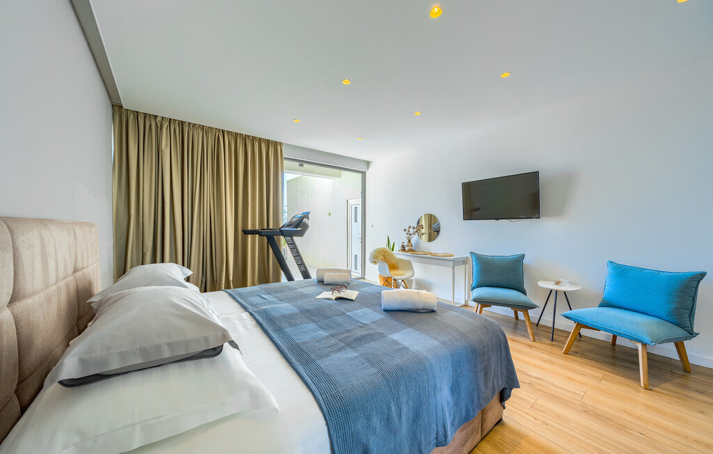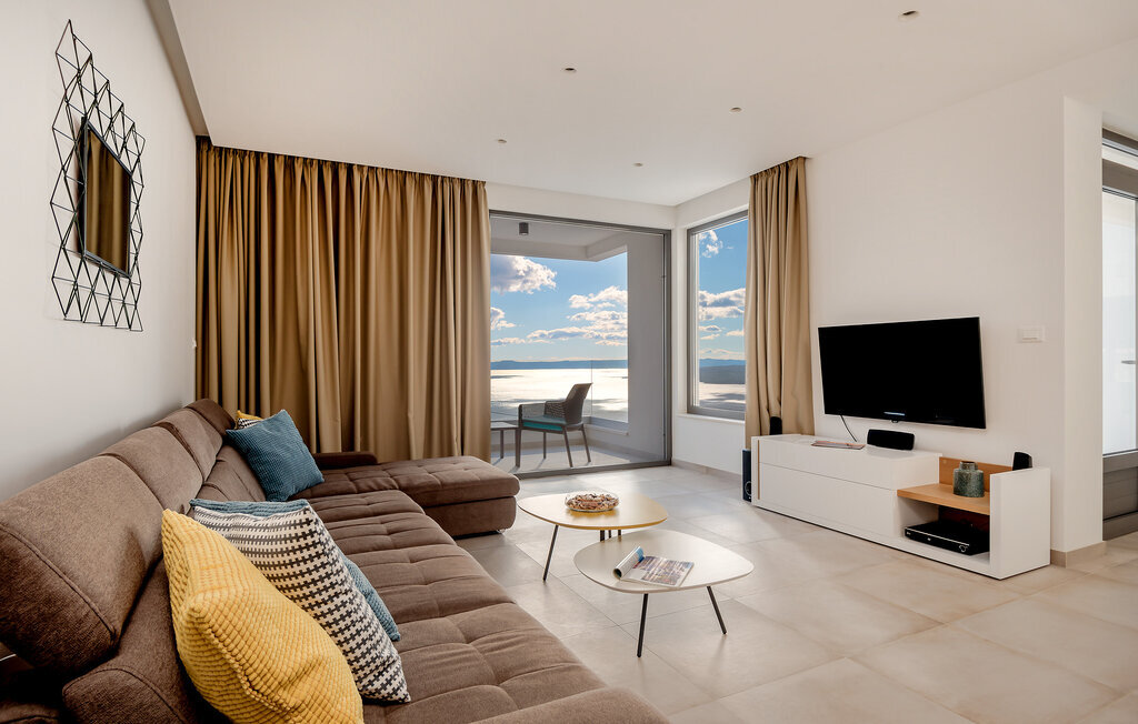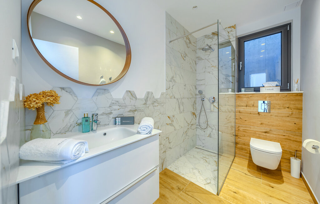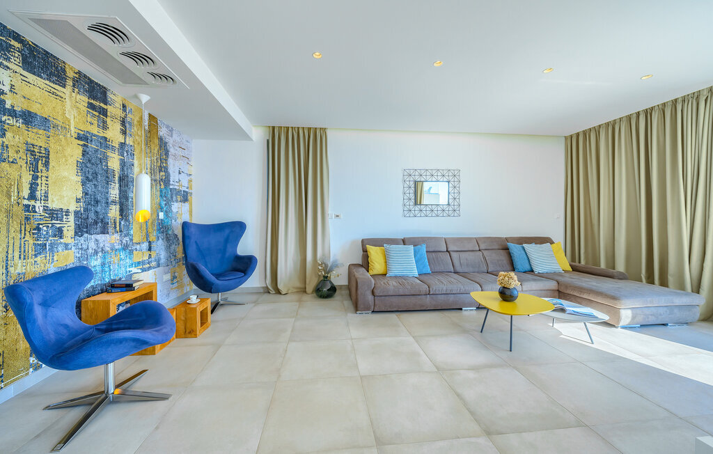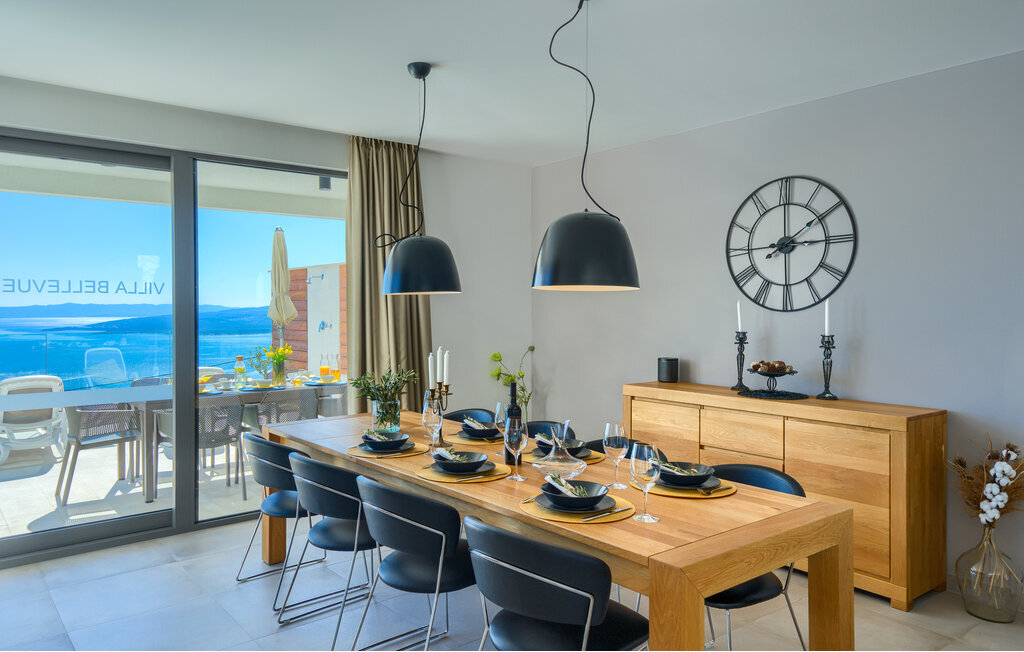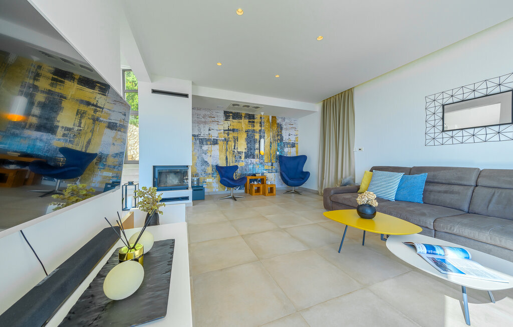 À l'intérieur de la Villa Bellevue, vous découvrirez un design moderne qui allie des lignes claires à des accents de couleurs vives et qui confère à chaque pièce une note particulière. De grandes baies vitrées ouvrent la vue sur la mer et donnent une impression encore plus généreuse aux salons et salles à manger inondés de lumière. Installez-vous confortablement sur l'élégant canapé, profitez de soirées conviviales autour d'une table festive ou détendez-vous avec un bon verre de vin et une vue sur la piscine. La cuisine élégante vous invite à cuisiner ensemble et à partager des moments culinaires avec votre famille et vos amis.