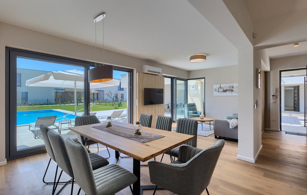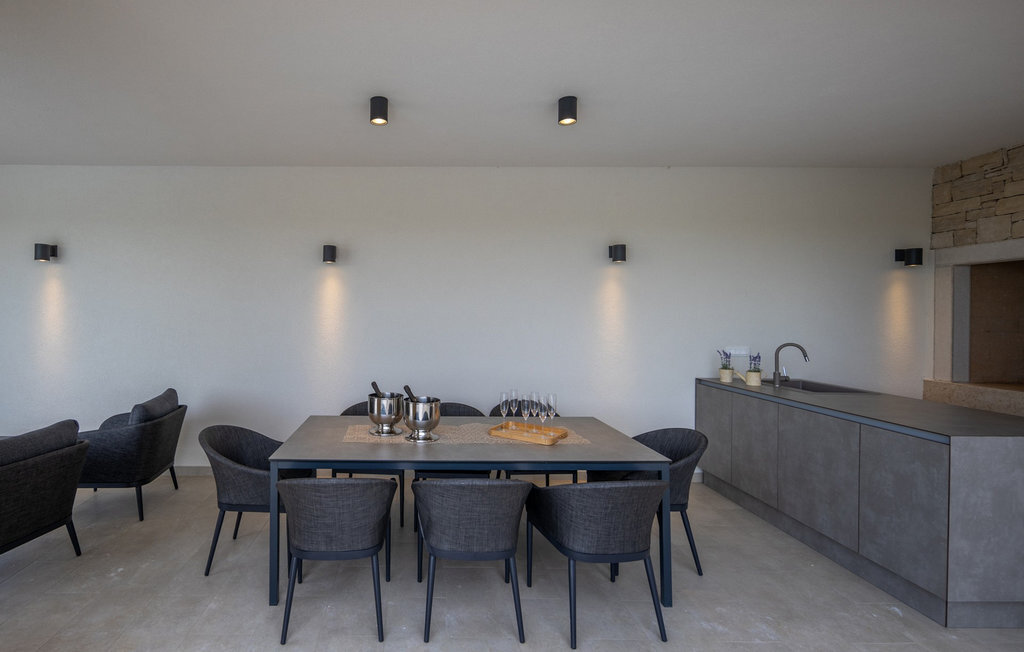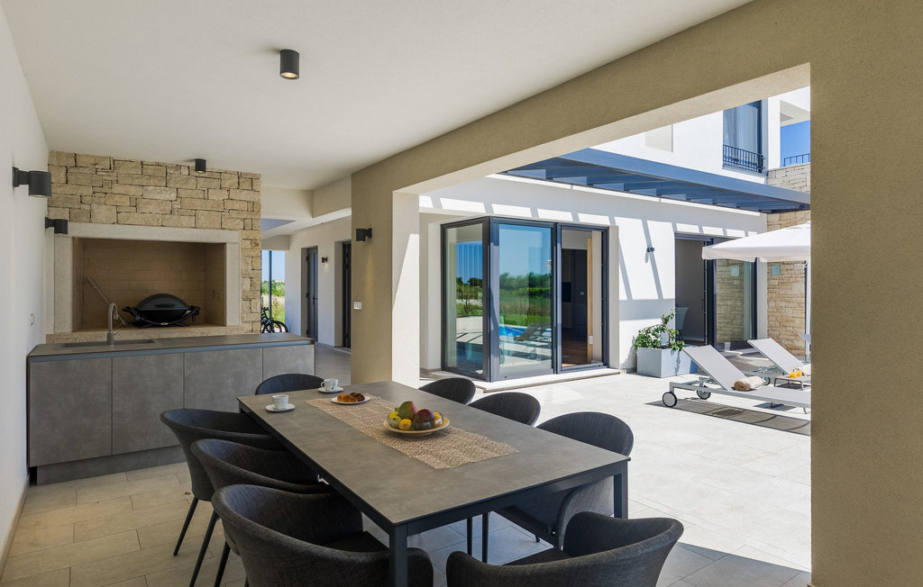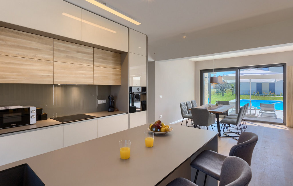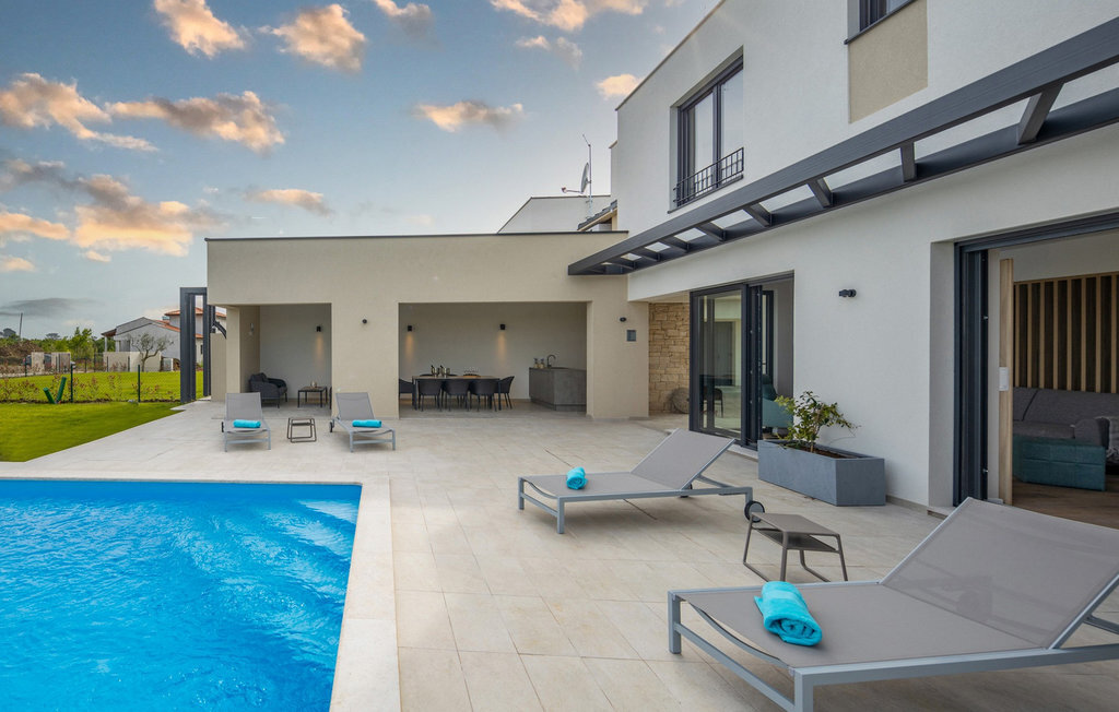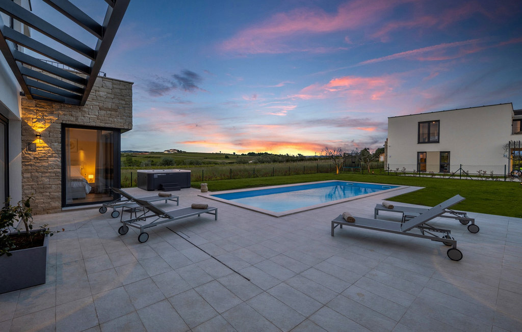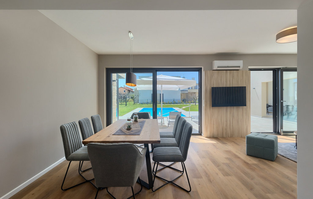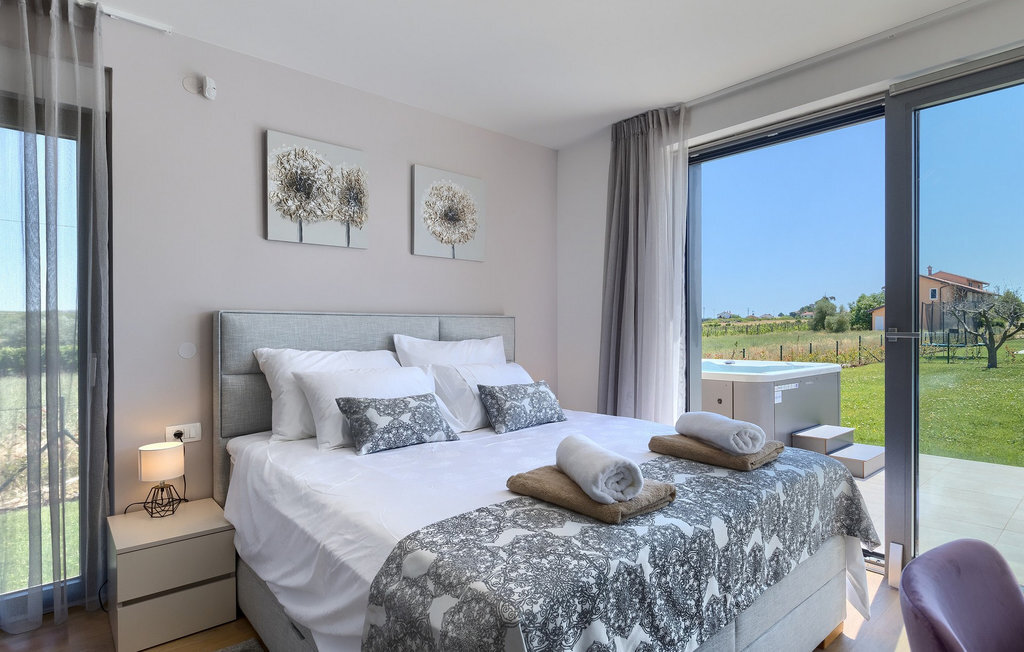La villa moderne Luna est un véritable havre de paix au cœur de la nature intacte de Brtonigla. C'est un lieu en Istrie qui fait partie des endroits où de nombreux touristes aiment revenir chaque année pour son paysage idyllique et son climat agréable et chaud. Si vous êtes une personne qui aspire à la tranquillité tout en passant des vacances luxueuses, alors Villa Luna est le bon choix pour vous ! Construite en 2021 dans un style architectural moderne, la Villa Luna dispose de 230 m2 de surface habitable et possède en outre un grand jardin idéal pour les jeux des enfants. À l'intérieur, il y a beaucoup de détails luxueux pour rendre vos vacances de rêve encore meilleures et plus belles ! La villa est divisée en rez-de-chaussée et en étage et peut accueillir 10 personnes au maximum et 8 au mieux. Au rez-de-chaussée se trouvent un salon spacieux avec télévision, table basse, canapé et fauteuil, une cuisine avec bar avec 3 places assises, une salle à manger avec table pour 8 personnes ainsi qu'une chambre à coucher et une salle de bain privée avec baignoire. À l'étage supérieur se trouvent 3 autres chambres à coucher avec lit double et 3 salles de bains ensuite avec douches, et à l'intérieur de la villa il y a un autre WC séparé. Chacune des chambres à coucher dispose de sa propre sortie vers la terrasse ou le balcon. Sur la terrasse extérieure se trouve une piscine chauffée de 40 m2 et d'une profondeur de 1,35 mètre. L'équipement supplémentaire de la piscine comprend également le chauffage, mais contre un supplément. Vous pouvez vous rafraîchir agréablement de jour comme de nuit et le jacuzzi à côté de la piscine vous garantit des soirées romantiques autour d'un verre de vin traditionnel d'Istrie. Les bains de soleil sont possibles sur des chaises longues au bord de la piscine. Dans la cour intérieure de la villa se trouve une terrasse spacieuse avec une cuisine d'été équipée d'un barbecue, une table à manger extérieure avec 8 places assises et un canapé d'angle. La villa offre à ses hôtes des installations supplémentaires telles que deux vélos pour adultes, un trampoline, un badminton et des fléchettes. Juste à côté de la Villa Luna se trouve sa sœur, la Villa Sole, qui peut également être louée et qui offre également un séjour agréable et luxueux ! Deux places de parking sont à votre disposition dans la cour et une autre place supplémentaire est disponible à l'extérieur de la cour. Ce qui rend Brtonigla spécial, ce sont ses rues pittoresques, où presque chaque maison a une couleur différente, et ses panoramas, d'où l'on peut profiter de la vue magnifique sur la nature intacte, ravissent chaque visiteur. En bref, c'est un endroit idéal pour les créatifs et les romantiques, en particulier pour ceux qui recherchent une thérapie anti-stress. Parmi les curiosités, on peut citer l'église Sv. Zeno datant du 19e siècle, la galerie commémorative du sculpteur Aleksandar Rukavina, et une visite à Brtonigla ne peut se faire sans déguster les vins des producteurs locaux. Pour les plus petits, Brtonigla abrite également le parc aquatique Istralandia, qui propose de nombreux contenus intéressants qui ne manqueront pas de les enthousiasmer ! Profitez avec vos proches de vacances luxueuses et tranquilles et détendez-vous dans la fabuleuse Istrie ! Bienvenue à la Villa Luna ! Le chauffage de la piscine est disponible moyennant des frais supplémentaires à régler sur place. Les animaux domestiques sont autorisés dans ce logement à la discrétion du propriétaire et moyennant un supplément. Veuillez noter que ce logement n'accepte les groupes de jeunes que contre le paiement d'une caution remboursable de 1000 EUR. Un groupe de jeunes dans ce logement est composé de personnes de moins de 27 ans. Si vous êtes un groupe de jeunes, il vous sera demandé de verser la caution à votre arrivée. Tout montant nécessaire à la réparation des dommages causés au logement pendant votre séjour sera déduit de la caution et vous sera ensuite remboursé.