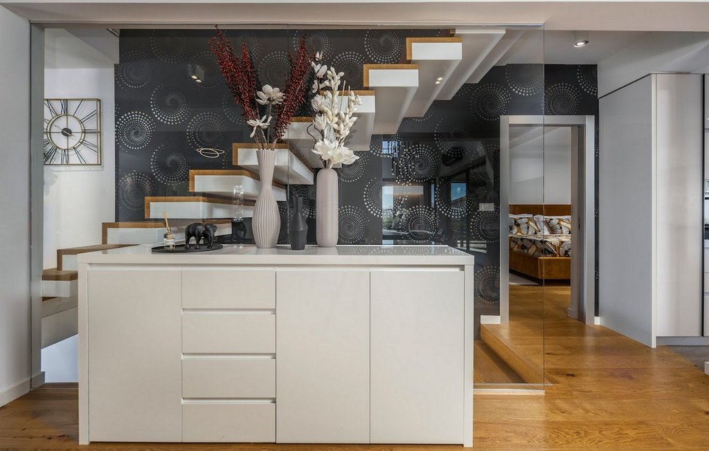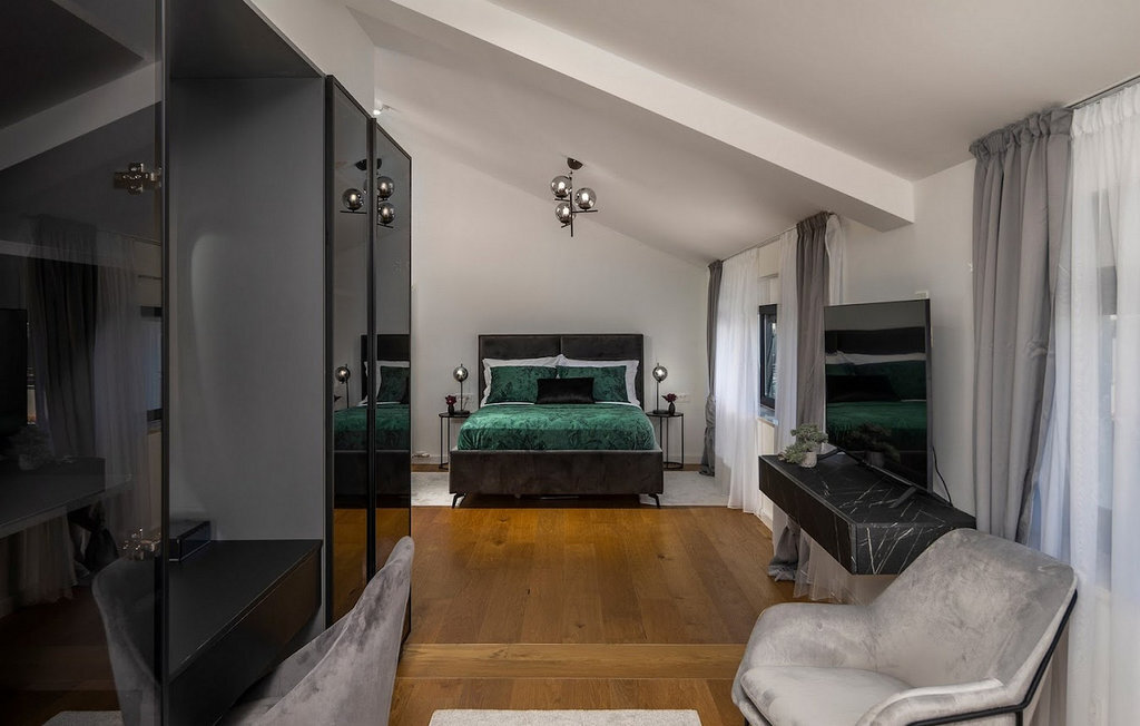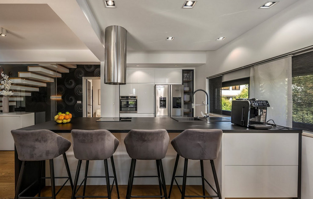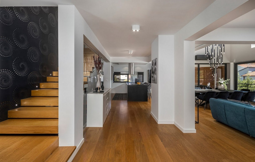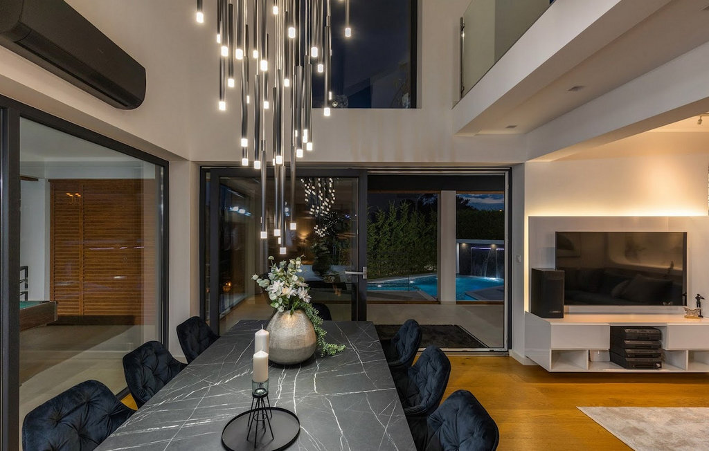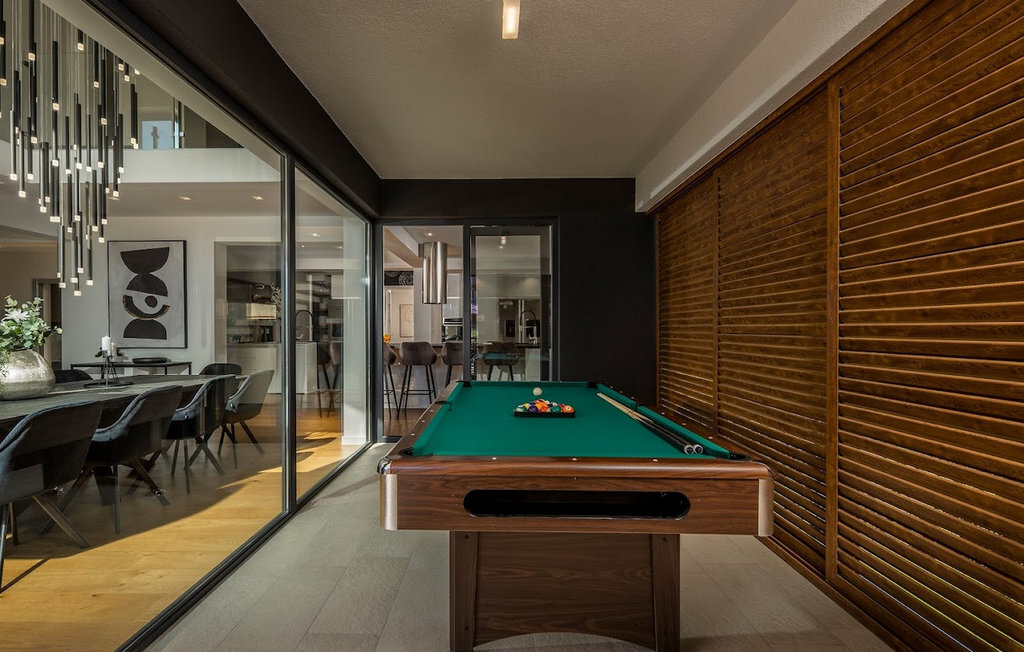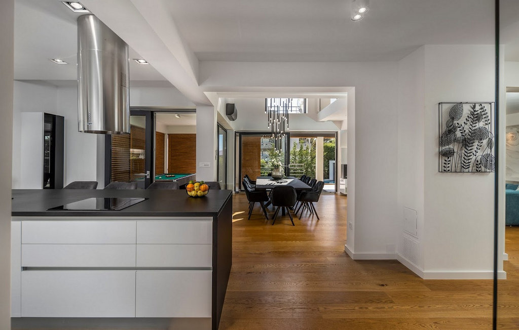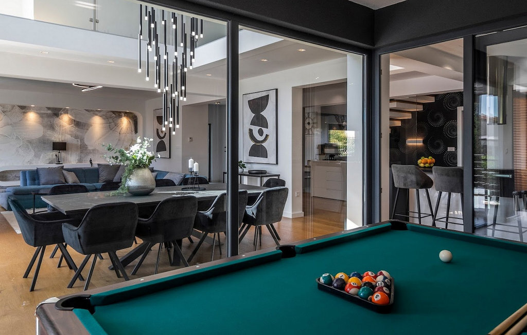 La Villa Bonavia vous accueille dans une ambiance élégante, où des matériaux fins, des lignes claires et des accents artistiques créent un univers de vie exclusif. Profitez d'heures de détente dans le salon spacieux et laissez votre regard se perdre dans les environs verdoyants à travers les grandes baies vitrées. Cuisinez ensemble dans la cuisine élégante et essayez de nouvelles recettes. Jouez de temps en temps au billard et portez ensuite un toast au vainqueur avec un verre de vin.