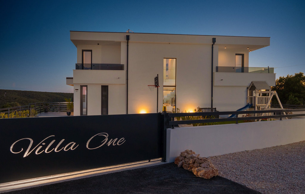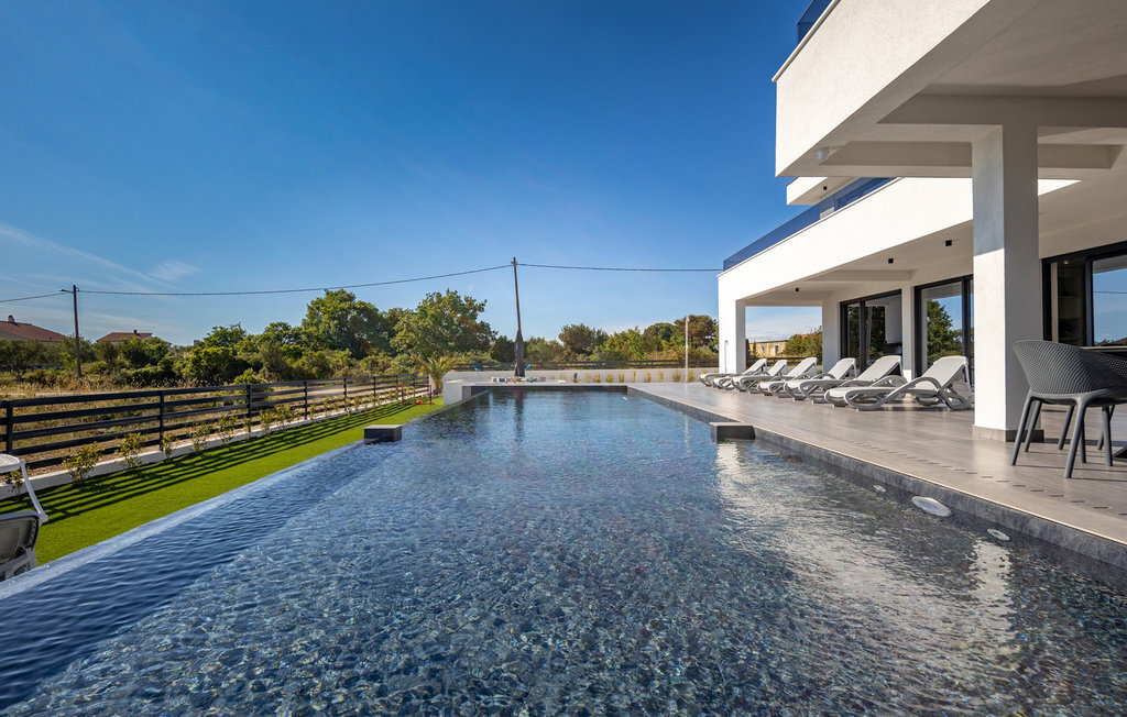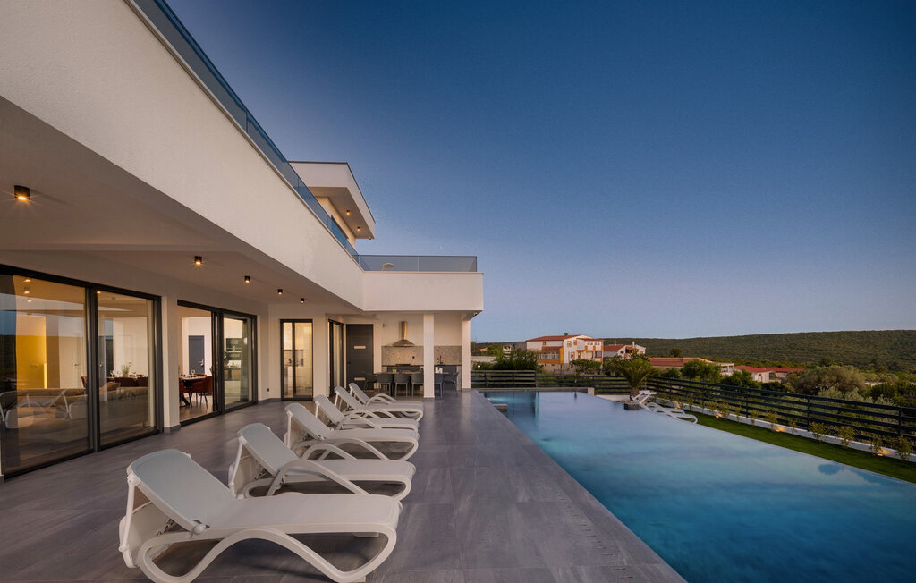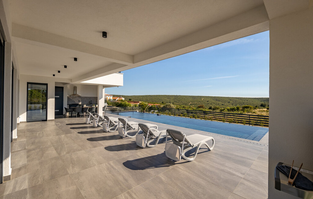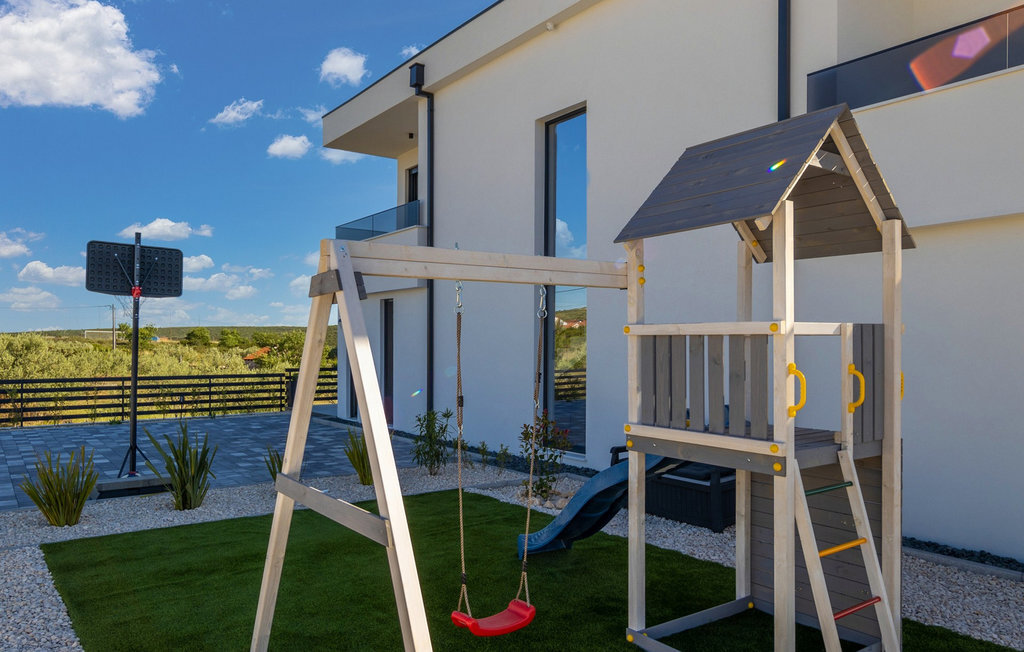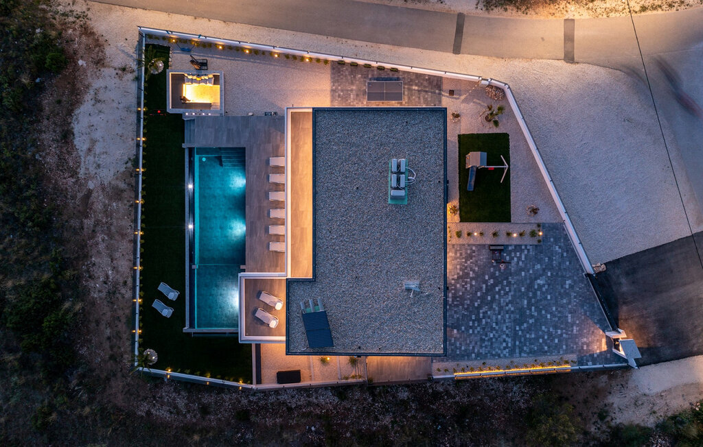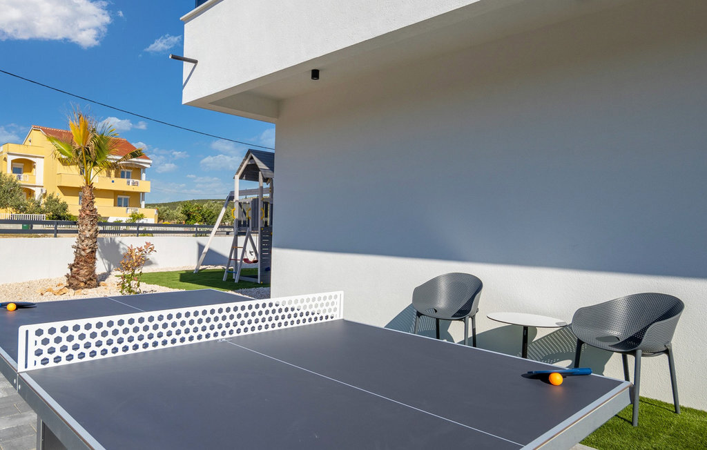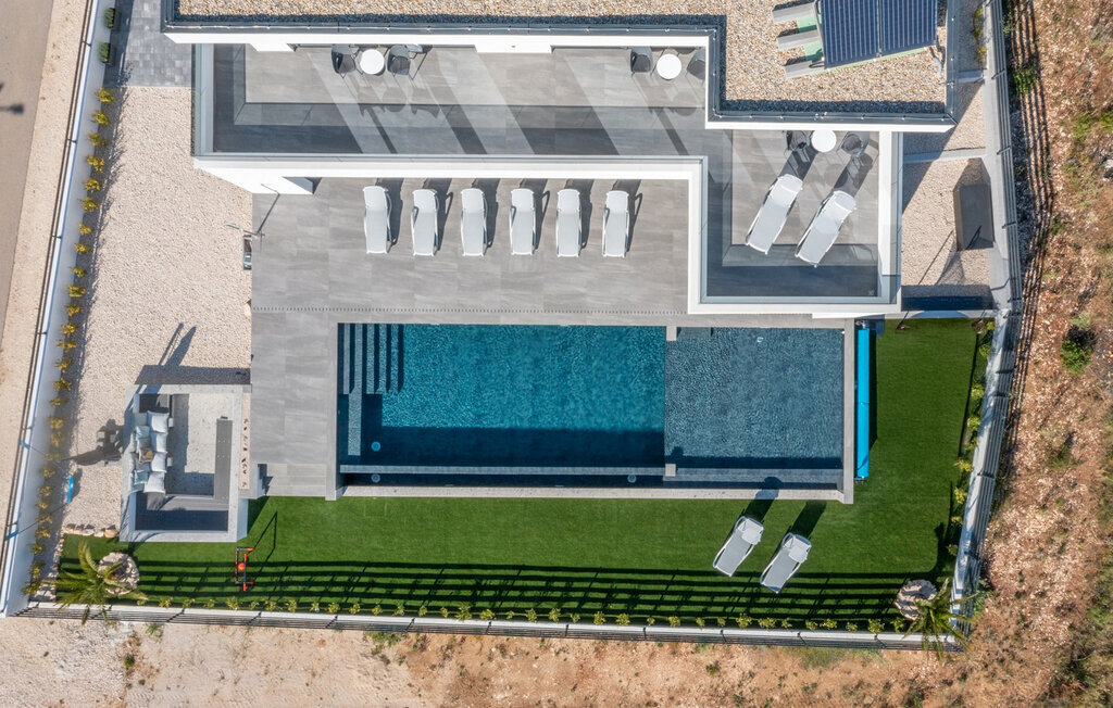 L'élégant espace extérieur est fait pour profiter du magnifique climat de la Croatie à toute heure de la journée. Le matin, faites tranquillement quelques brasses dans la grande piscine avec zone de baignade intégrée, éclairée le soir, laissez l'atmosphère paisible s'emparer de vous en prenant votre petit déjeuner sur la terrasse et détendez-vous sur la chaise longue pendant que les petits s'amusent avec les jeux attrayants. Au coucher du soleil, offrez-vous un verre sur la grande terrasse sur le toit avec vue panoramique jusqu'à la mer et préparez de délicieux accompagnements pour vos soirées barbecue dans la cuisine d'été.