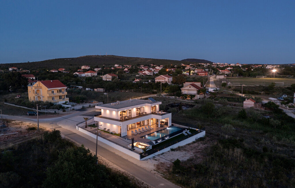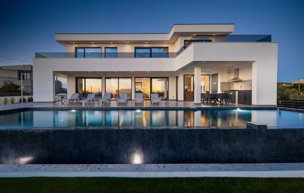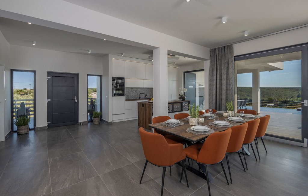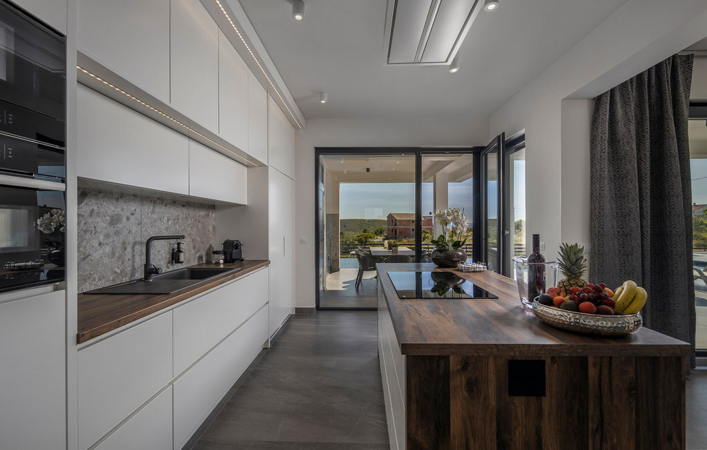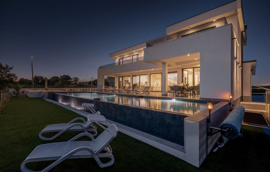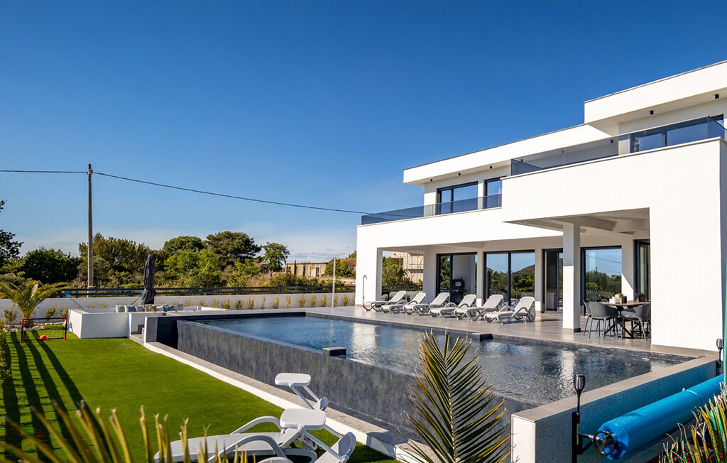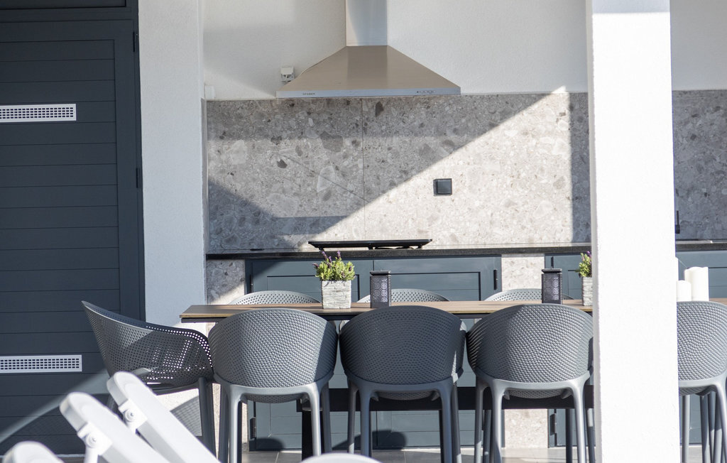 L'élégant espace extérieur est fait pour profiter du magnifique climat de la Croatie à toute heure de la journée. Le matin, faites tranquillement quelques brasses dans la grande piscine avec zone de baignade intégrée, éclairée le soir, laissez l'atmosphère paisible s'emparer de vous en prenant votre petit déjeuner sur la terrasse et détendez-vous sur la chaise longue pendant que les petits s'amusent avec les jeux attrayants. Au coucher du soleil, offrez-vous un verre sur la grande terrasse sur le toit avec vue panoramique jusqu'à la mer et préparez de délicieux accompagnements pour vos soirées barbecue dans la cuisine d'été.