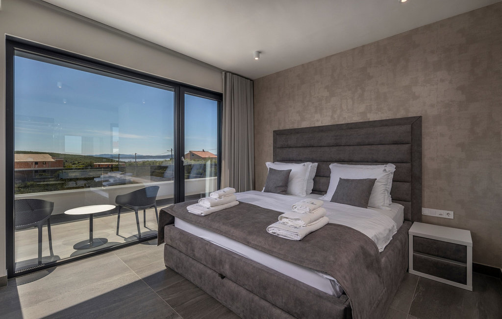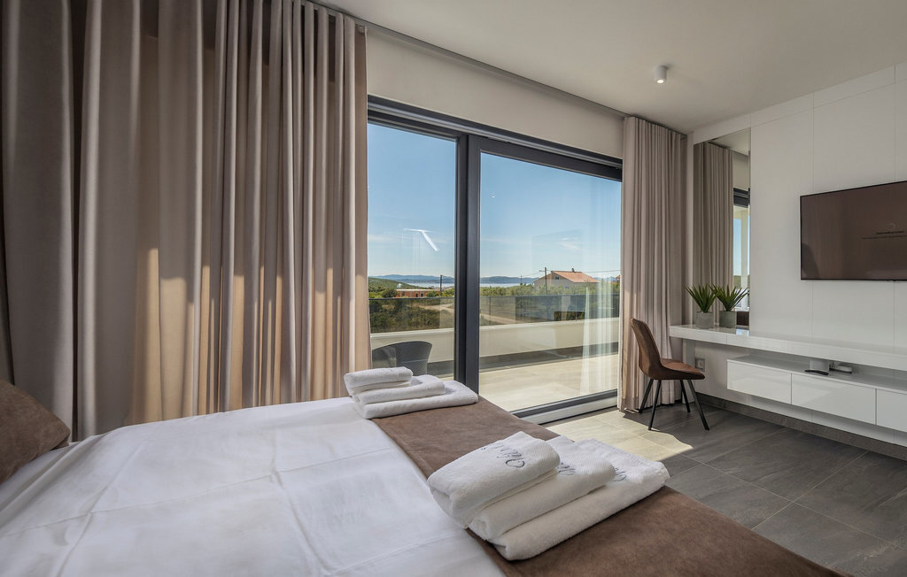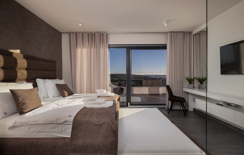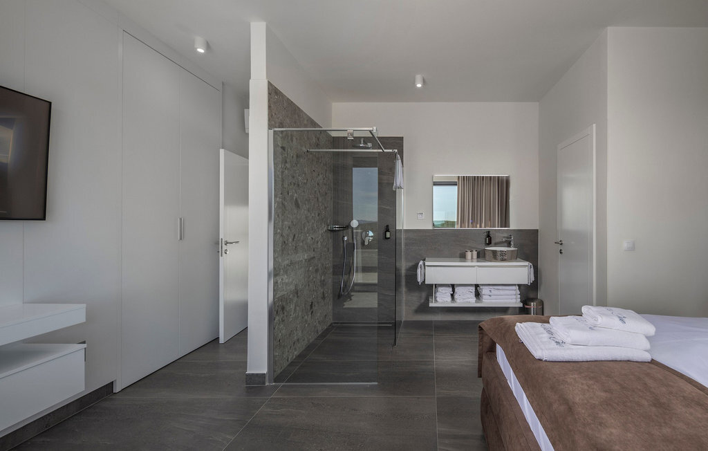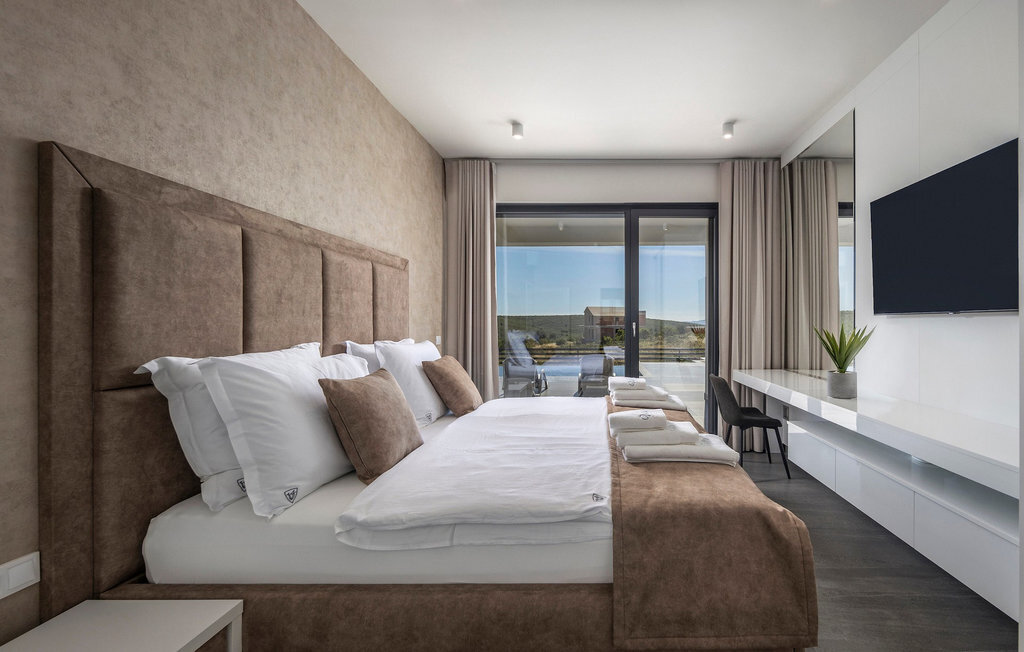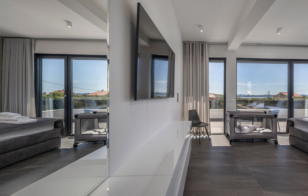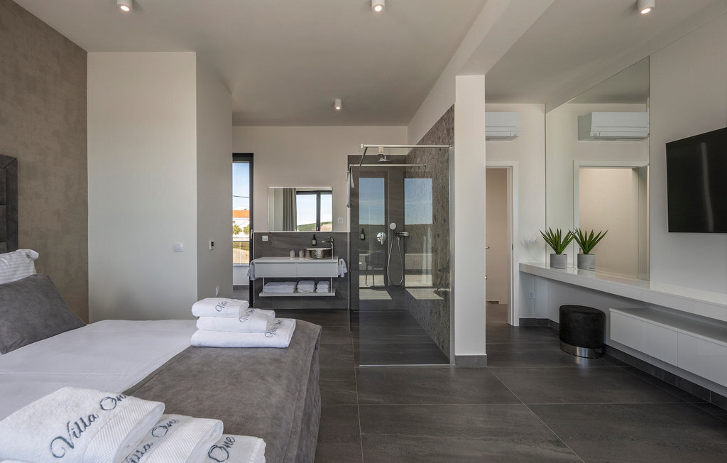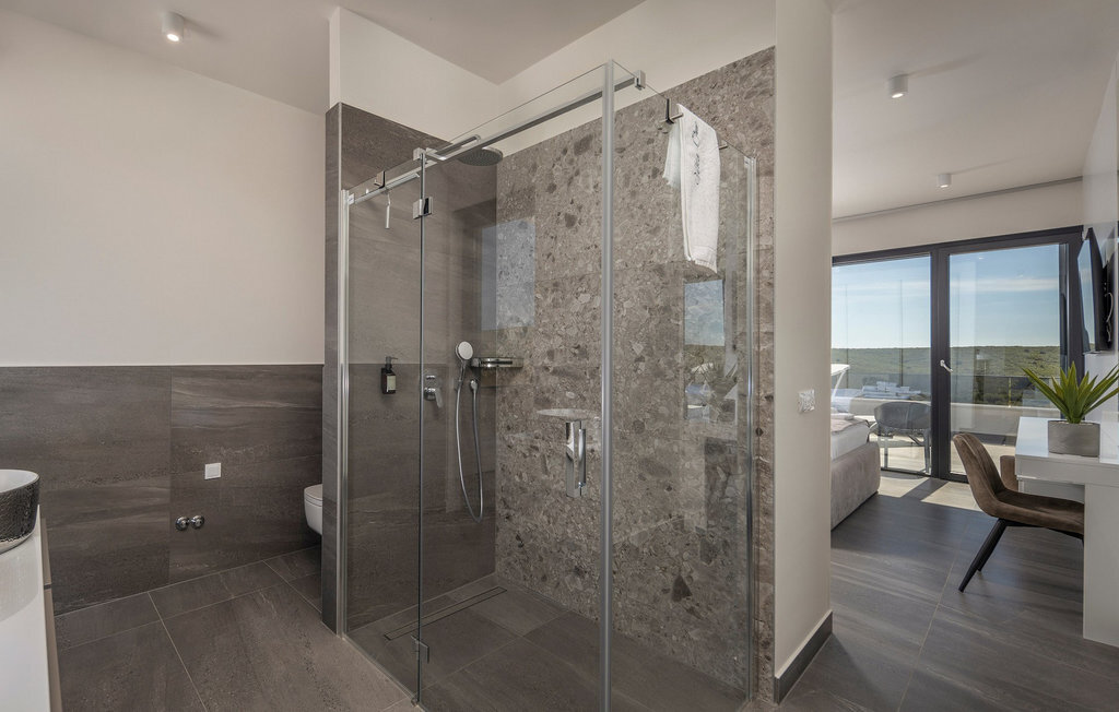 L'élégant espace extérieur est fait pour profiter du magnifique climat de la Croatie à toute heure de la journée. Le matin, faites tranquillement quelques brasses dans la grande piscine avec zone de baignade intégrée, éclairée le soir, laissez l'atmosphère paisible s'emparer de vous en prenant votre petit déjeuner sur la terrasse et détendez-vous sur la chaise longue pendant que les petits s'amusent avec les jeux attrayants. Au coucher du soleil, offrez-vous un verre sur la grande terrasse sur le toit avec vue panoramique jusqu'à la mer et préparez de délicieux accompagnements pour vos soirées barbecue dans la cuisine d'été.