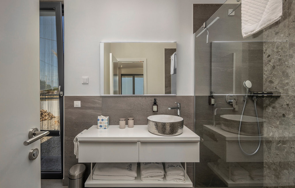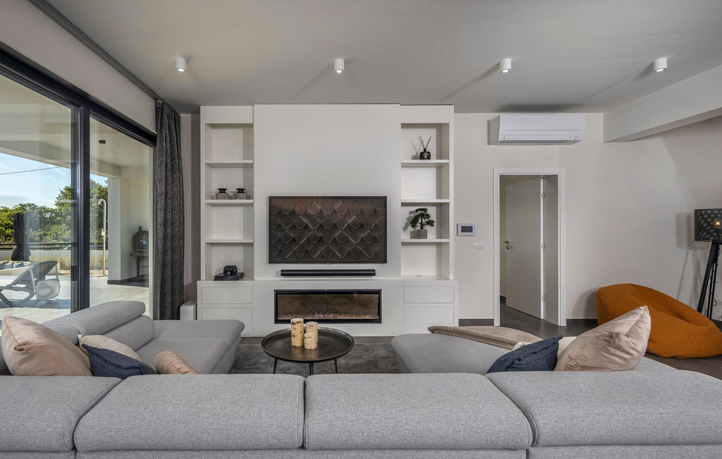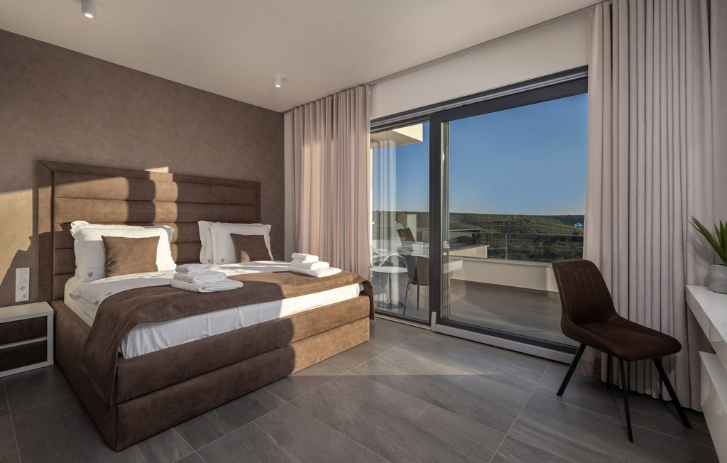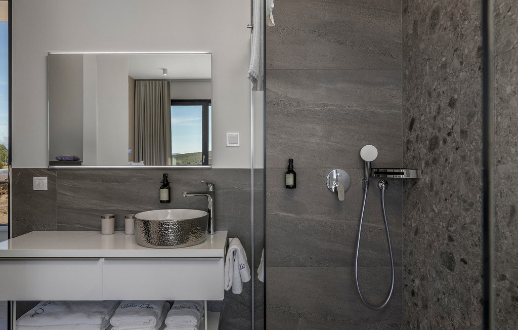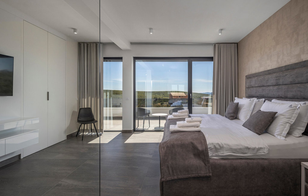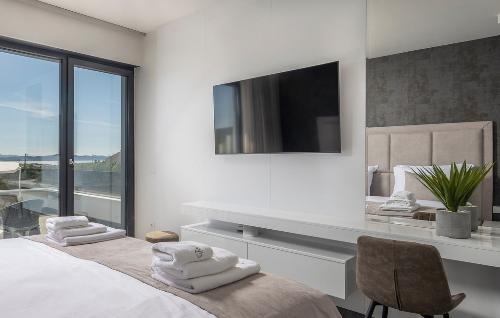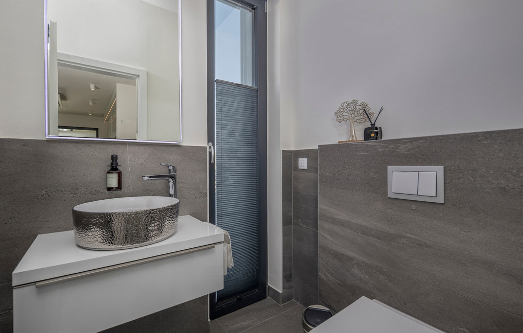 L'élégant espace extérieur est fait pour profiter du magnifique climat de la Croatie à toute heure de la journée. Le matin, faites tranquillement quelques brasses dans la grande piscine avec zone de baignade intégrée, éclairée le soir, laissez l'atmosphère paisible s'emparer de vous en prenant votre petit déjeuner sur la terrasse et détendez-vous sur la chaise longue pendant que les petits s'amusent avec les jeux attrayants. Au coucher du soleil, offrez-vous un verre sur la grande terrasse sur le toit avec vue panoramique jusqu'à la mer et préparez de délicieux accompagnements pour vos soirées barbecue dans la cuisine d'été.
