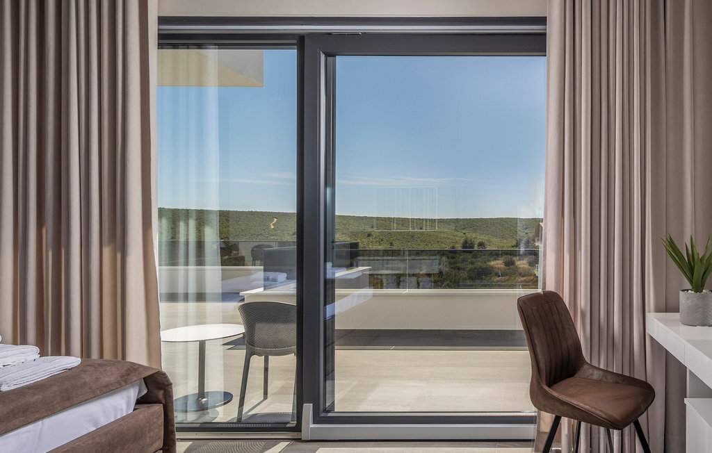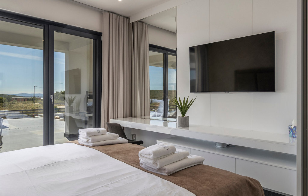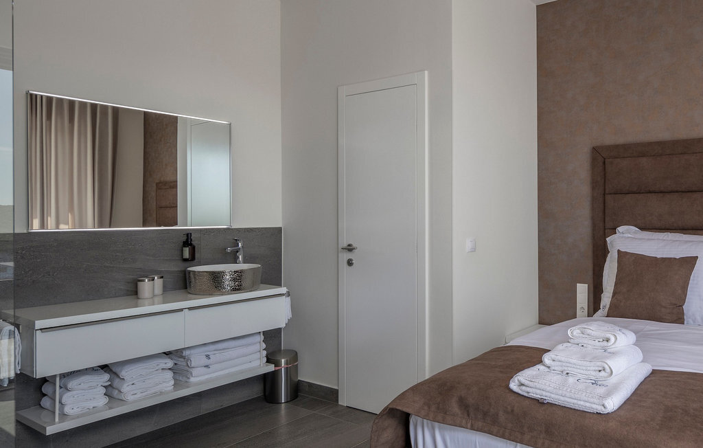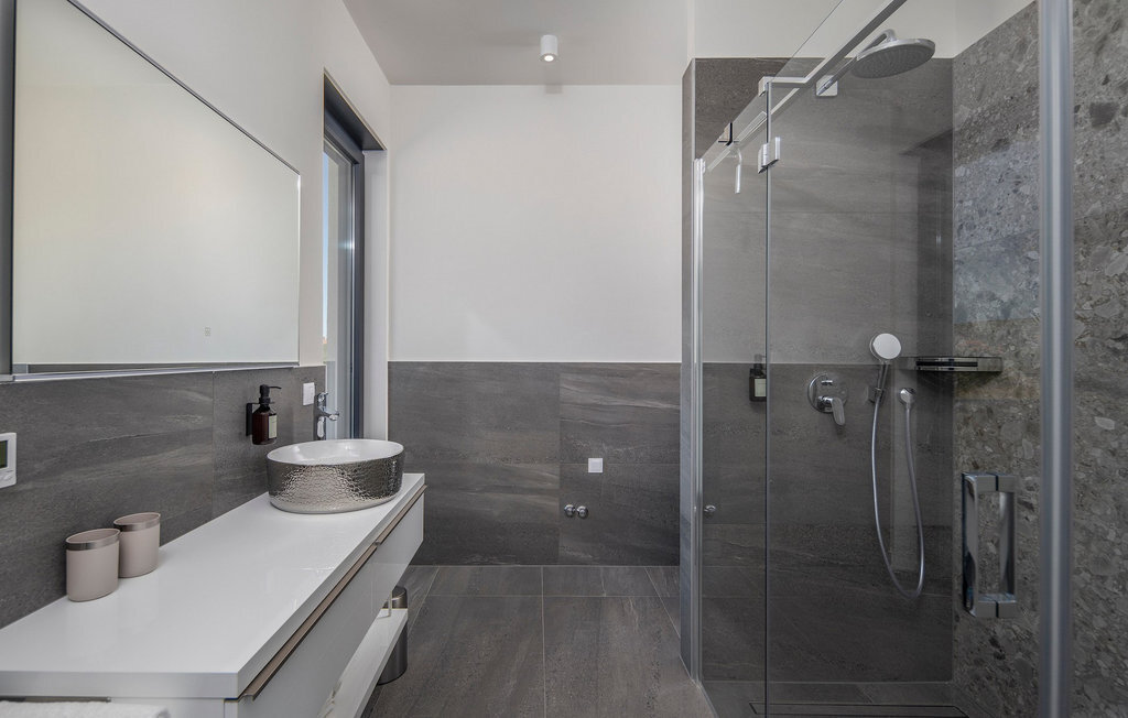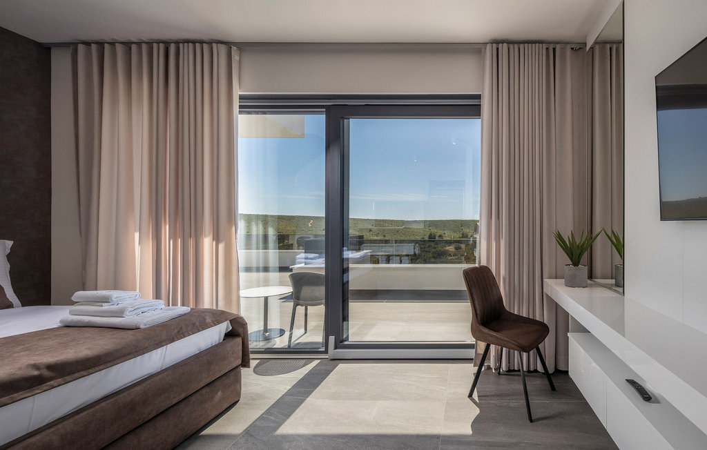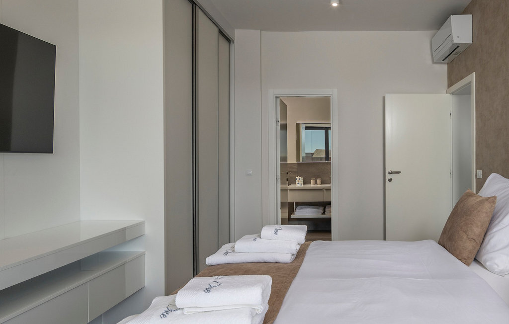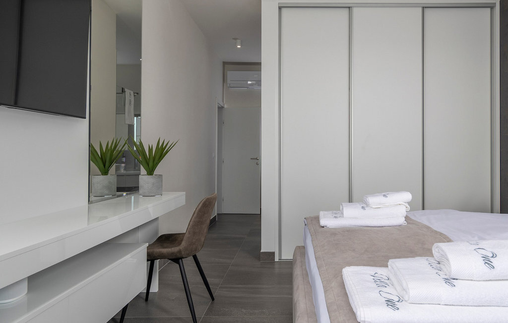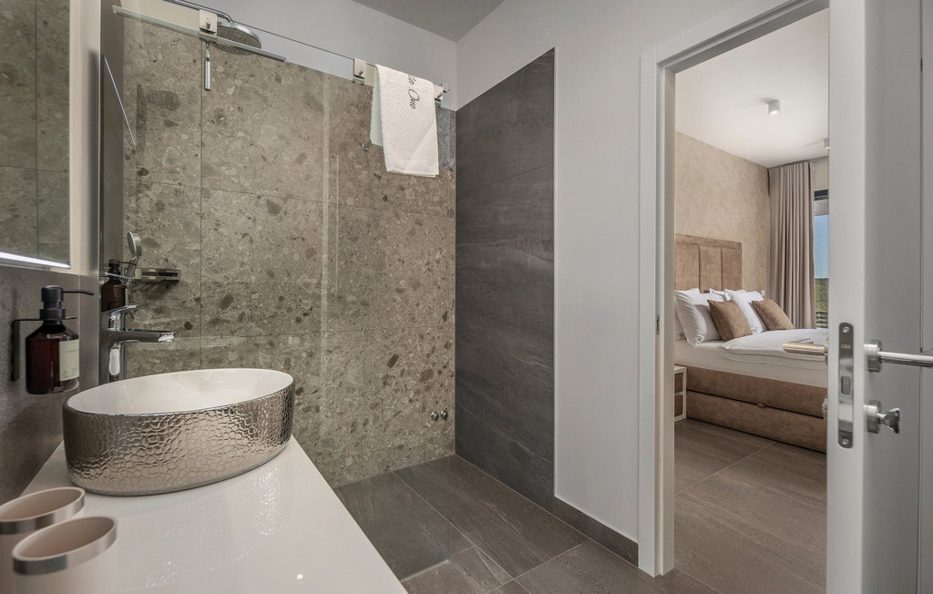 L'élégant espace extérieur est fait pour profiter du magnifique climat de la Croatie à toute heure de la journée. Le matin, faites tranquillement quelques brasses dans la grande piscine avec zone de baignade intégrée, éclairée le soir, laissez l'atmosphère paisible s'emparer de vous en prenant votre petit déjeuner sur la terrasse et détendez-vous sur la chaise longue pendant que les petits s'amusent avec les jeux attrayants. Au coucher du soleil, offrez-vous un verre sur la grande terrasse sur le toit avec vue panoramique jusqu'à la mer et préparez de délicieux accompagnements pour vos soirées barbecue dans la cuisine d'été.