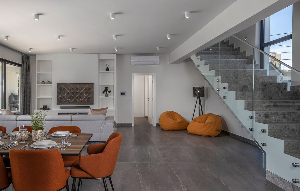 La spacieuse Villa One Zadar gâte les hôtes de tous âges avec de charmants extras et vous accueille dans un intérieur clair et aménagé avec style. Le concept d'habitation ouvert fait des vacances en famille nombreuse ou avec un groupe d'amis un moment de détente. Créez des spécialités culinaires dans la cuisine bien équipée, savourez des repas harmonieux autour de la table à manger accueillante et amusez-vous sur la PlayStation ou la table de baby-foot ou écoutez de la musique en discutant du temps passé sur le canapé confortable.