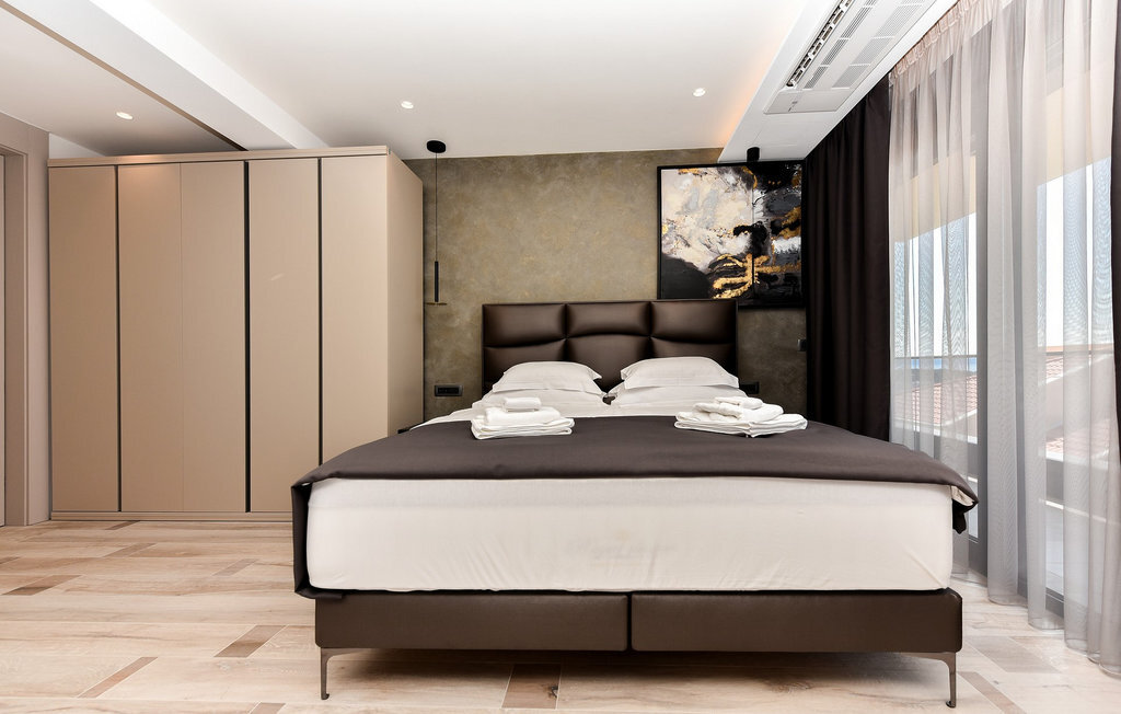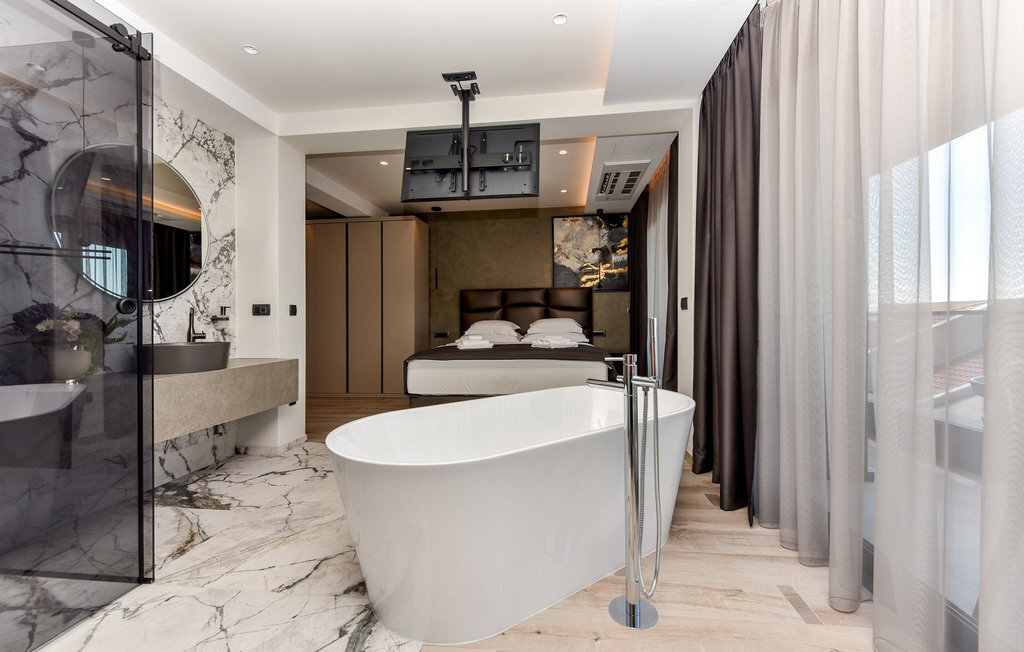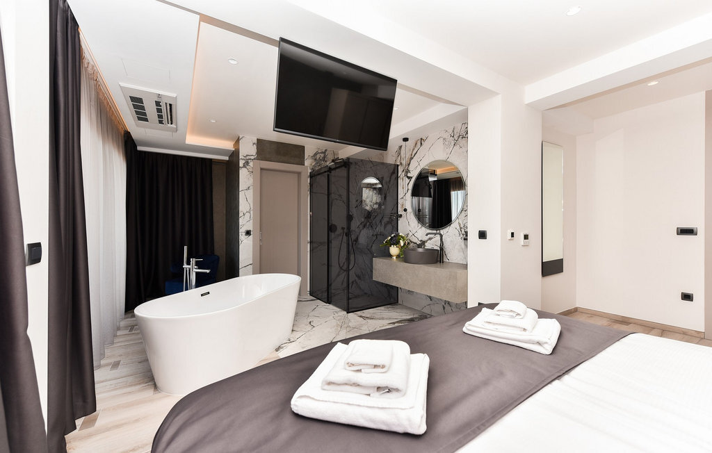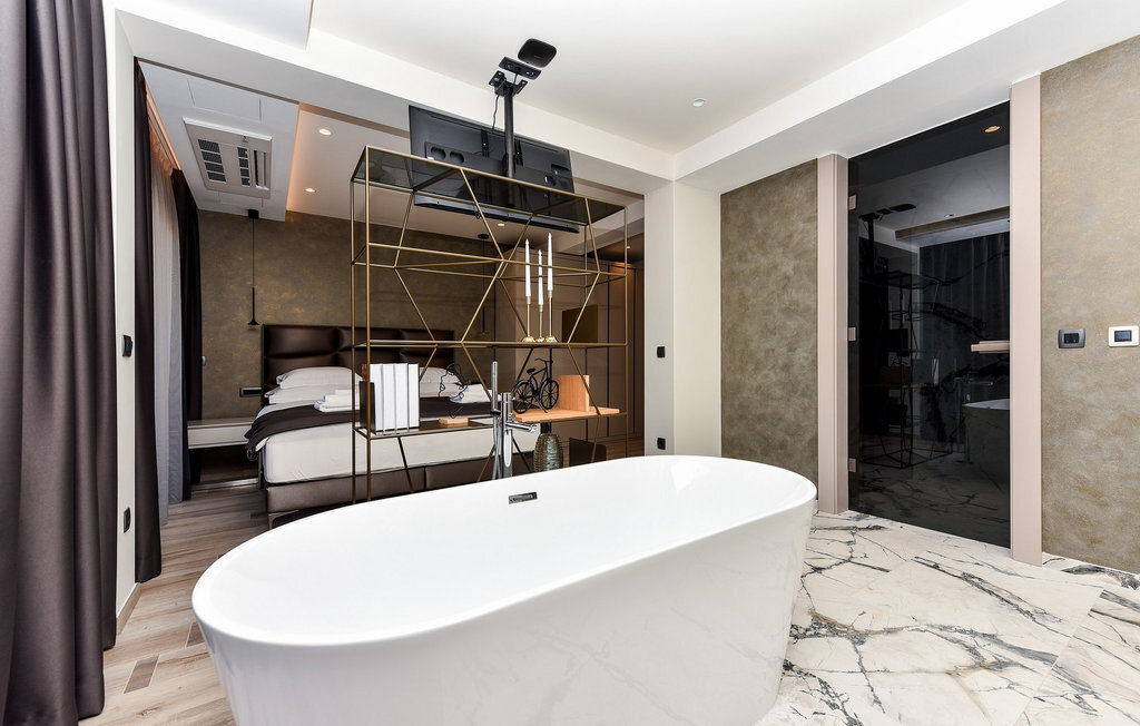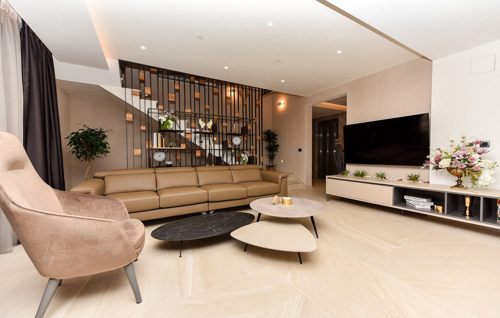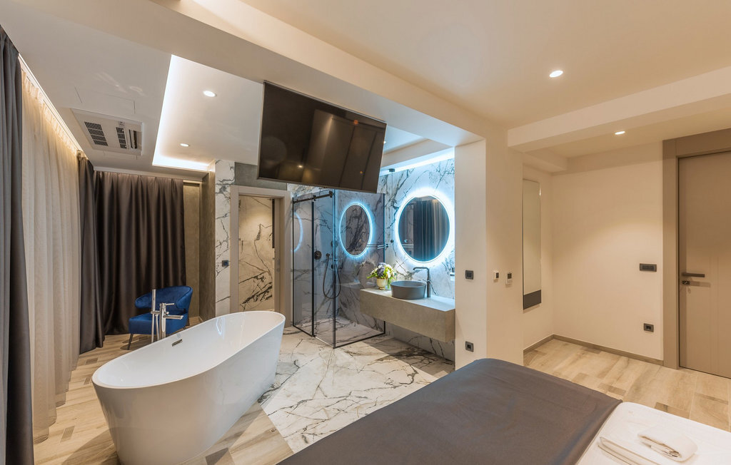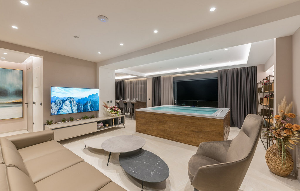 La villa Horatia séduit par son atmosphère moderne, où les couleurs chaudes, les matériaux nobles et l'éclairage stylé créent un sentiment de calme et d'élégance. Détendez-vous dans le salon confortable en bavardant, en lisant ou en regardant un film ensemble. Le jacuzzi invite au bien-être et à la détente, idéal pour terminer la journée en beauté. Dans la cuisine bien équipée, vous pouvez cuisiner ensemble et prendre vos repas en toute convivialité autour de la grande table. Le soir, la pièce se transforme en un lieu de pur confort grâce à un éclairage doux.