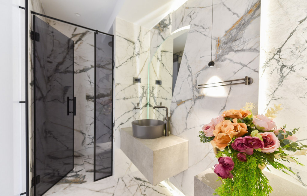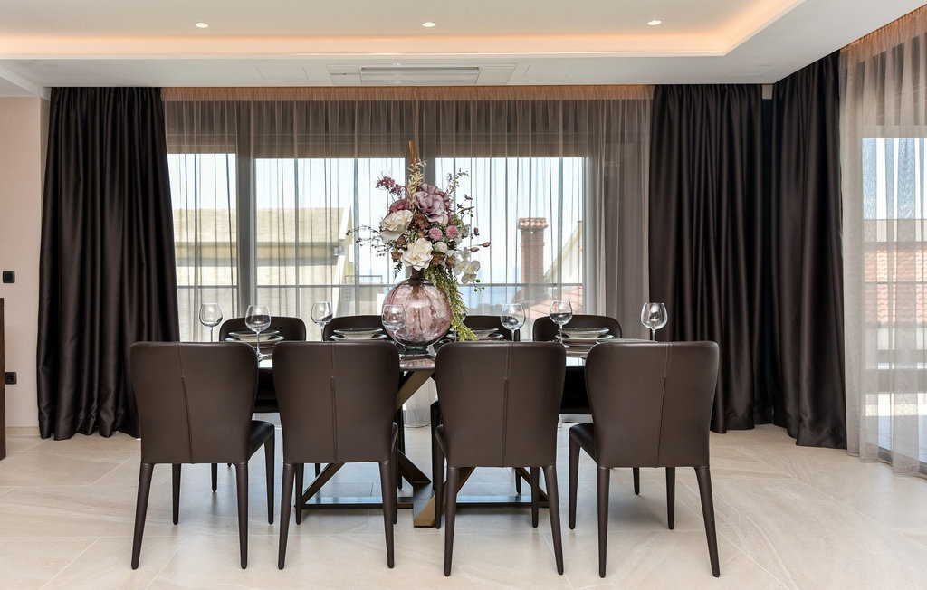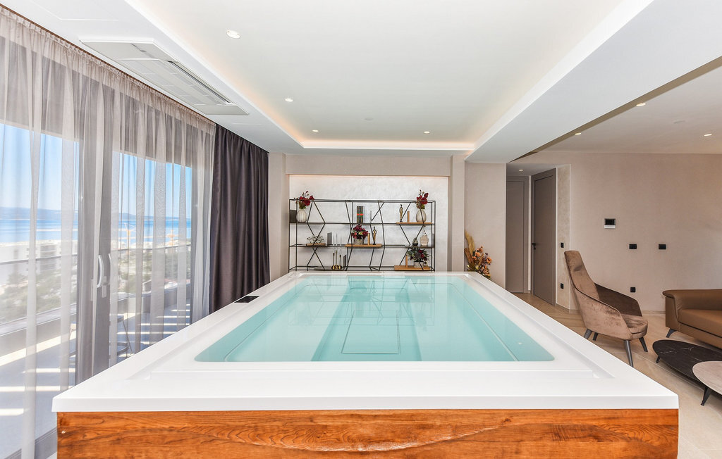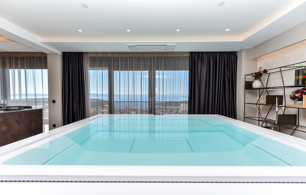 Le matin, plongez dans la piscine et faites quelques brasses tout en profitant de la vue imprenable sur la mer et les montagnes. Détendez-vous sur les chaises longues élégantes en sirotant une boisson rafraîchissante ou passez des heures agréables dans le salon couvert. La salle à manger avec barbecue offre une belle coulisse pour des repas en commun sous le ciel étoilé. Le soir, la lumière d'ambiance plonge la terrasse dans une atmosphère chaleureuse idéale pour terminer la journée en toute tranquillité.