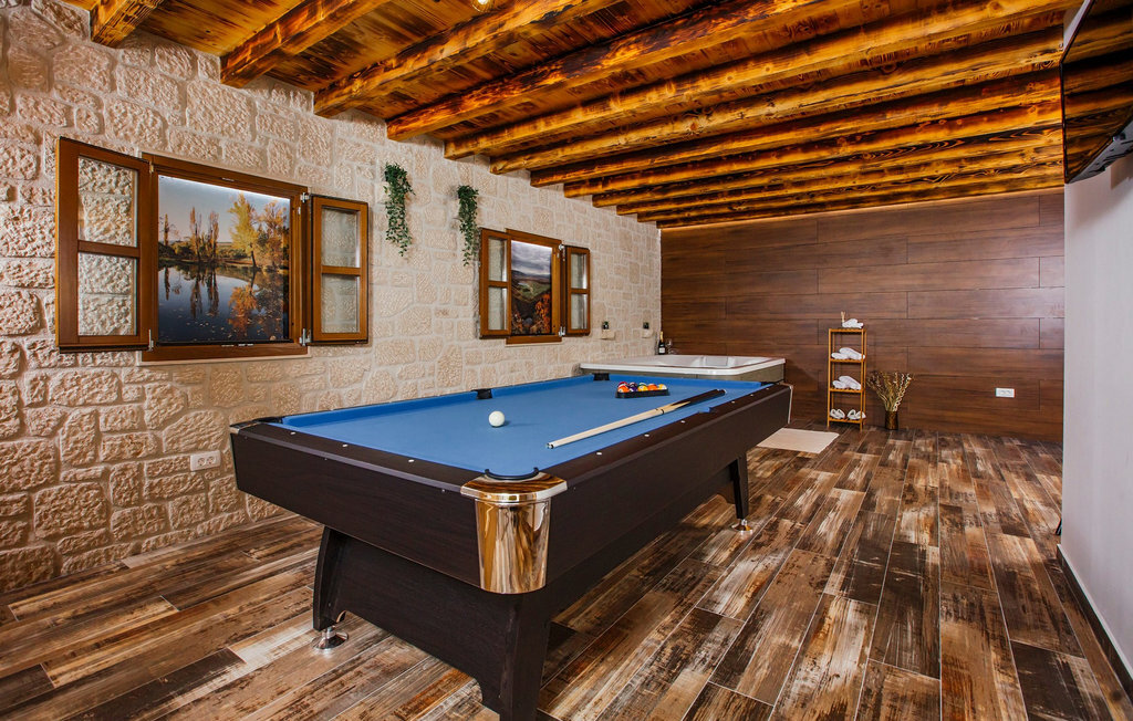 La magnifique villa rustique Imota se trouve dans la petite ville de Gornji Prolo?ac, à seulement 8,7 km de la ville d'Imotski. Imotski est célèbre pour ses lacs Bleu et Rouge, mais dispose également d'un riche patrimoine culturel en plus de sa beauté naturelle. Cette villa est idéale pour de vraies vacances, où vous pourrez vous ressourcer et vous détendre en compagnie de votre famille et de vos amis. La villa a été construite en 2020 et séduit au premier coup d'œil par son style rustique qui, combiné à des détails modernes, en fait un véritable lieu de vacances idyllique. Vous disposez de 200 m2 de surface habitable, la surface totale du terrain étant de 600 m2. Il s'agit de deux bâtiments pouvant accueillir au maximum 9 personnes ensemble, qui se répartiront dans 5 chambres à l'étage, quatre chambres disposant d'un lit double (160x200) et une chambre d'un lit simple (90x200). La villa dispose également de 3 salles de bains avec cabine de douche. Dans les deux cuisines entièrement équipées, vous préparerez des repas pour la famille et les amis, et dans les deux salons, vous vous détendrez sur le canapé, qui dispose également d'une télévision, d'une commode et de fauteuils. Dans la salle à manger, il y a une table de 10 places. Dans la pièce centrale du petit bâtiment, il y a aussi une pièce avec une cheminée intérieure, une table et des chaises. Une pièce avec sauna assure une détente totale. Pour se divertir, une piscine pour enfants et un toboggan sont à disposition, tandis que les adultes peuvent jouer aux fléchettes, au billard ou au baby-foot. La terrasse extérieure offre plus qu'assez d'espace pour se réunir et se divertir, et il y a aussi une piscine chauffée de 36 m2 et d'une profondeur de 1,5 mètre. L'équipement supplémentaire de la piscine est un jacuzzi. À côté de la piscine, il y a 6 chaises longues pour prendre le soleil, une table à manger extérieure et vous pouvez également utiliser un barbecue au charbon ou au bois à l'extérieur. Parmi les autres équipements à votre disposition, vous trouverez une machine à laver et un fer à repasser. La villa est clôturée et offre deux places de parking privées, tandis qu'il y a trois autres places de parking à l'extérieur de la cour. Parmi les choses intéressantes à Imotski, il y a la possibilité de se baigner dans le lac Bleu et, en été, le lac peut même s'assécher, ce qui permet de jouer au football au fond. Au-dessus du lac Bleu se trouve également la forteresse de Topana, qui date du 10e siècle et a été habitée jusqu'au 19e siècle. Le lac rouge, qui doit son nom à la couleur des rochers qui l'entourent, est également connu. La ville d'Imotski est pleine de maisons en pierre et d'escaliers qui relient l'ancienne et la nouvelle partie de la ville. *Un confort particulier pour les hôtes est le fait qu'il y a aussi un restaurant de produits locaux sur la propriété et la possibilité de goûter aux délices de cette région. Le service de livraison de nourriture par concierge à la villa est également offert gratuitement. *Les hôtes reçoivent un cadeau de bienvenue de la part de l'hôte avec des produits locaux. Bienvenue à la villa rustique Imota !