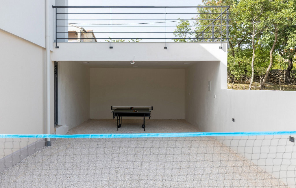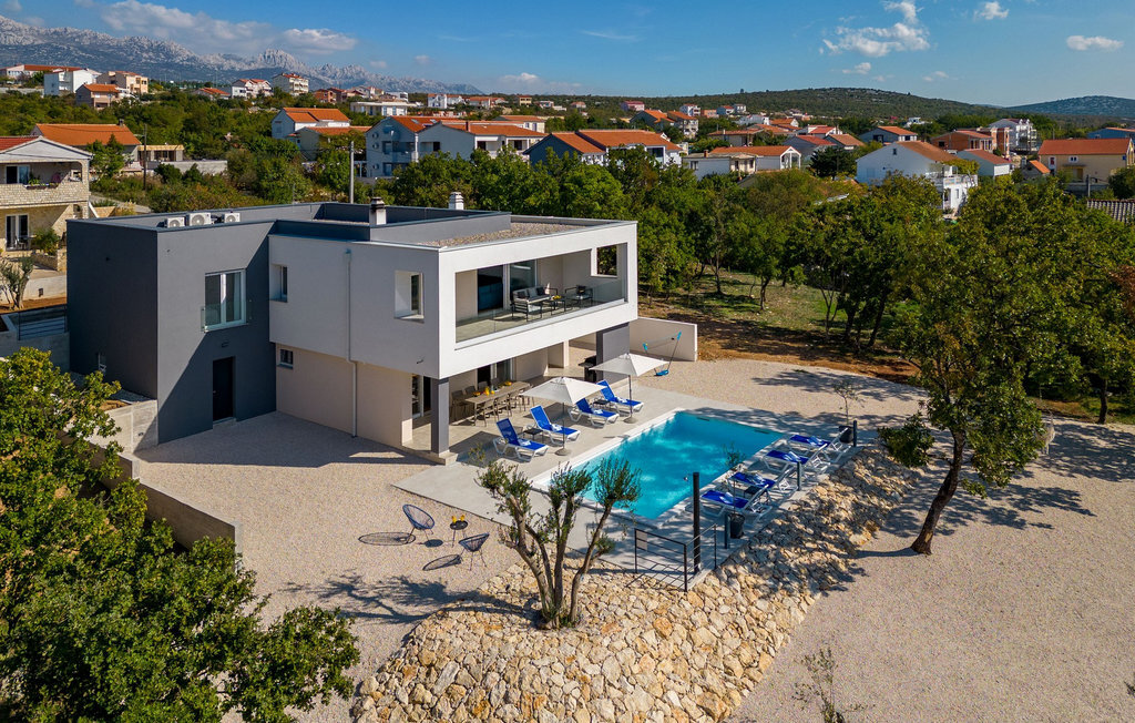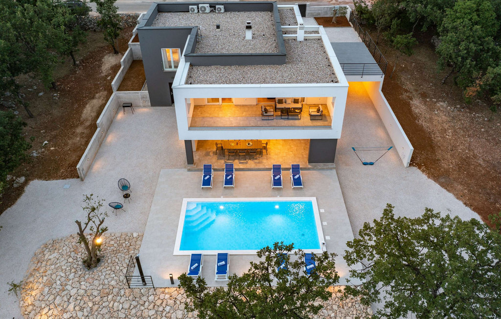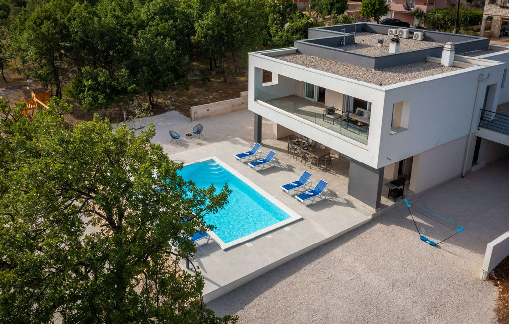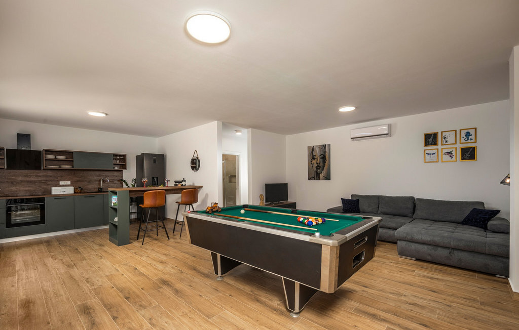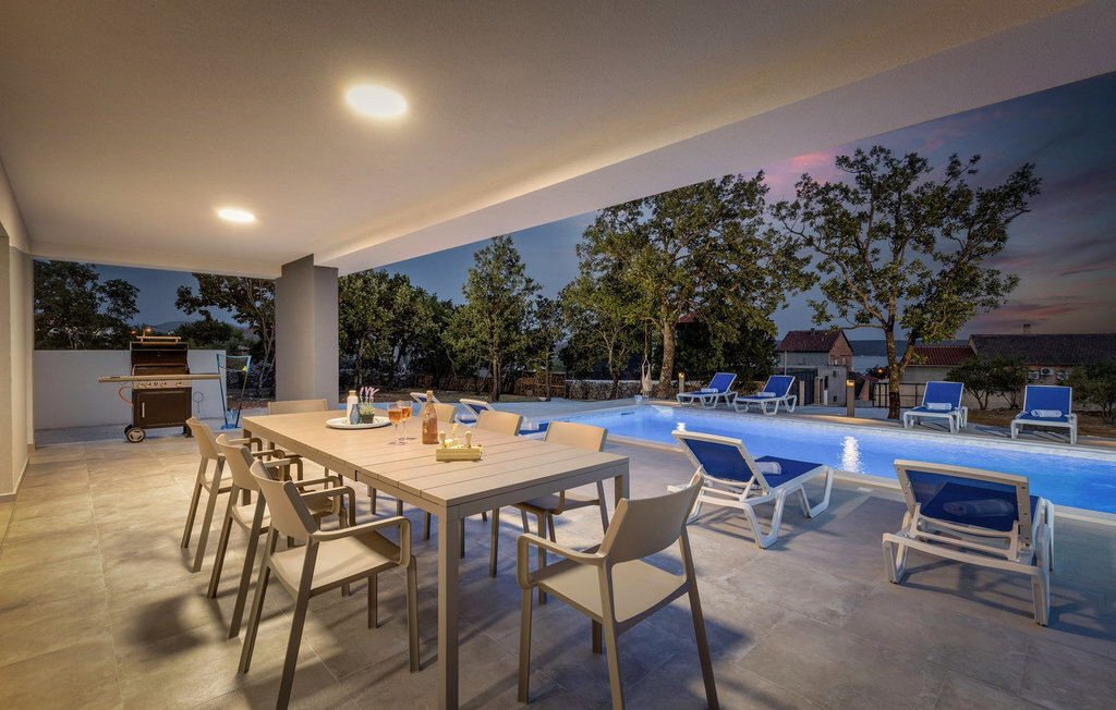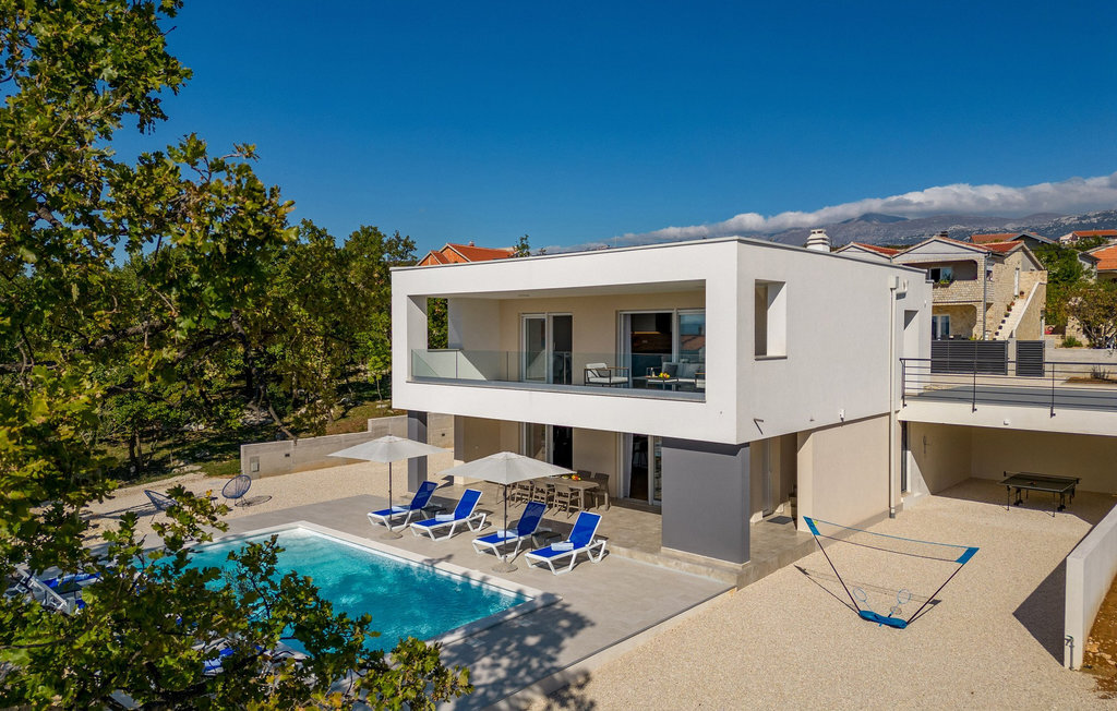 La magnifique villa Deep Green est située à Maslenica, à 28 km de la ville historique de Zadar. Cette villa confortable se trouve à 600 mètres de la côte et surplombe la mer. Elle vous offre les vacances parfaites de vos rêves, que vous veniez en famille ou avec un groupe de vos meilleurs amis. Échappez à l'agitation de la vie quotidienne et offrez-vous des vacances paisibles et heureuses ! La villa Deep Green a été construite dans un style architectural contemporain et offre à ses hôtes 260 m2 de surface habitable, tandis que la superficie totale du terrain est de 10.000 m2. La ferme dispose d'une oliveraie aménagée, entourée d'une forêt de chênes et d'une prairie. Comme elle se trouve à proximité d'une mer propre et claire, vous avez la possibilité de plonger dans les profondeurs de la mer et de prendre un bain de soleil. La villa est entièrement climatisée et peut accueillir un maximum de 8 personnes, idéalement 6, et se compose d'un rez-de-chaussée et d'un étage. Le rez-de-chaussée comprend une cuisine moderne et équipée où vous pourrez préparer des repas pour toute la famille, ainsi qu'un salon spacieux avec un canapé d'angle, une table basse et une télévision. Dans la salle à manger, il y a une table à manger avec 8 places assises. Au rez-de-chaussée, il y a également une salle de bain avec cabine de douche et une terrasse avec des sièges où vous pouvez prendre votre café du matin. À l'étage supérieur, vous trouverez un autre salon et une salle à manger, deux salles de bains avec douche et trois chambres. Dans deux chambres, il y a un lit double (160x200) et dans la troisième, il y a 2 lits simples (90x200) qui peuvent être réunis pour former un lit double. La terrasse extérieure vous ravira avec sa piscine de 32 m² et de 1,5 m de profondeur. À côté, il y a 8 chaises longues pour prendre le soleil et un barbecue à gaz, à charbon ou à bois à l'extérieur. Vous pourrez déguster des plats préparés sur le barbecue autour de la table à manger extérieure couverte pour 8 personnes. Parmi les autres équipements qui vous seront utiles pendant votre séjour, vous trouverez une machine à laver et un fer à repasser. En outre, la villa dispose de toilettes séparées. En cas de besoin, le canapé sert de lit supplémentaire pour deux personnes. La cour intérieure de la Villa Deep Green est entièrement clôturée et vous offre 3 places de parking privées, ainsi que 2 places supplémentaires à l'extérieur. Les enfants seront ravis du parc pour enfants, où ils pourront jouer et s'amuser sur le toboggan et les balançoires. Dans la villa, tout le monde peut jouer aux fléchettes, au ping-pong, au badminton et au billard. Pour ceux qui souhaitent profiter d'une belle nature intacte, le parc national de Paklenica, Starigrad, les gorges de la rivière Zrmanja et la célèbre et remarquable Pari?evacka glavica, dont le lieu de tournage a été utilisé pour le film Winetou, se trouvent à proximité de la villa. Dans les environs de Maslenica, il y a de nombreux endroits intéressants pour se divertir en été, et pour ceux qui souhaitent profiter de promenades romantiques et explorer des antiquités historiques, la ville royale de Nin, dont les rues portent encore les traces des temps passés, se trouve à proximité. Ne manquez pas de visiter l'église St. Kri?a, la plus petite cathédrale du monde, dont l'architecture particulière s'adapte au rythme naturel des saisons. La Dalmatie est également connue pour son excellente offre gastronomique, riche en poissons frais, fruits de mer et huile d'olive. Visitez l'une des authentiques tavernes dalmates dans les petites villes de la côte et découvrez tout le charme de la cuisine dalmate de première classe. Bienvenue à la Villa Deep Green !