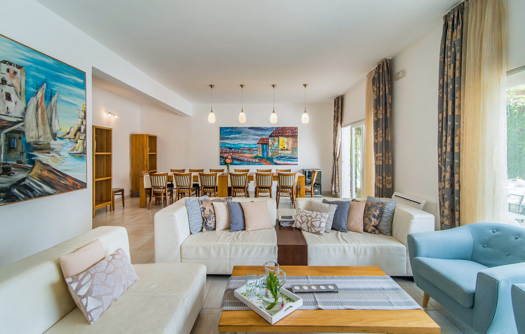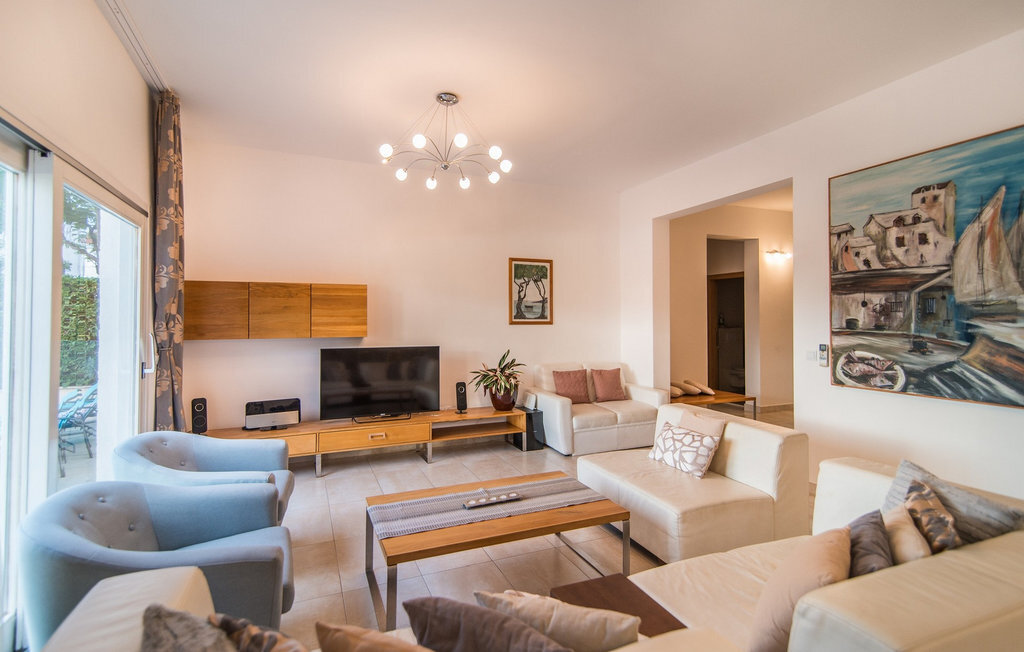 La Villa Mirca vous accueille avec un concept d'espace généreux, idéalement adapté à des vacances avec de nombreux invités. Les espaces de vie lumineux avec des canapés confortables invitent à la détente, à la discussion ou à des soirées de jeux conviviales. Chacun trouve sa place autour de la grande table à manger, de sorte que les repas pris en commun dans une atmosphère élégante deviennent un moment fort de la journée. La cuisine moderne offre toutes les possibilités pour cuisiner ensemble d'excellents plats. Et si vous souhaitez rester en forme pendant vos vacances, vous pouvez utiliser la salle de sport moderne et bien équipée.